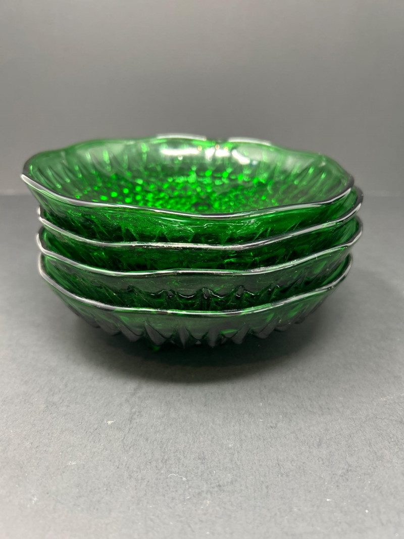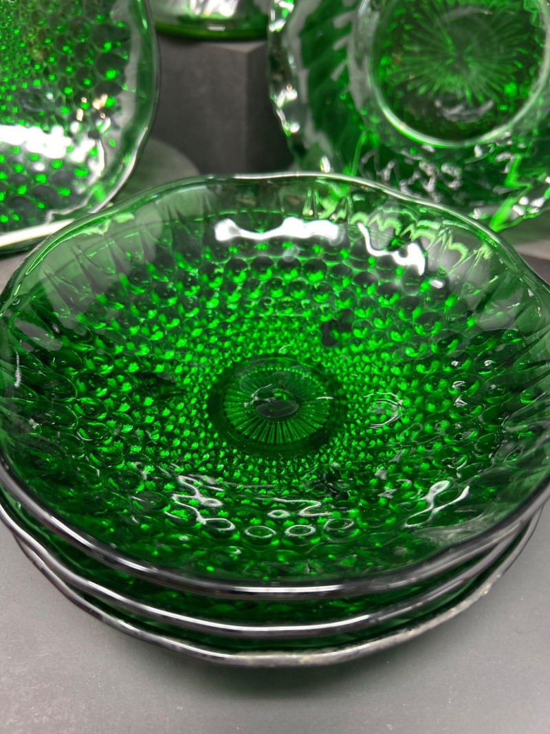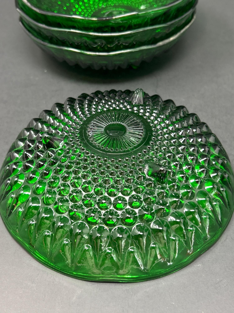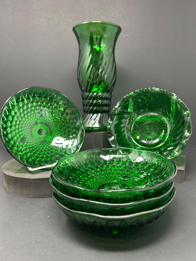 A luminous collection of mid-century Forest Green pressed glass by Anchor Hocking and E.O. Brody Co., including four Hobnail bowls, a Diamond Swirl scalloped bowl, and a tall Swirl vase. Together, they capture the enduring elegance of 1940s–1960s American glass design — vivid emerald tones, geometric texture, and fine molded craftsmanship. Anchor Hocking Hobnail Bowls (Set of 4) Anchor Hocking Scalloped “Diamond Swirl” Bowl E.O. Brody Co. Swirl VaseItem Details: