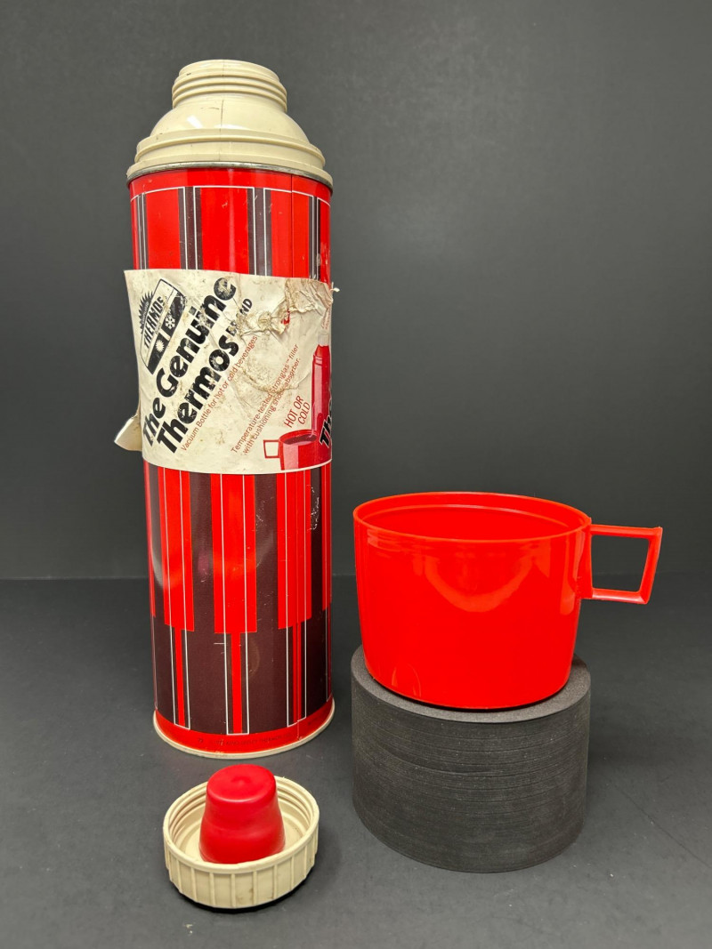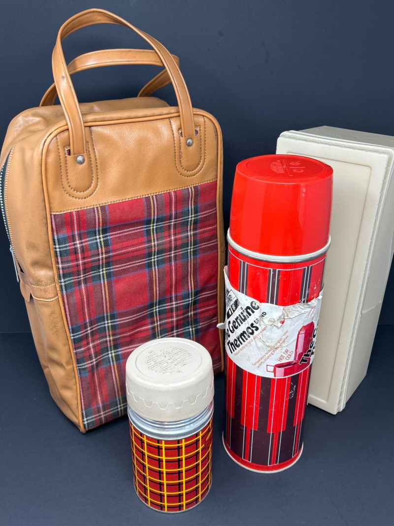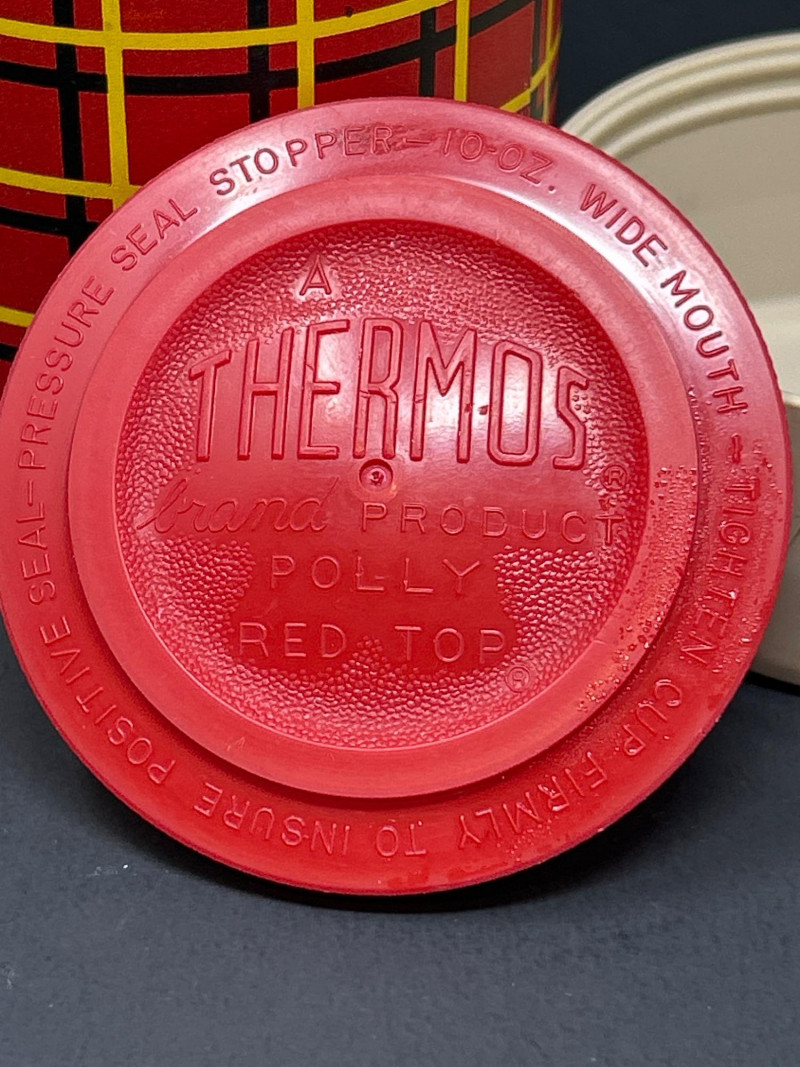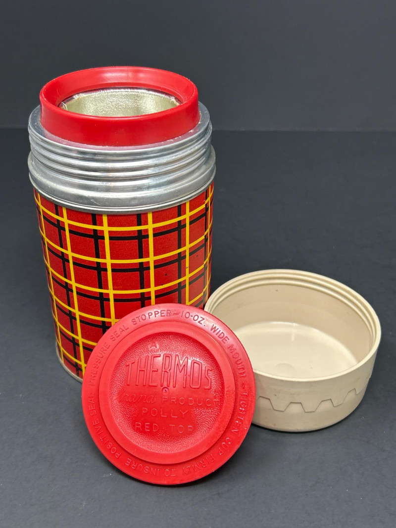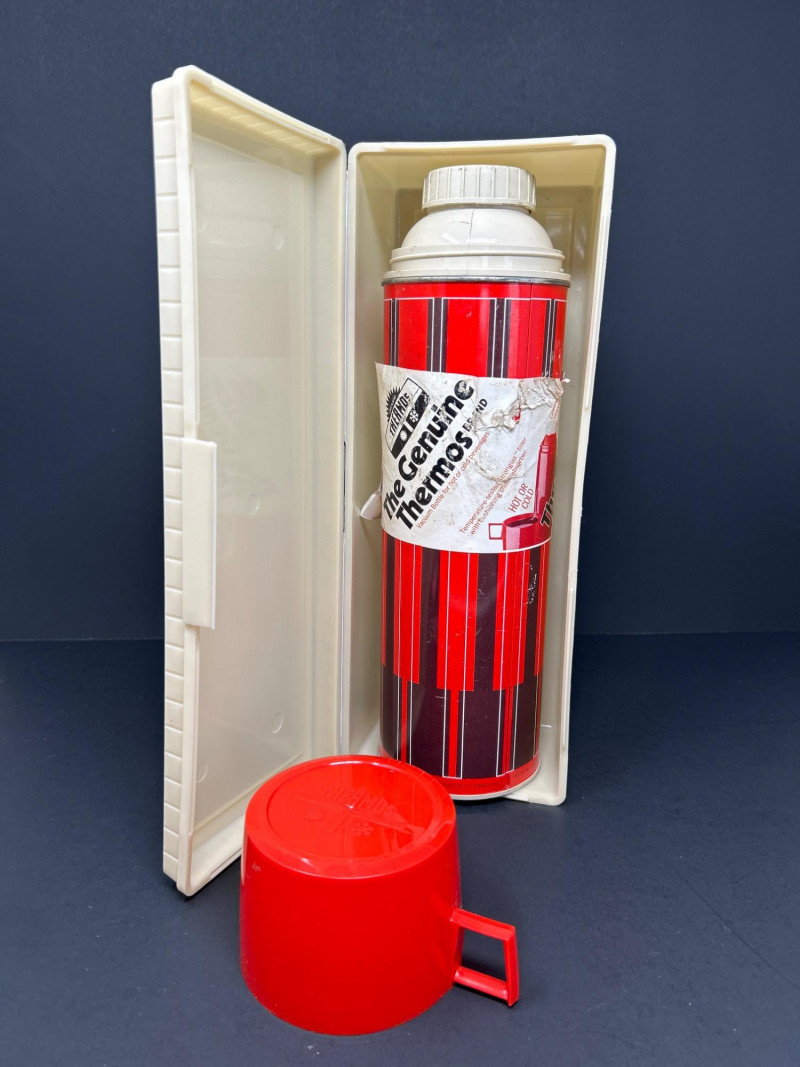 A vibrant vintage 1971 King-Seeley Thermos Co. vacuum bottle in the iconic red-and-black vertical stripe pattern. This original “The Genuine Thermos” brand bottle features its Polly Red-Top pressure-seal stopper, matching red handled cup, and beige twist cap. The bottle retains its original paper label showing “Vacuum Bottle for Hot or Cold Beverages,” along with the Thermos trademark sun-and-snowflake logo. The set also includes its cream plastic storage case and a red-plaid vinyl carry bag with tan leatherette trim and dual handles—perfect for picnic or retro travel display. Details: Maker: King-Seeley Thermos Co., Norwich, Connecticut, USA Model Year: ©1971 Design: Red and black vertical stripe pattern with cream top and base Components: 1 Thermos vacuum bottle 1 red handled cup (marked Thermos) 1 “Polly Red-Top” pressure seal stopper 1 cream plastic hard storage case 1 plaid vinyl and tan leatherette carry bag Markings: “©1971 KING-SEELEY THERMOS CO.” at bottle base; “Thermos Brand Product – Polly Red Top” on stopper Material: Metal body with plastic fittings and vinyl case