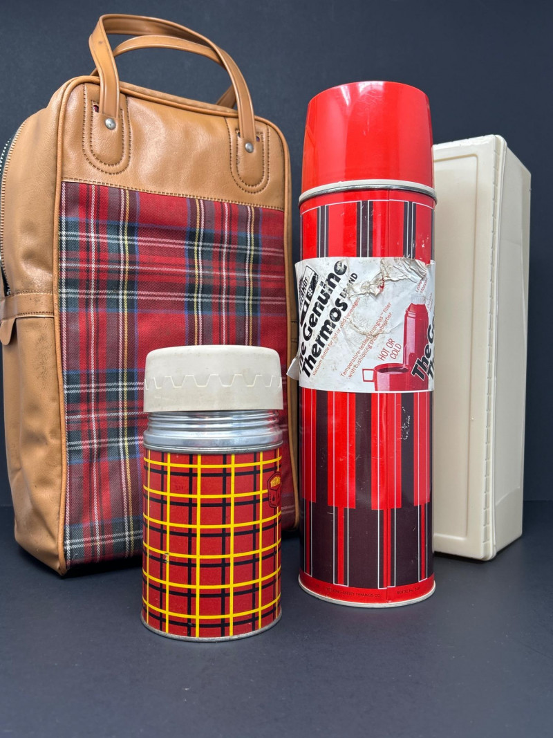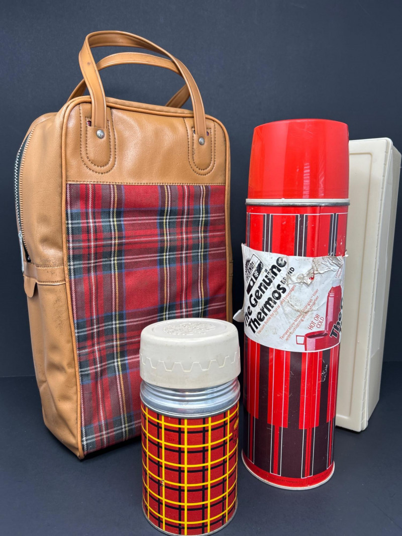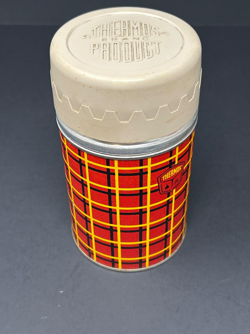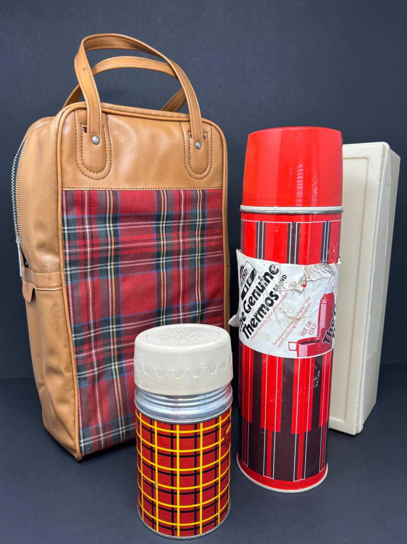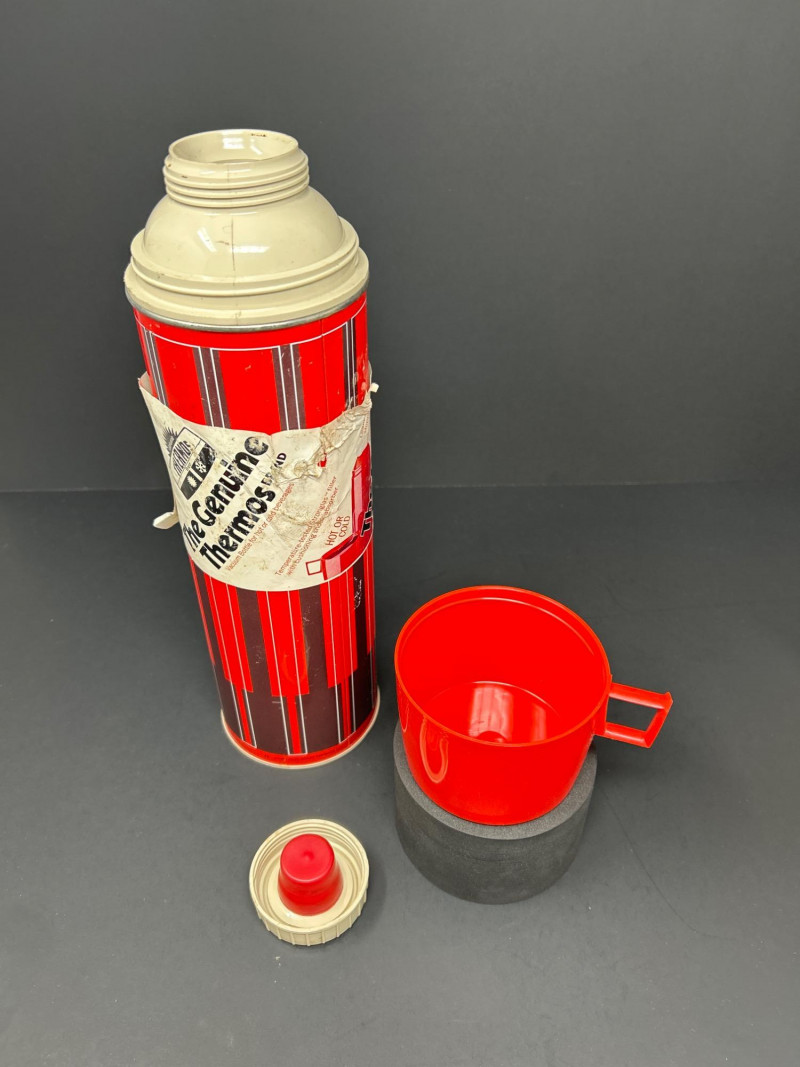 A vibrant vintage 1971 King-Seeley Thermos Co. vacuum bottle in the iconic red-and-black vertical stripe pattern. This original “The Genuine Thermos” brand bottle features its Polly Red-Top pressure-seal stopper, matching red handled cup, and beige twist cap. The bottle retains its original paper label showing “Vacuum Bottle for Hot or Cold Beverages,” along with the Thermos trademark sun-and-snowflake logo. The set also includes its cream plastic storage case and a red-plaid vinyl carry bag with tan leatherette trim and dual handles—perfect for picnic or retro travel display. Details: Maker: King-Seeley Thermos Co., Norwich, Connecticut, USA Model Year: ©1971 Design: Red and black vertical stripe pattern with cream top and base Components: 1 Thermos vacuum bottle 1 red handled cup (marked Thermos) 1 “Polly Red-Top” pressure seal stopper 1 cream plastic hard storage case 1 plaid vinyl and tan leatherette carry bag Markings: “©1971 KING-SEELEY THERMOS CO.” at bottle base; “Thermos Brand Product – Polly Red Top” on stopper Material: Metal body with plastic fittings and vinyl case