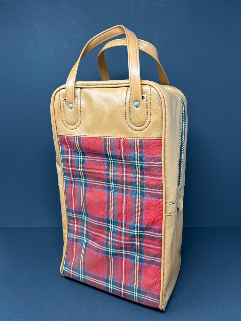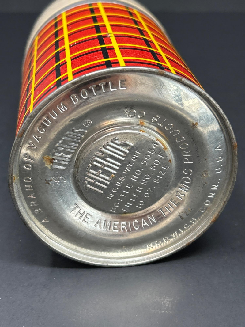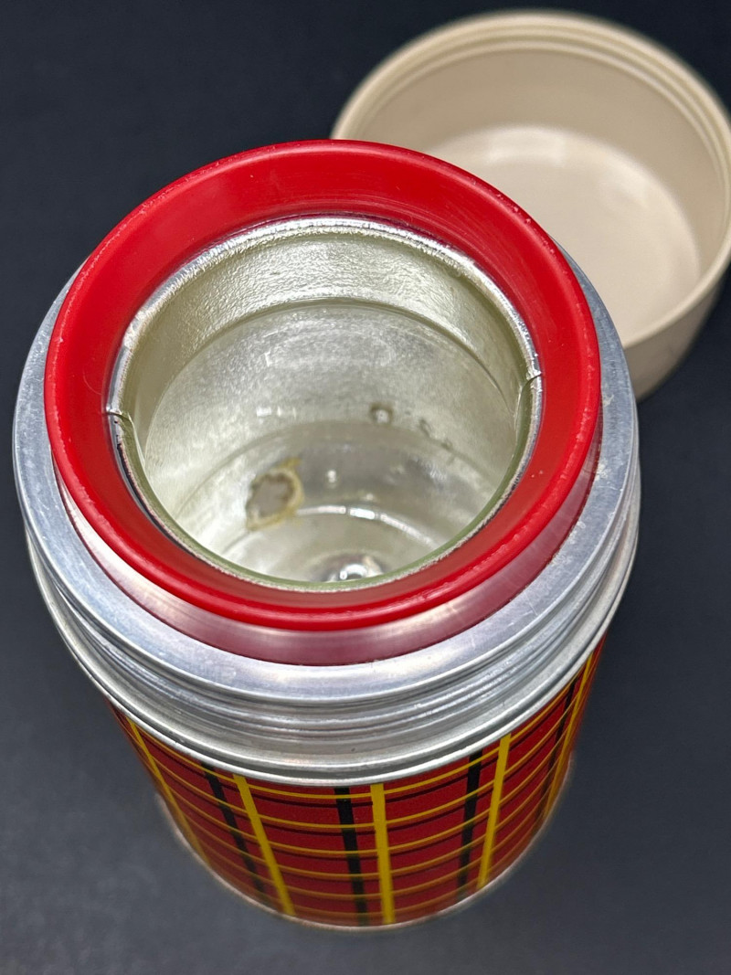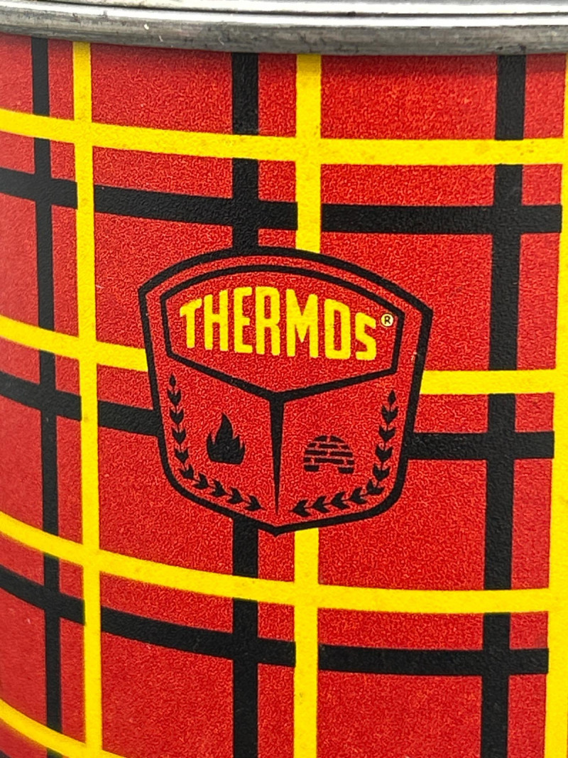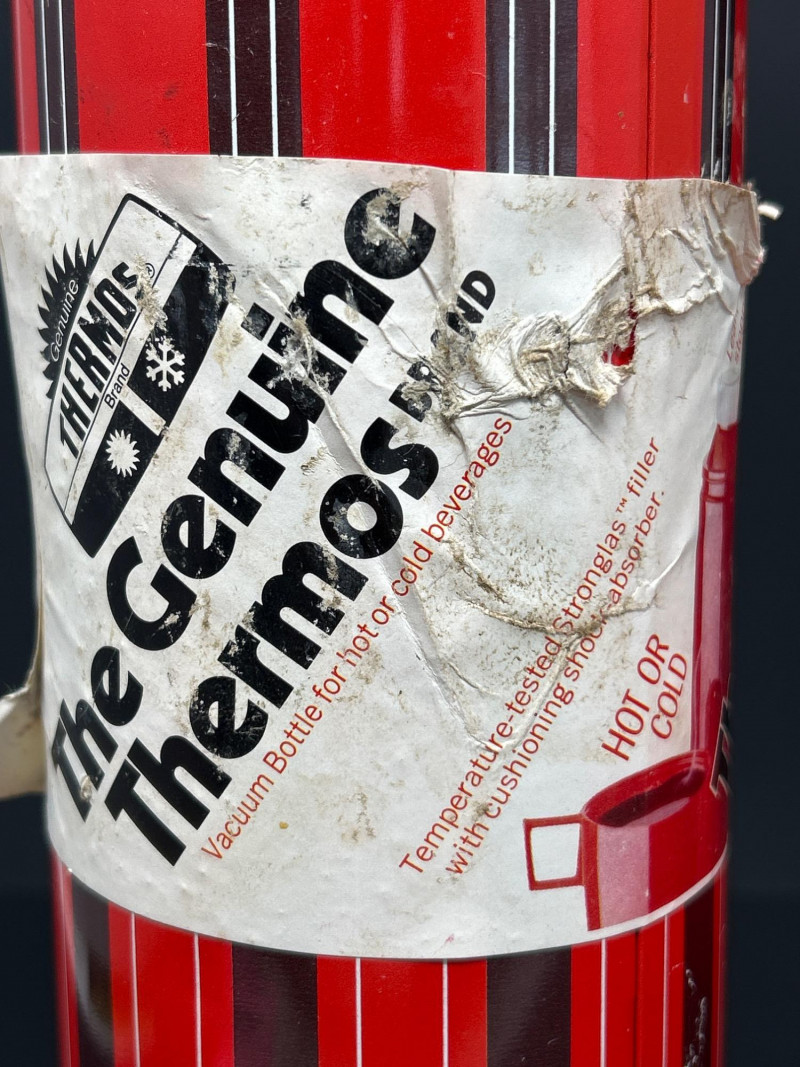 A vibrant vintage 1971 King-Seeley Thermos Co. vacuum bottle in the iconic red-and-black vertical stripe pattern. This original “The Genuine Thermos” brand bottle features its Polly Red-Top pressure-seal stopper, matching red handled cup, and beige twist cap. The bottle retains its original paper label showing “Vacuum Bottle for Hot or Cold Beverages,” along with the Thermos trademark sun-and-snowflake logo. The set also includes its cream plastic storage case and a red-plaid vinyl carry bag with tan leatherette trim and dual handles—perfect for picnic or retro travel display. Details: Maker: King-Seeley Thermos Co., Norwich, Connecticut, USA Model Year: ©1971 Design: Red and black vertical stripe pattern with cream top and base Components: 1 Thermos vacuum bottle 1 red handled cup (marked Thermos) 1 “Polly Red-Top” pressure seal stopper 1 cream plastic hard storage case 1 plaid vinyl and tan leatherette carry bag Markings: “©1971 KING-SEELEY THERMOS CO.” at bottle base; “Thermos Brand Product – Polly Red Top” on stopper Material: Metal body with plastic fittings and vinyl case