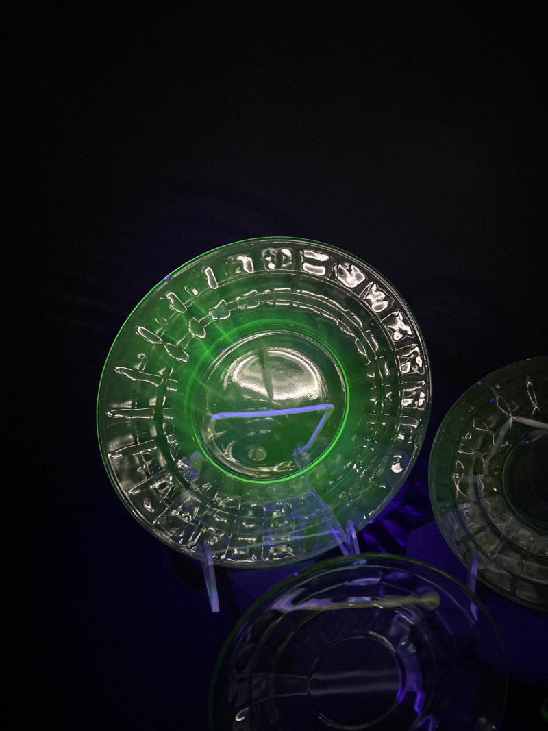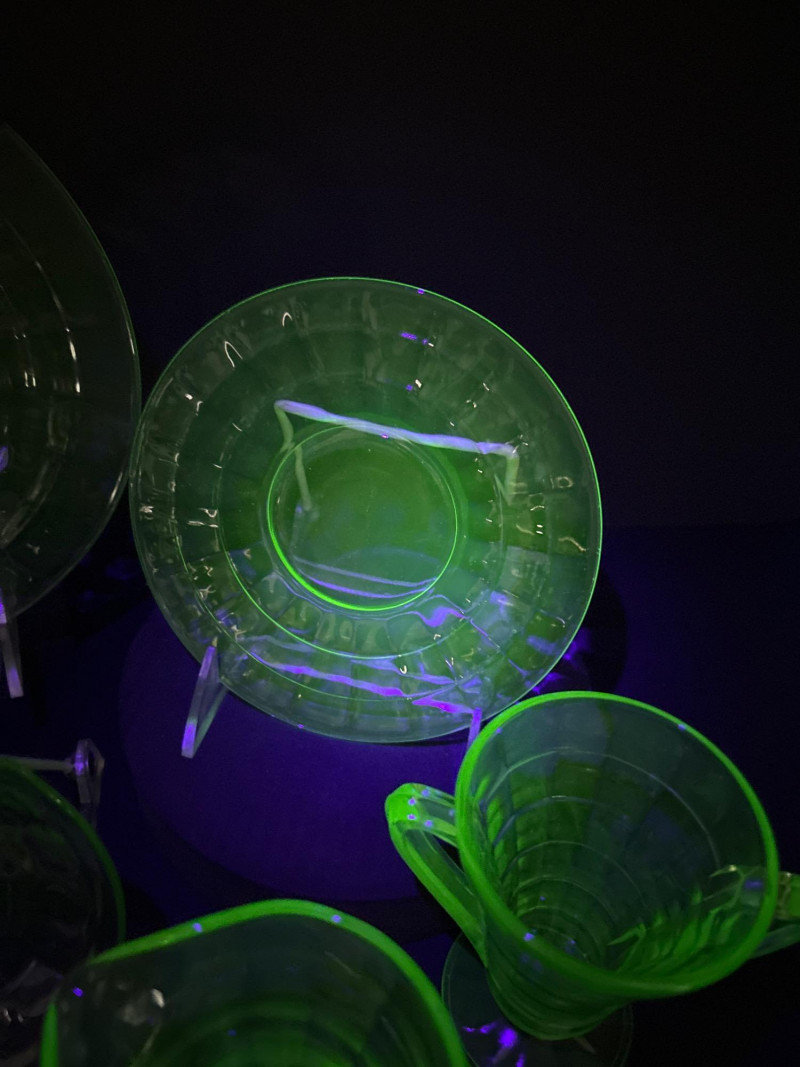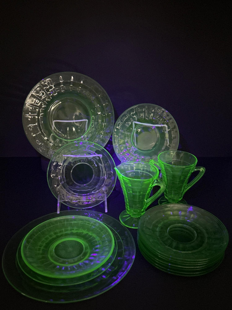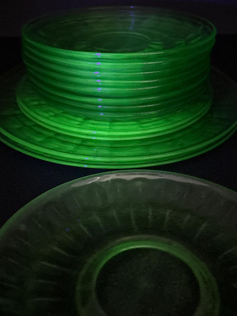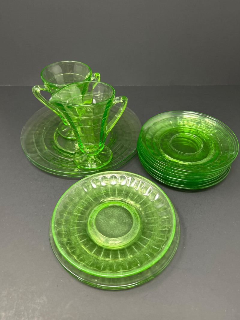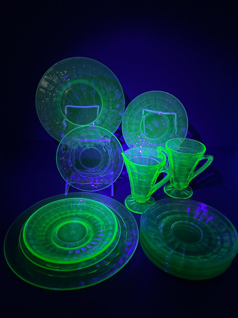 Brilliant 1930s Anchor Hocking “Block Optic” uranium glass set, featuring the iconic geometric cube pattern and vivid chartreuse glow under UV light. This luminous collection exemplifies the Art Deco elegance and craftsmanship of Depression-era pressed glass — a timeless highlight for collectors and display. Item Details: (2) Large plates – approx. 8½″ diameter (2) Medium plates – approx. 6¼″ diameter (8) Small plates – approx. 5½″ diameter (1) Small plate – approx. 5¾″ diameter (1) Creamer – approx. 4½″ tall (1) Sugar – approx. 4½″ tall Pattern: Block Optic Maker: Anchor Hocking Glass Co. Era: circa 1929–1933 Material: Uranium green Depression glass UV Reactive: Glows brilliantly under blacklight