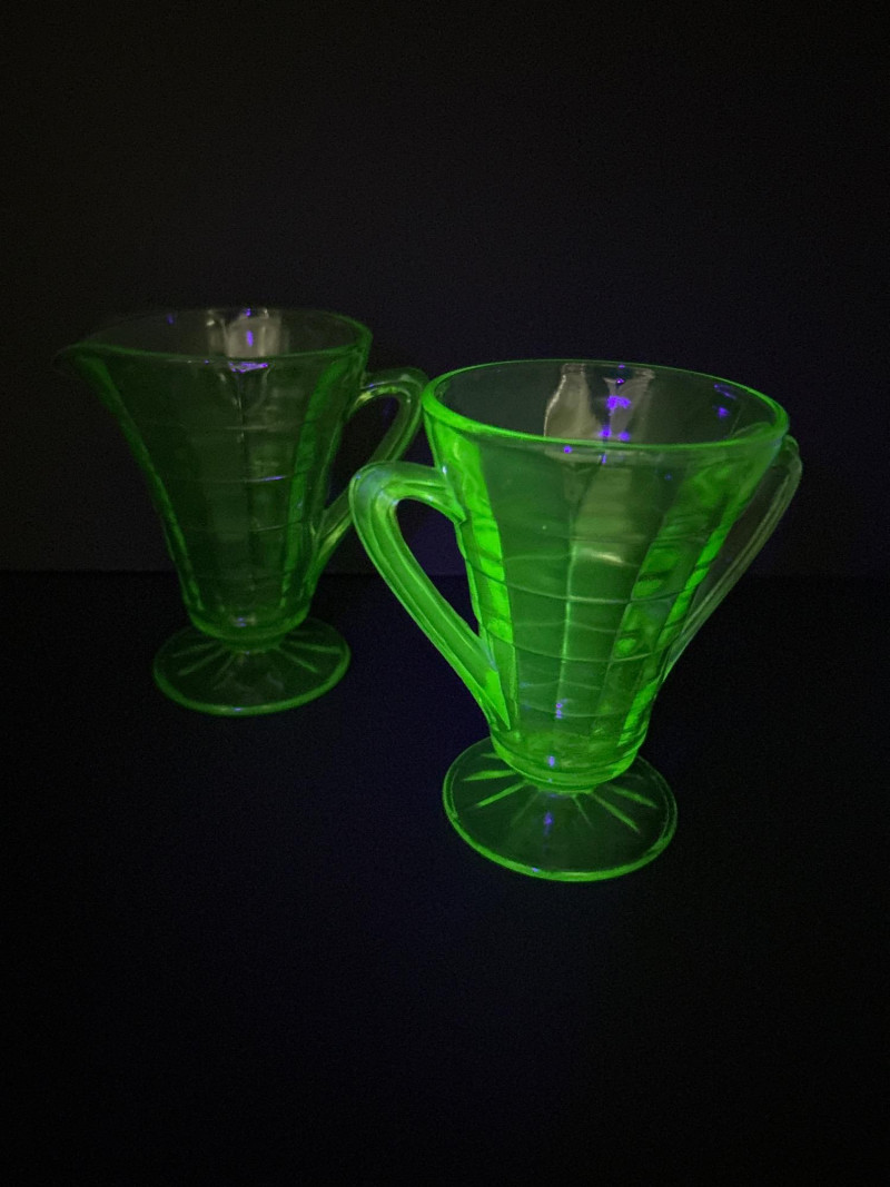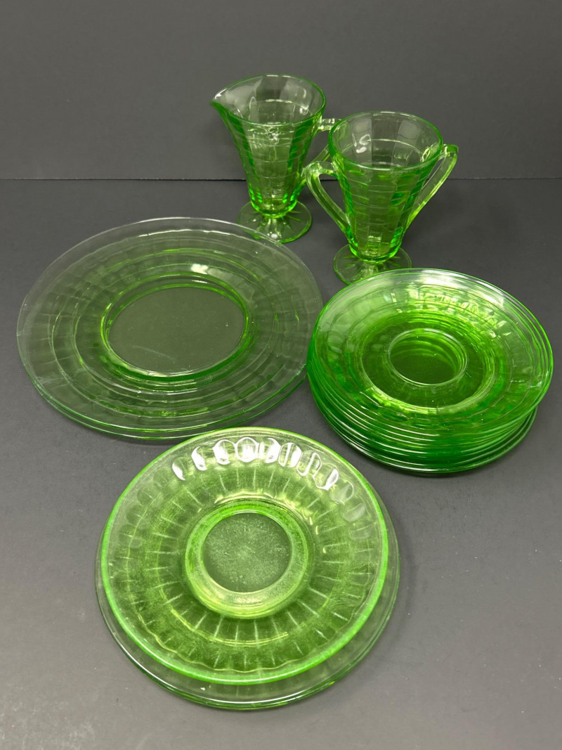 Lot # 48 - Anchor Hocking Block Optic Uranium Glass – Creamer, Sugar & Plates