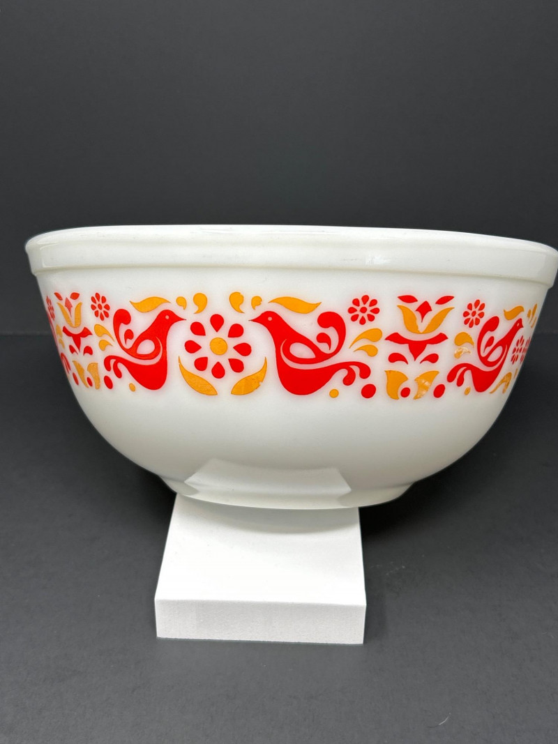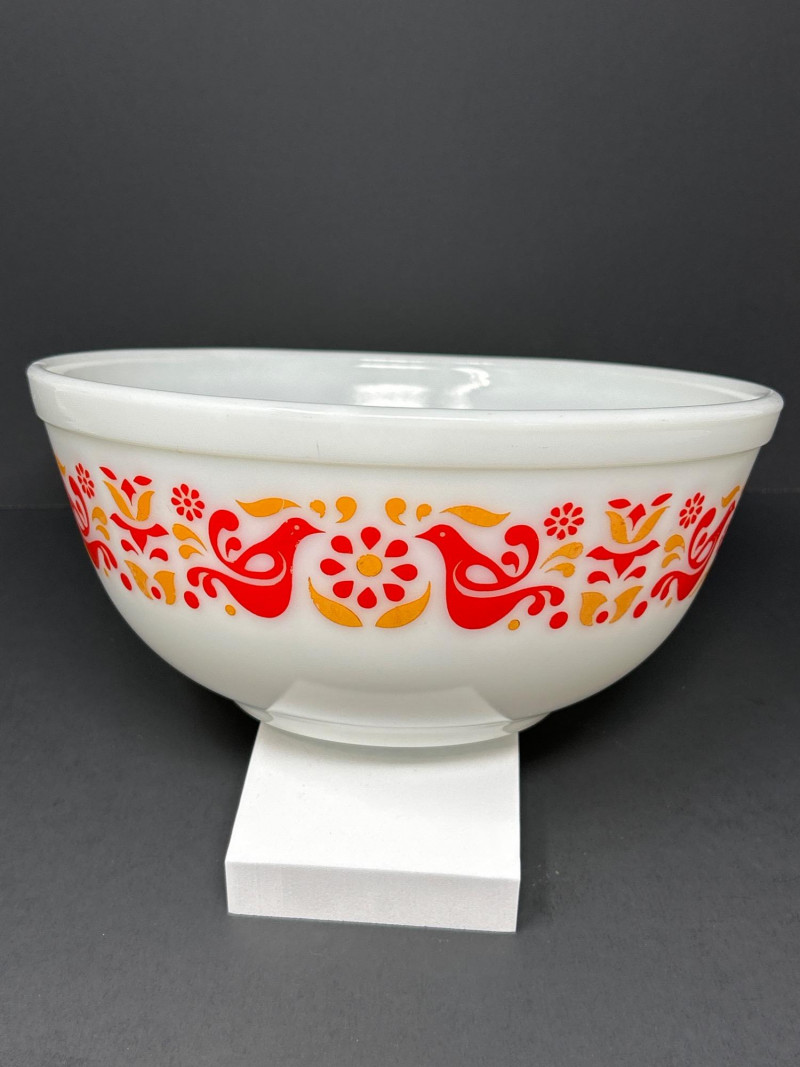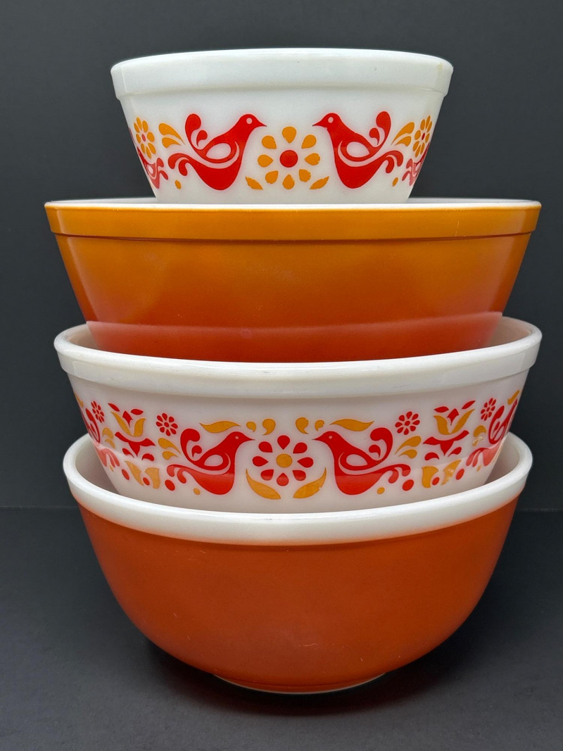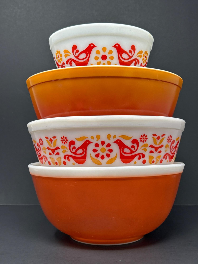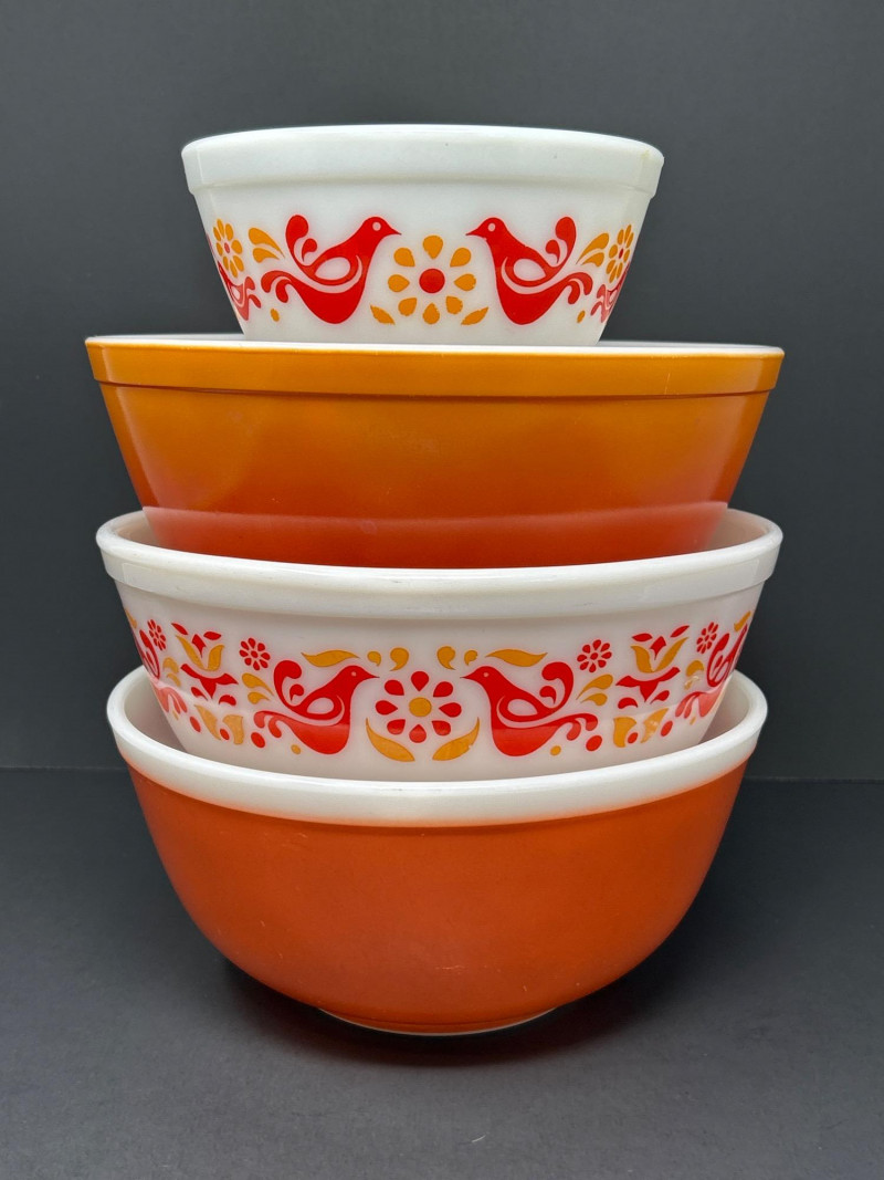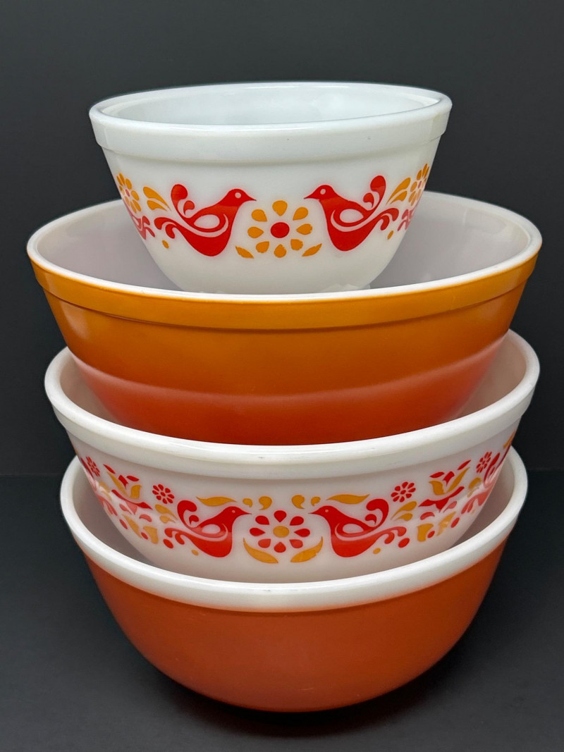 A complete 4-piece Pyrex mixing bowl set in the vibrant Friendship pattern, featuring stylized red birds and floral motifs on white milk glass, paired with solid orange bowls. Produced in 1971, this nesting set includes bowls #401 through #404, each designed for both display and utility. The folk-art inspired design and bold color palette make this one of Pyrex’s most beloved and collectible patterns. Maker: Pyrex (Corning Glass Works) Pattern: Friendship Date: 1971 Set Includes: #401 – 1.5 pint (orange) #402 – 1.5 quart (white with red/orange birds) #403 – 2.5 quart (orange) #404 – 4 quart (white with red/orange birds) Material: White milk glass with fired-on color Condition: Excellent vintage condition; no chips or cracks noted; pattern remains vibrantDescription