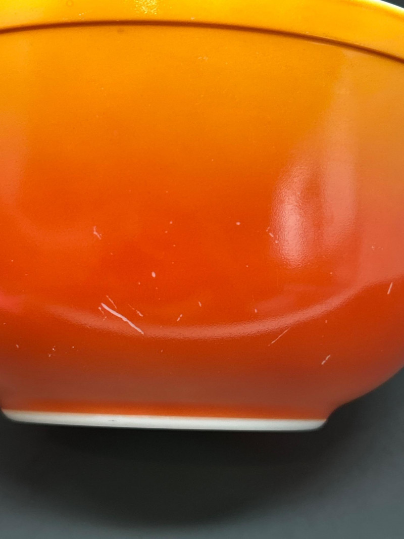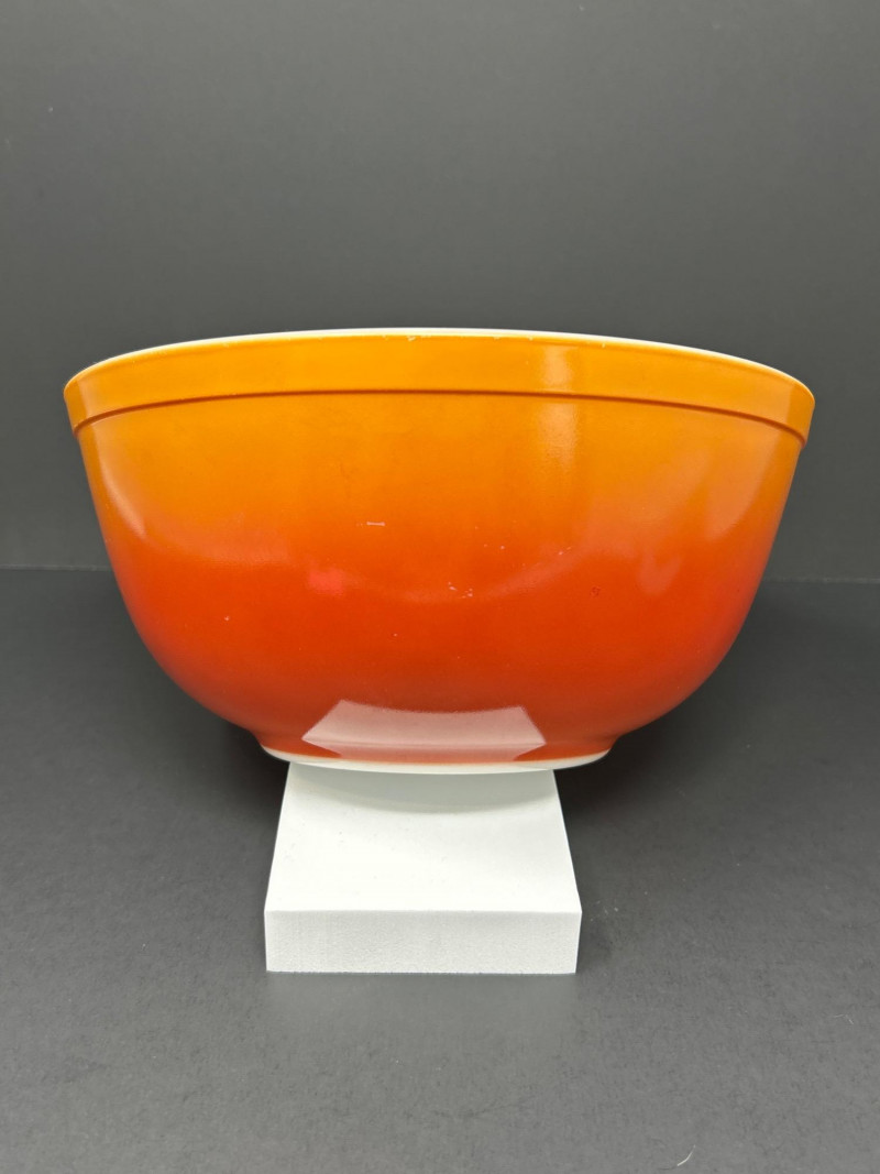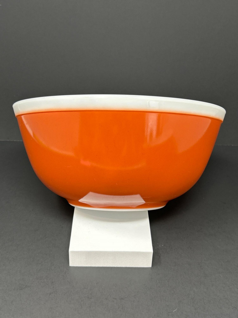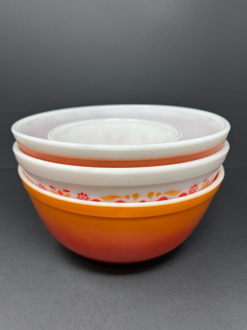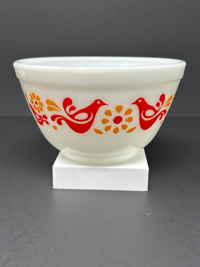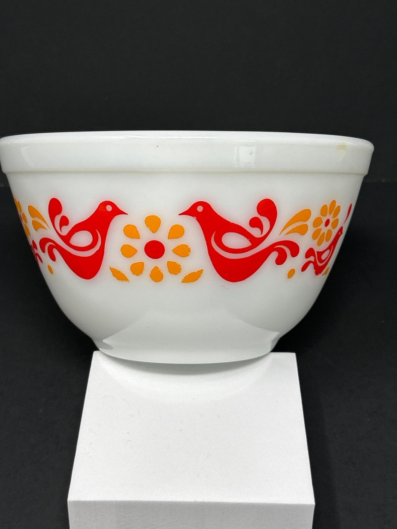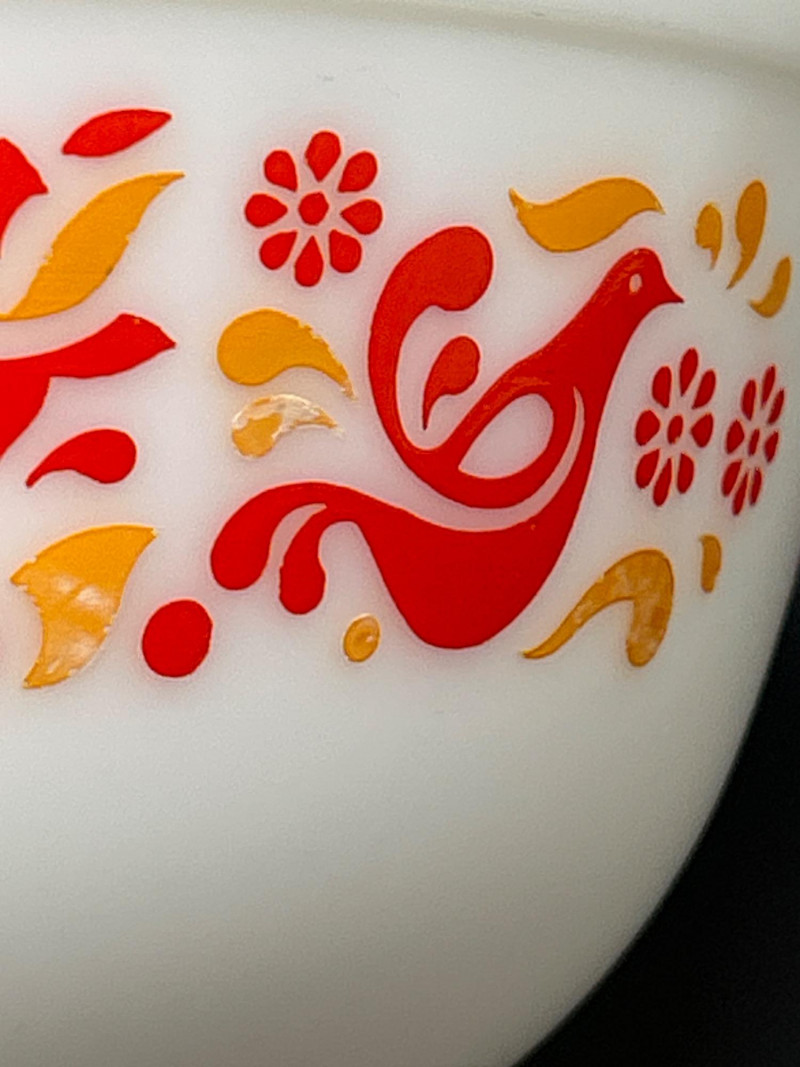A complete 4-piece Pyrex mixing bowl set in the vibrant Friendship pattern, featuring stylized red birds and floral motifs on white milk glass, paired with solid orange bowls. Produced in 1971, this nesting set includes bowls #401 through #404, each designed for both display and utility. The folk-art inspired design and bold color palette make this one of Pyrex’s most beloved and collectible patterns. Maker: Pyrex (Corning Glass Works) Pattern: Friendship Date: 1971 Set Includes: #401 – 1.5 pint (orange) #402 – 1.5 quart (white with red/orange birds) #403 – 2.5 quart (orange) #404 – 4 quart (white with red/orange birds) Material: White milk glass with fired-on color Condition: Excellent vintage condition; no chips or cracks noted; pattern remains vibrantDescription