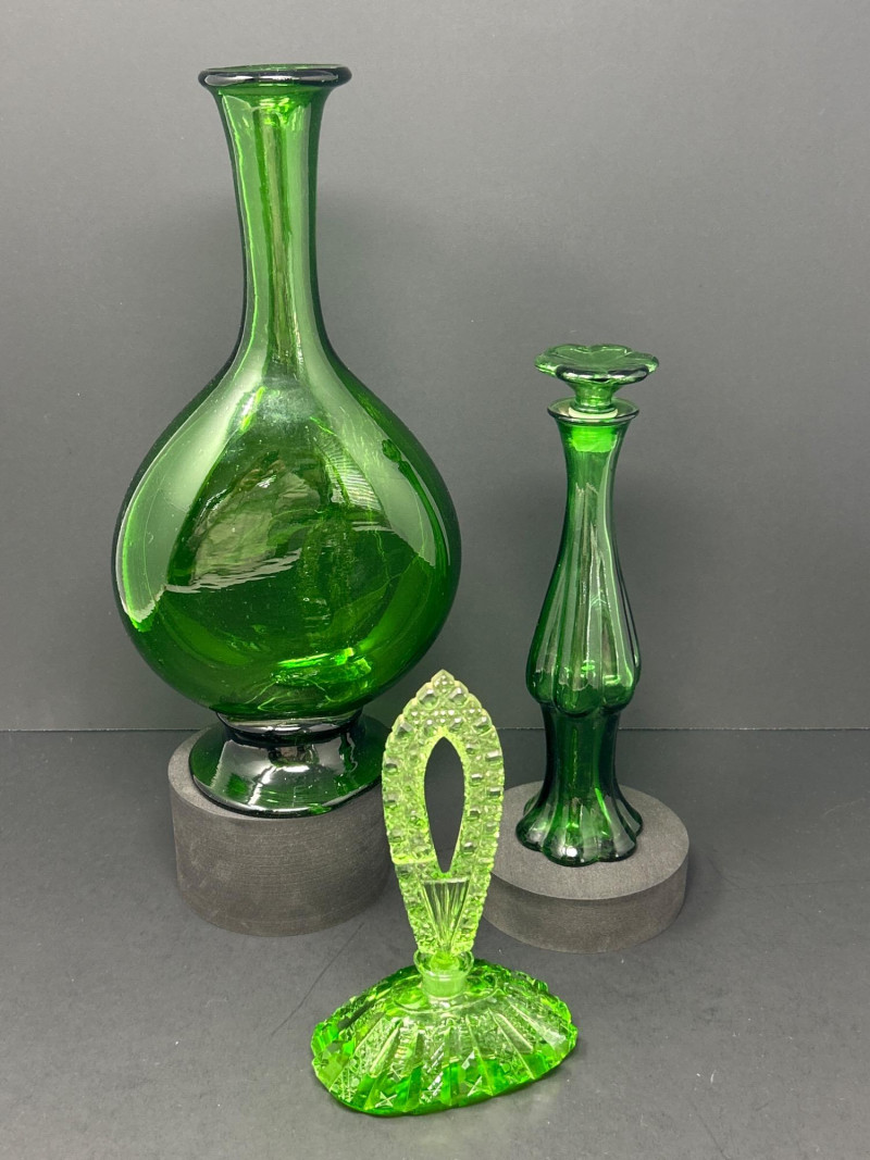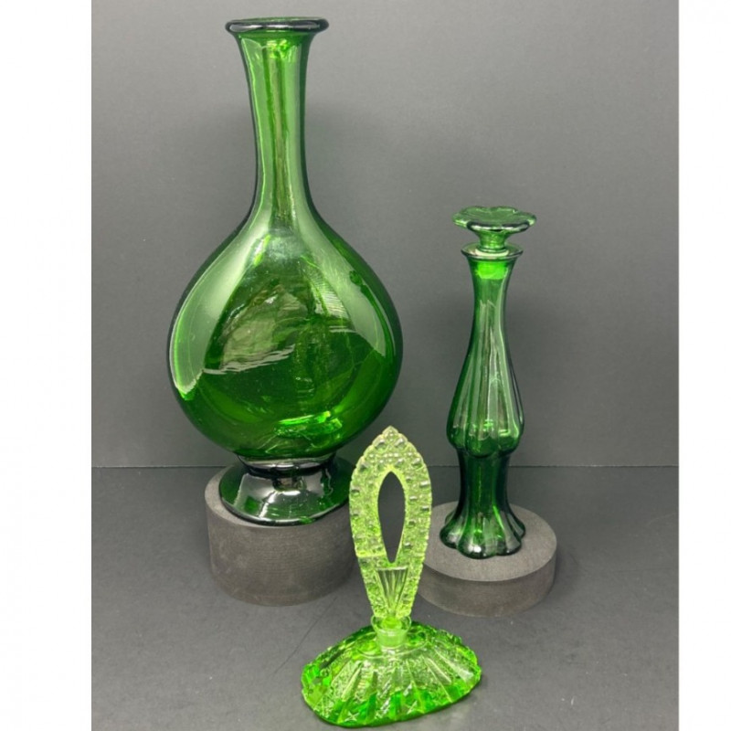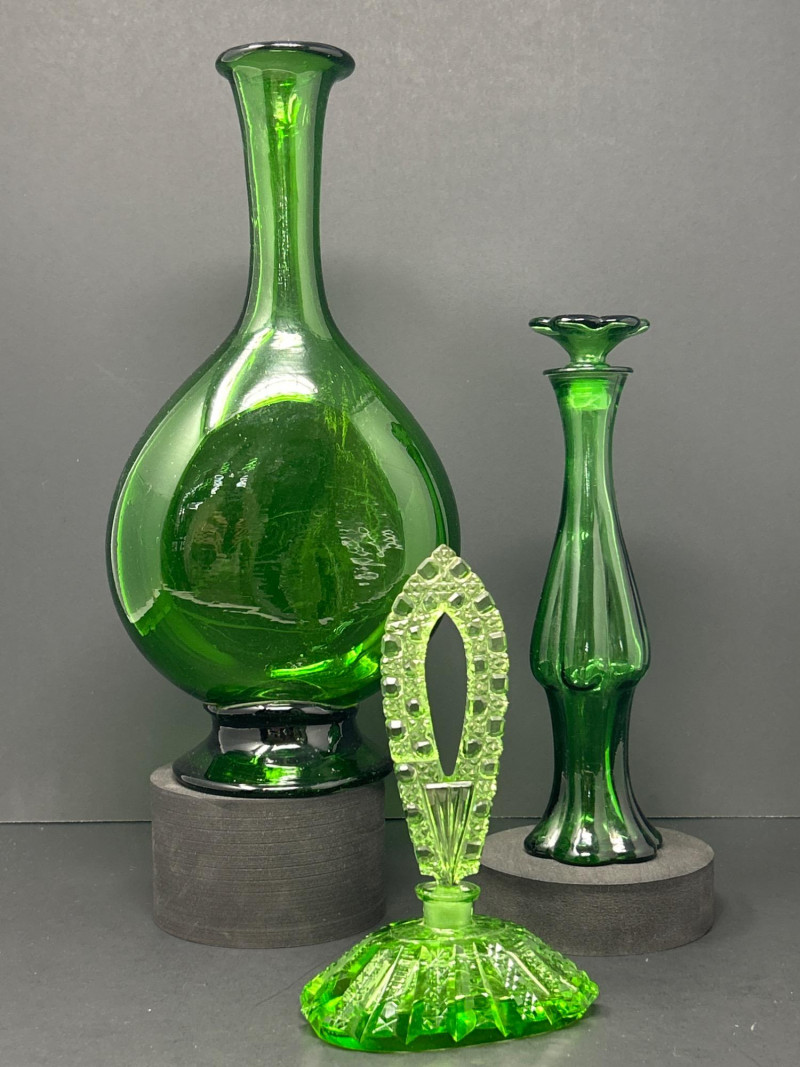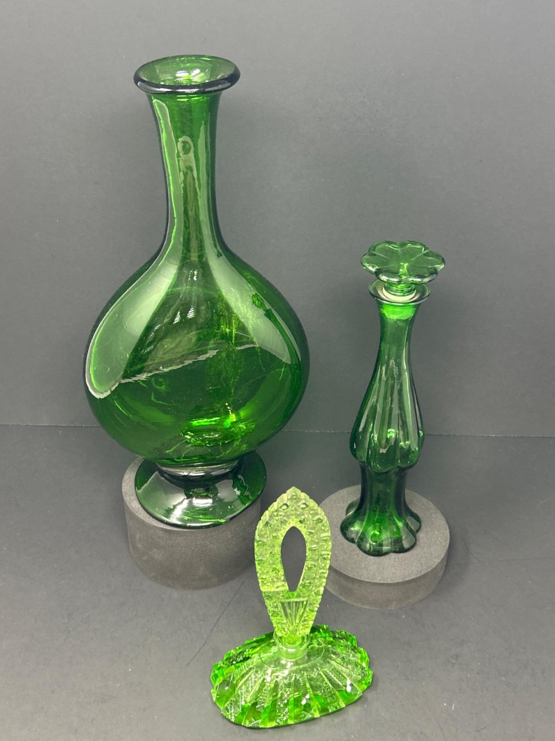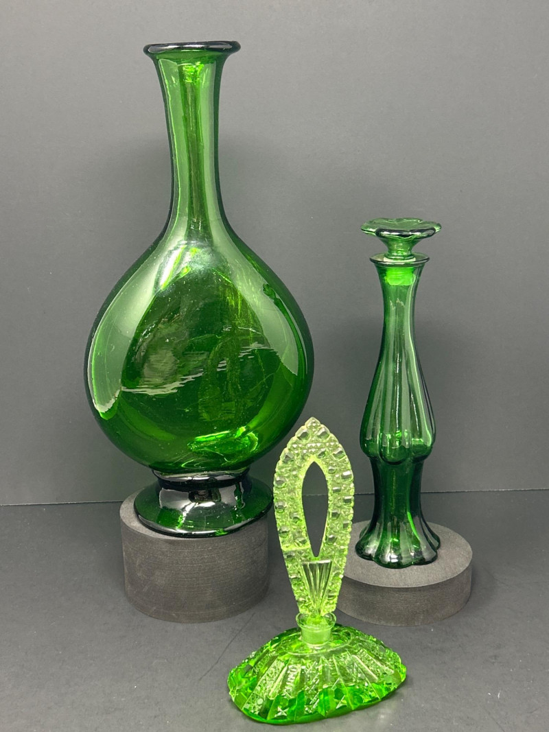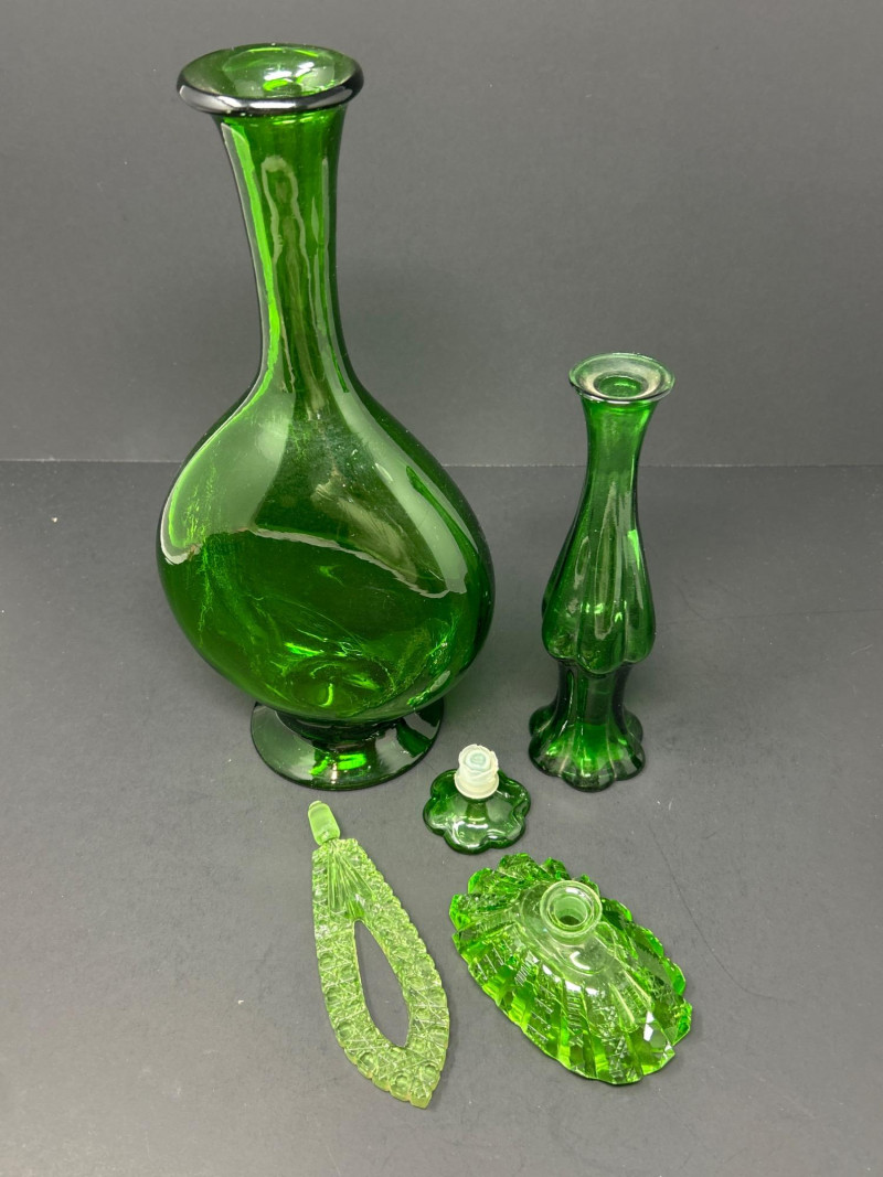 Together, these pieces reflect the evolution of 20th-century glass design — from streamlined MCM forms to Deco-inspired vanity glass — unified by deep emerald and light chartreuse tones.Item Details: