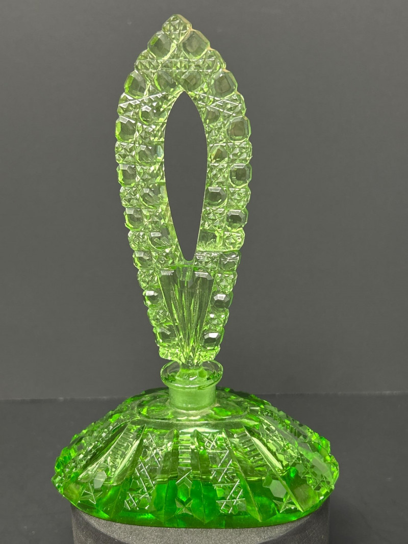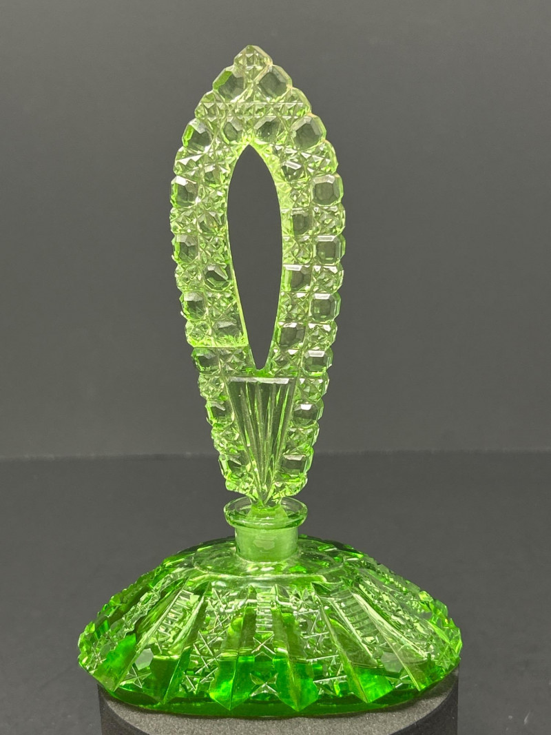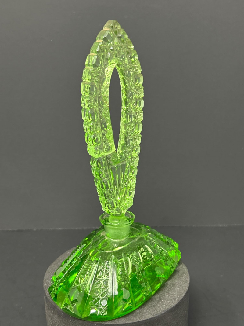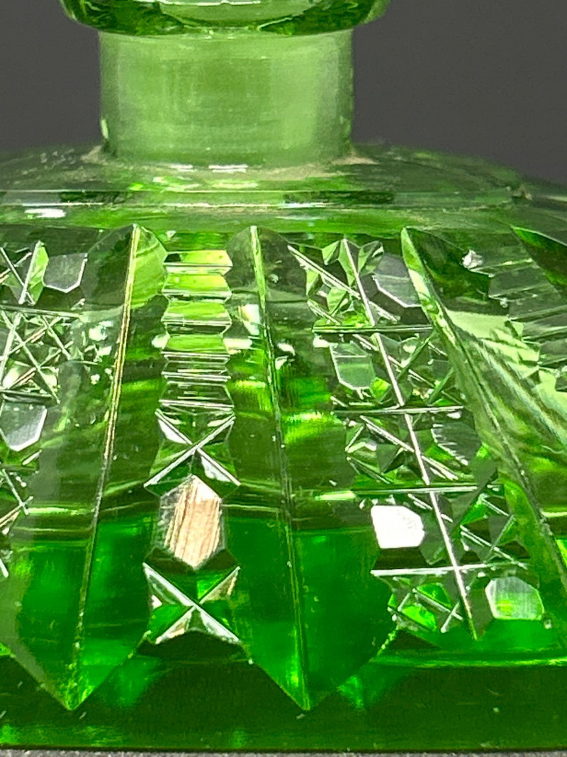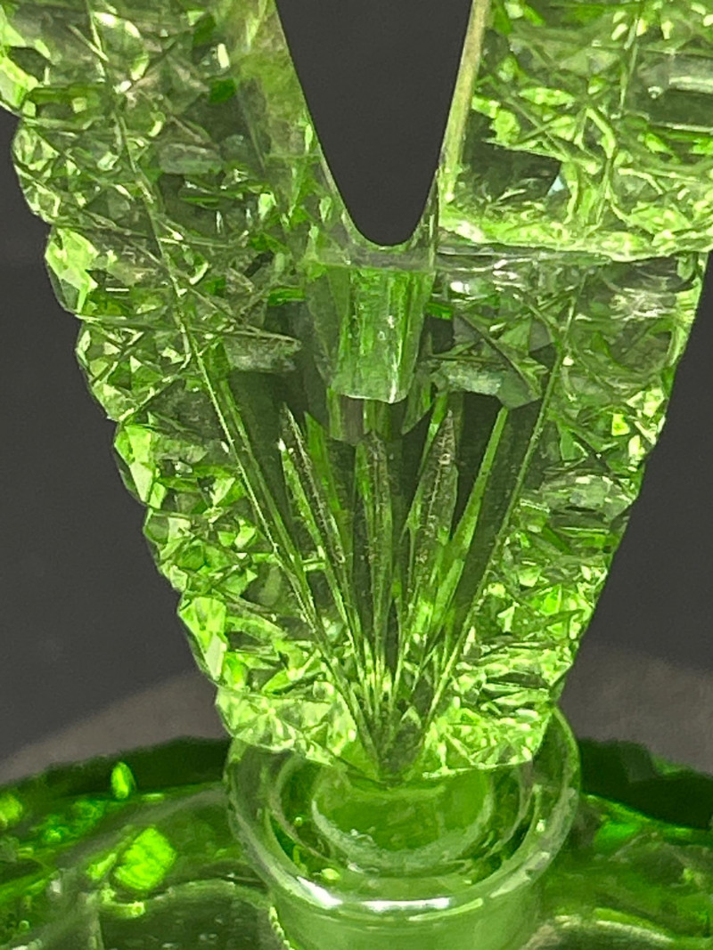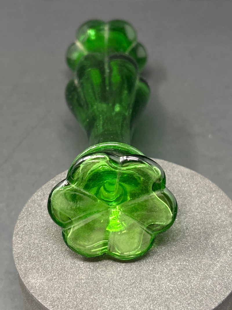 Together, these pieces reflect the evolution of 20th-century glass design — from streamlined MCM forms to Deco-inspired vanity glass — unified by deep emerald and light chartreuse tones.Item Details:
