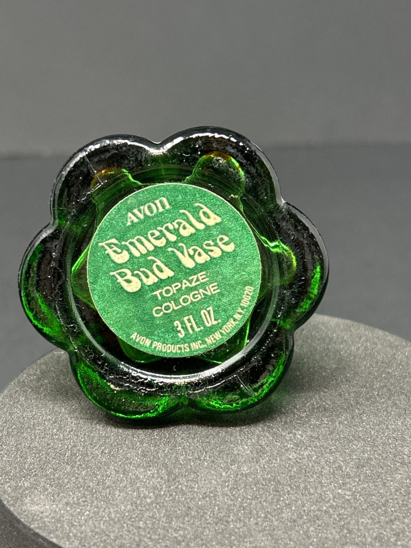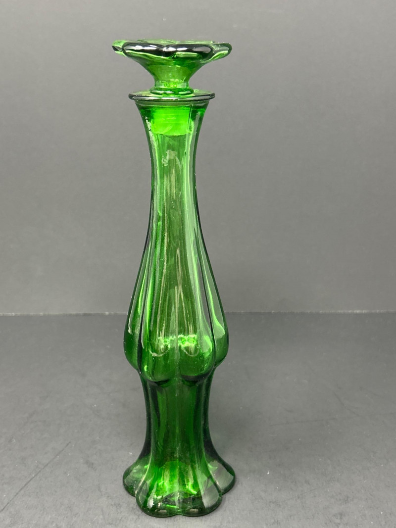 A refined trio of green glass pieces featuring a Mid-Century Modern Art Glass Vase, an Avon “Emerald Bud Vase with Stopper” cologne bottle, and an Art Deco–Style Cut Glass Perfume Bottle. MCM Art Glass Vase Avon “Emerald Bud Vase with Stopper” Art Deco–Style Cut Glass Perfume Bottle