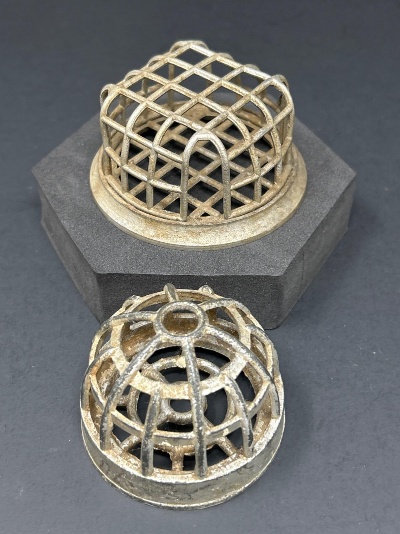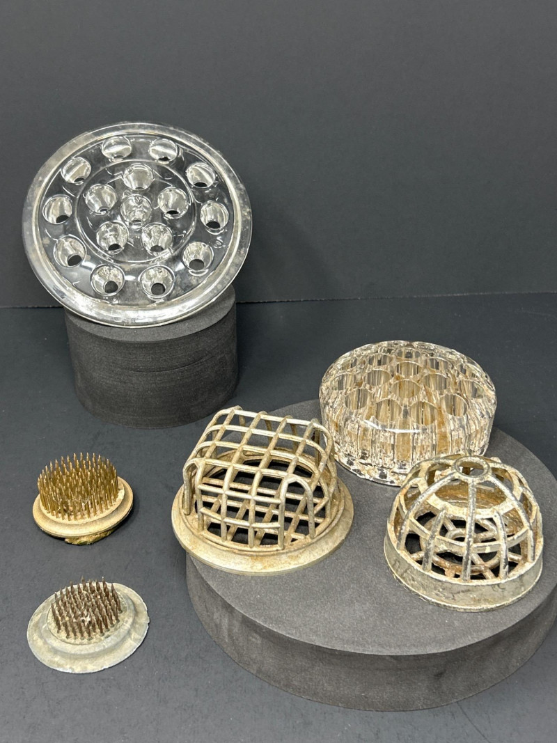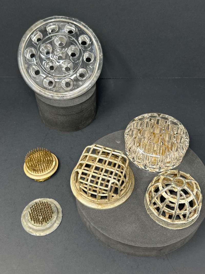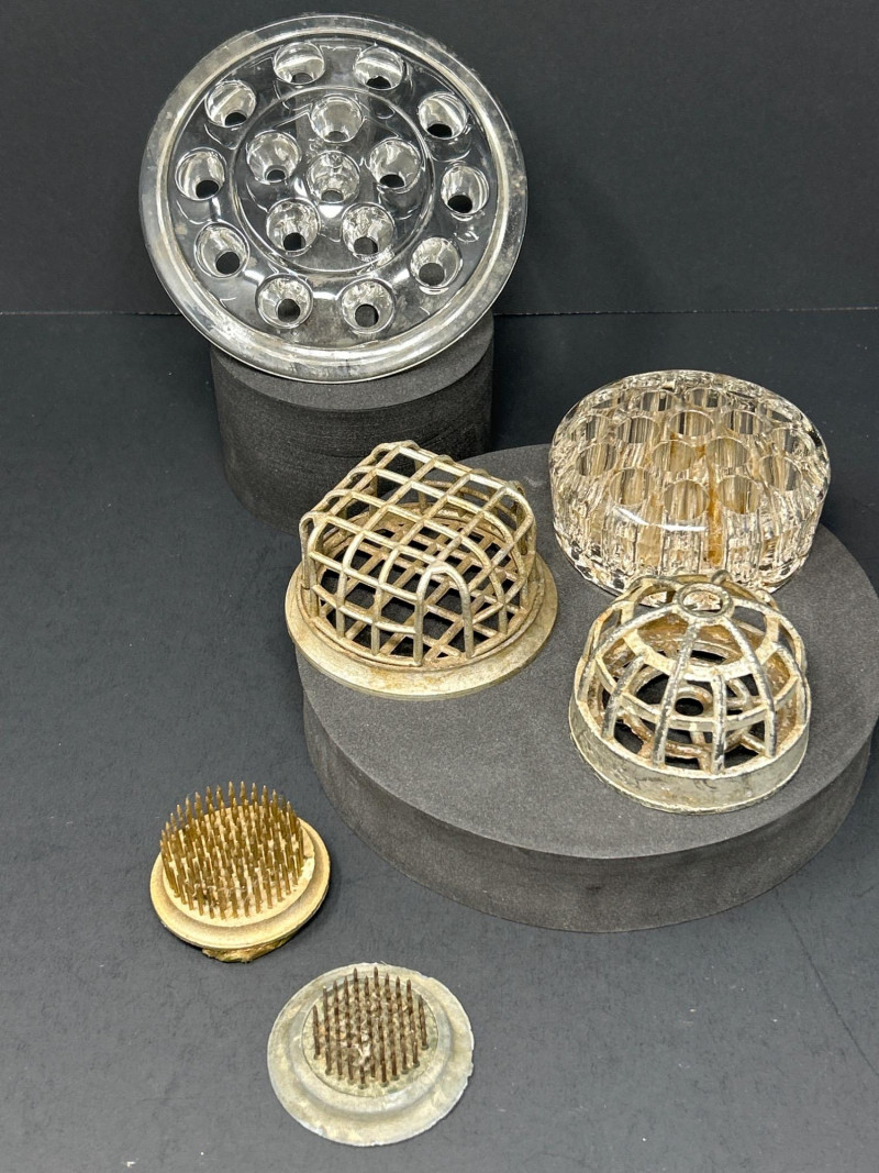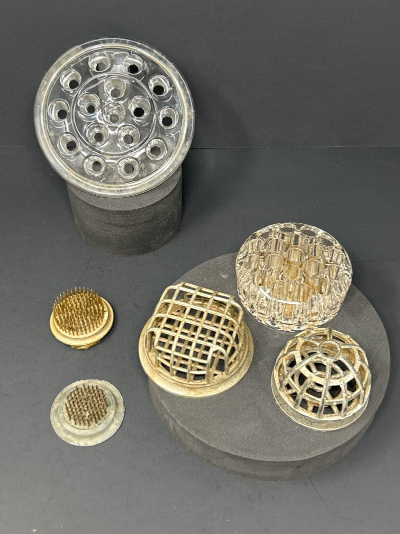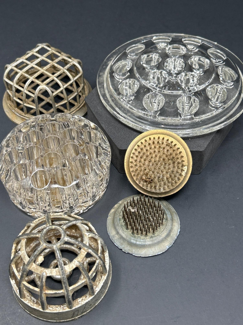 Lot # 55 - Six Flower Frogs – Glass, Metal Cage & Brass Kenzan Collection