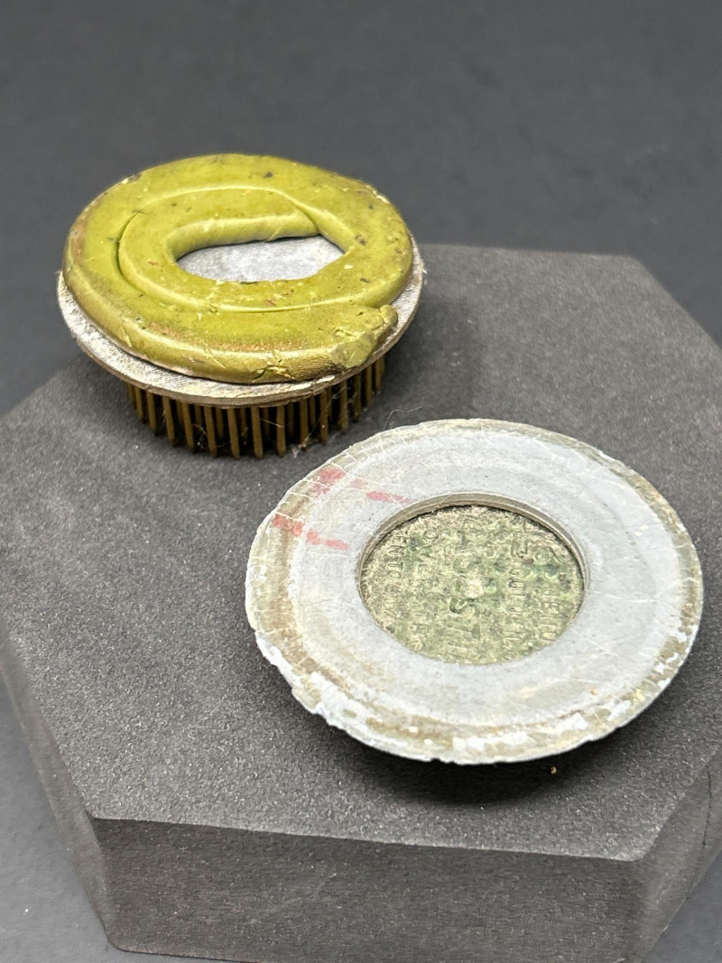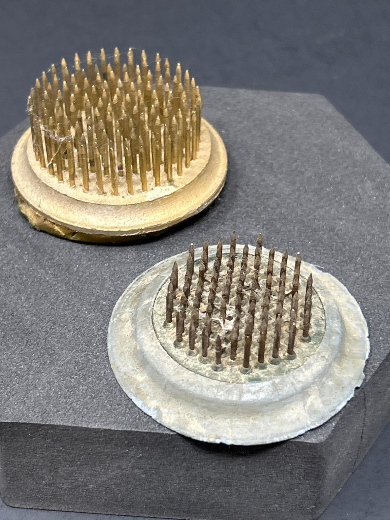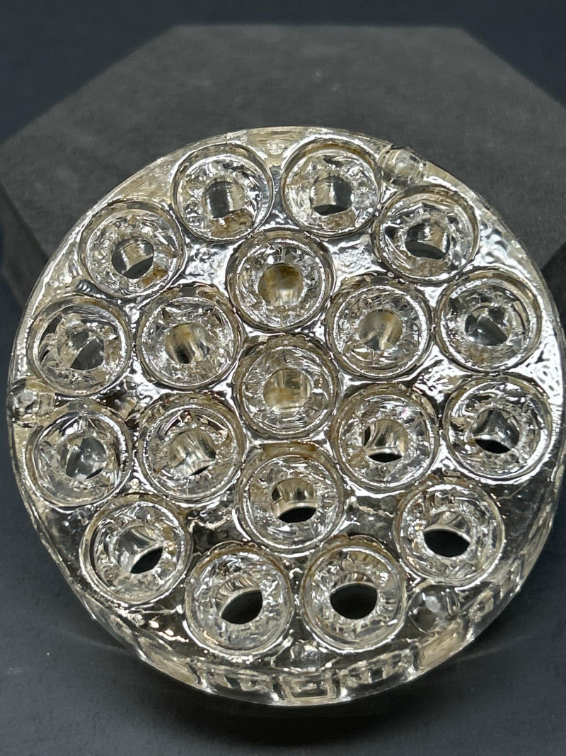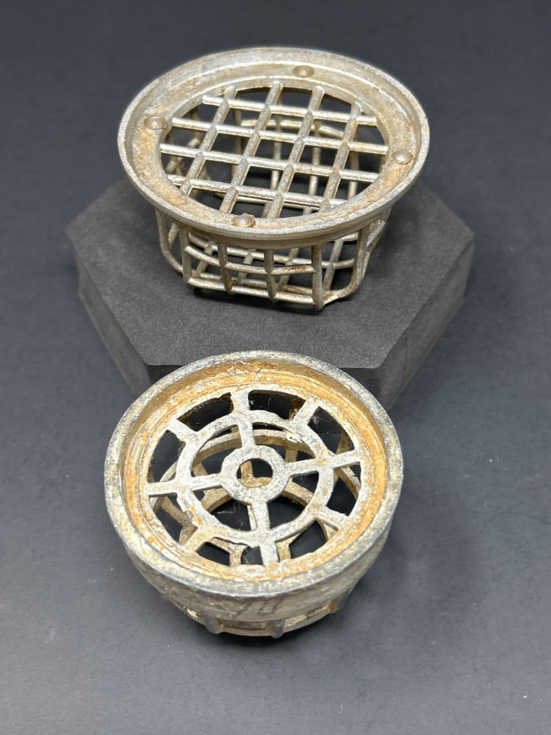 A fine six-piece collection of vintage flower frogs from the 1930s–1950s, showcasing a range of materials and styles used in classic floral design. These ingenious tools were placed inside vases or bowls to hold flower stems securely in place and are now prized for both their function and sculptural beauty. The lot features two clear pressed-glass frogs with circular multi-hole designs, two domed metal cage-style frogs with lattice grids, and two brass pin-type kenzans with original patina. Together, they represent the evolution of floristry aids from the Art Deco to the mid-century era — equally appealing to collectors and designers. Lot Details: Quantity: 6 pieces Materials: Pressed glass, cast metal, brass Types Included: (2) Clear glass frogs with multiple stem holes (flat 5″ round and domed 4½″ round) (2) Metal cage-style frogs with domed lattice tops (aged brass tone) (2) Brass pin-type “kenzan” frogs (approx. 2″–2½″ diameter) Approximate Dimensions: Largest 5″ across; smallest 2″ across Era: Circa 1930s–1950s Collecting Note: