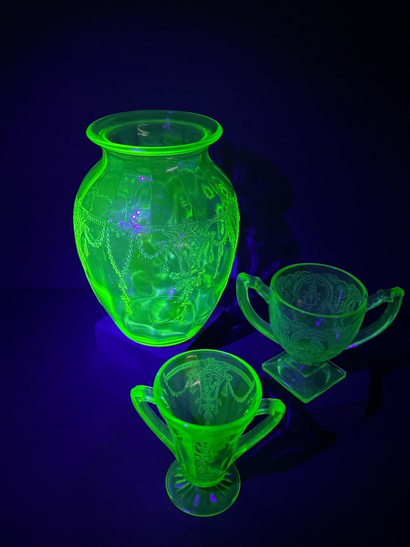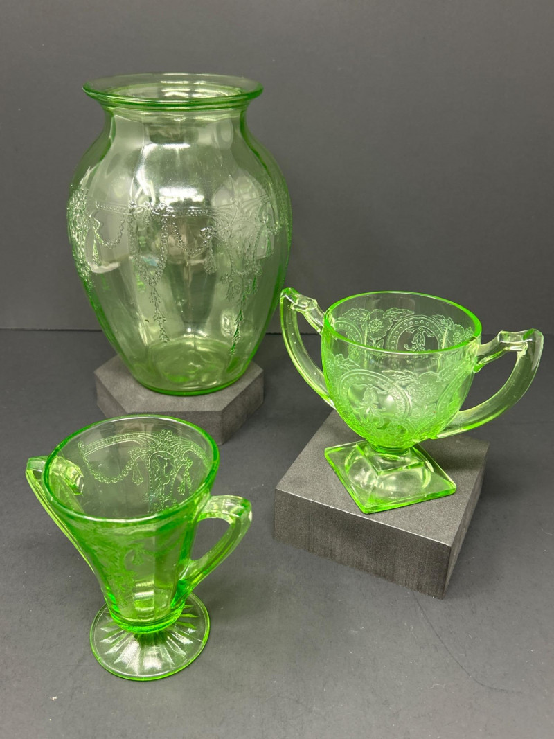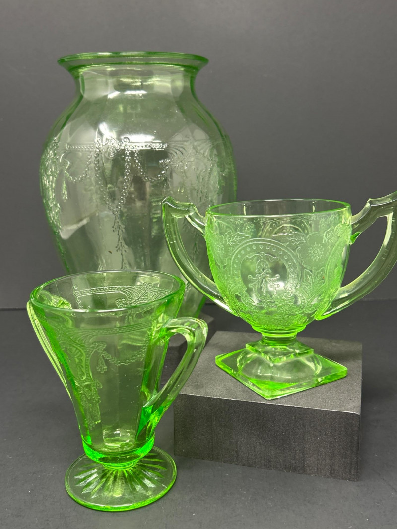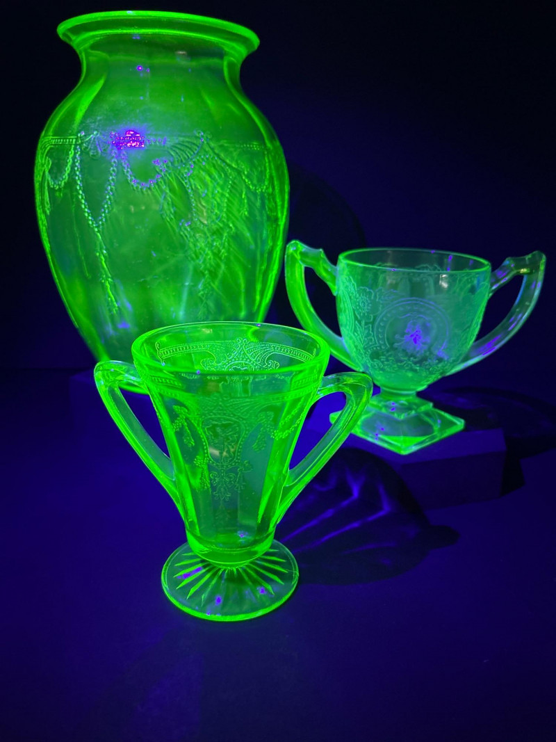 A luminous trio of uranium glass from the 1930s, featuring two Anchor Hocking “Ballerina Cameo” pieces — a flared vase and footed trophy cup — paired with an Indiana Glass “Horseshoe” open sugar bowl. Together, these fine Depression-era examples highlight the beauty of early American pressed glass, admired for its intricate molded detail, elegant Art Deco motifs, and brilliant green fluorescence under UV light. Anchor Hocking “Ballerina Cameo” Vase Anchor Hocking “Ballerina Cameo” Trophy Cup Indiana Glass “Horseshoe” Open Sugar BowlItem Details: