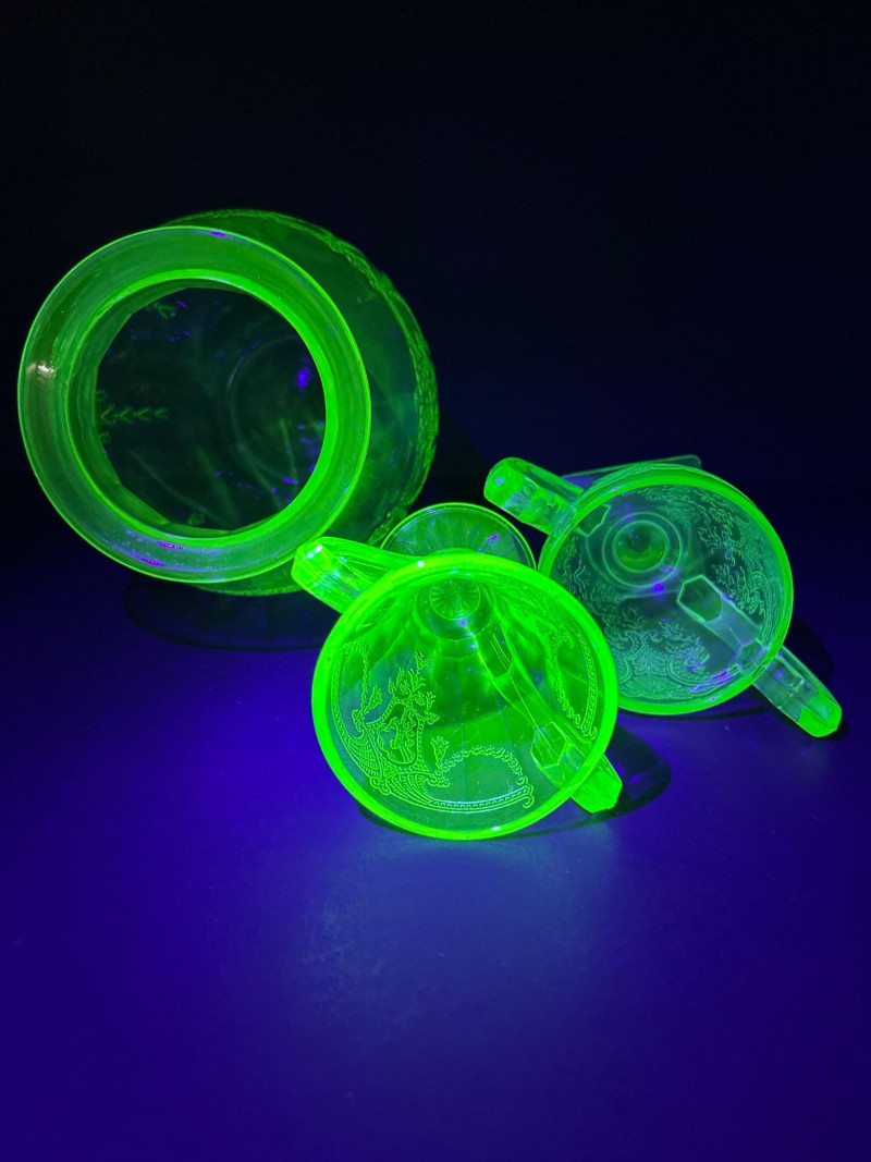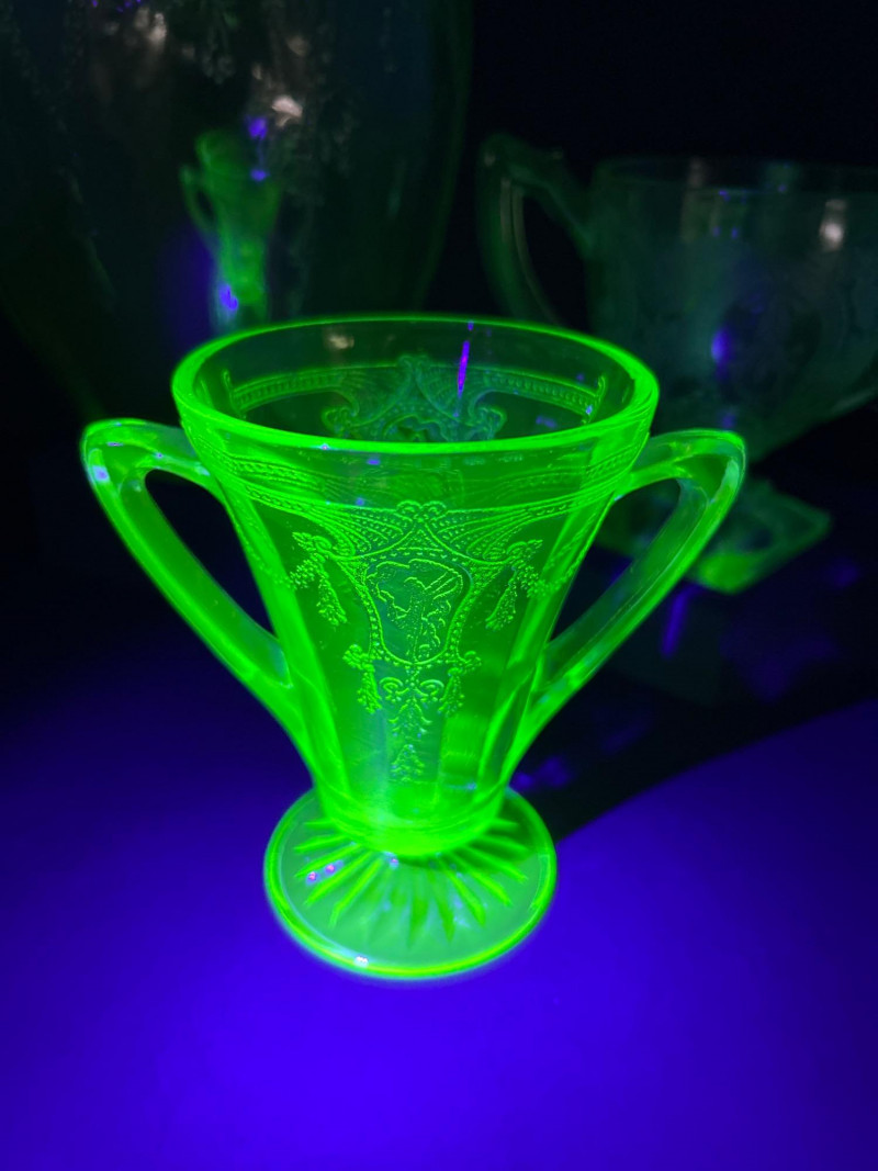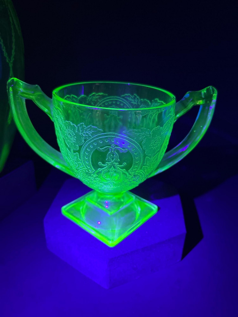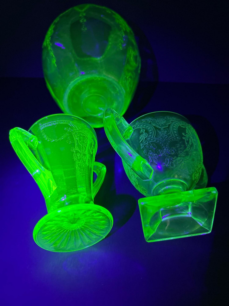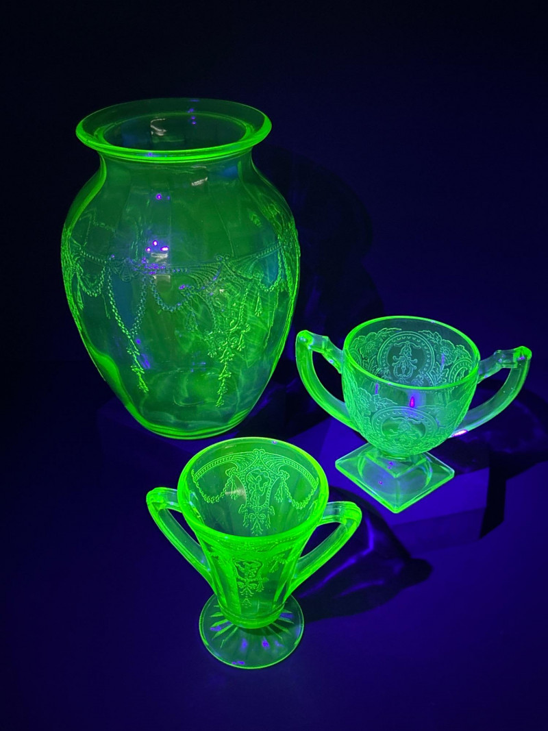 A luminous trio of uranium glass from the 1930s, featuring two Anchor Hocking “Ballerina Cameo” pieces — a flared vase and footed trophy cup — paired with an Indiana Glass “Horseshoe” open sugar bowl. Together, these fine Depression-era examples highlight the beauty of early American pressed glass, admired for its intricate molded detail, elegant Art Deco motifs, and brilliant green fluorescence under UV light. Anchor Hocking “Ballerina Cameo” Vase Anchor Hocking “Ballerina Cameo” Trophy Cup Indiana Glass “Horseshoe” Open Sugar BowlItem Details: