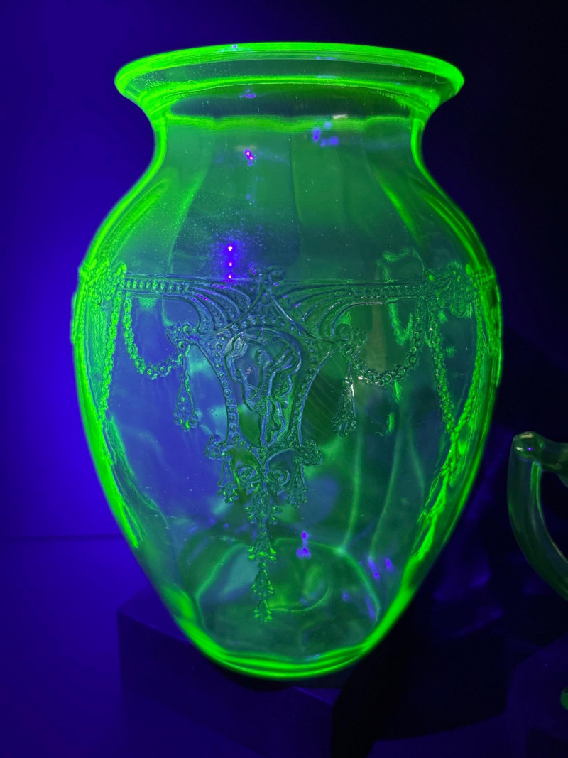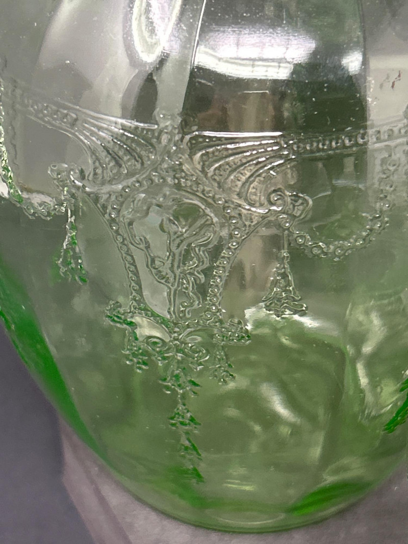 Color / Finish: Uranium green glass with floral medallion and garland motif