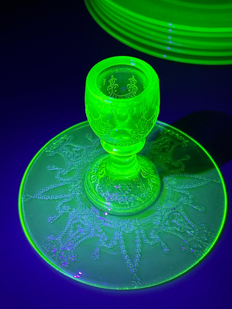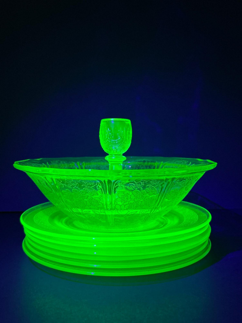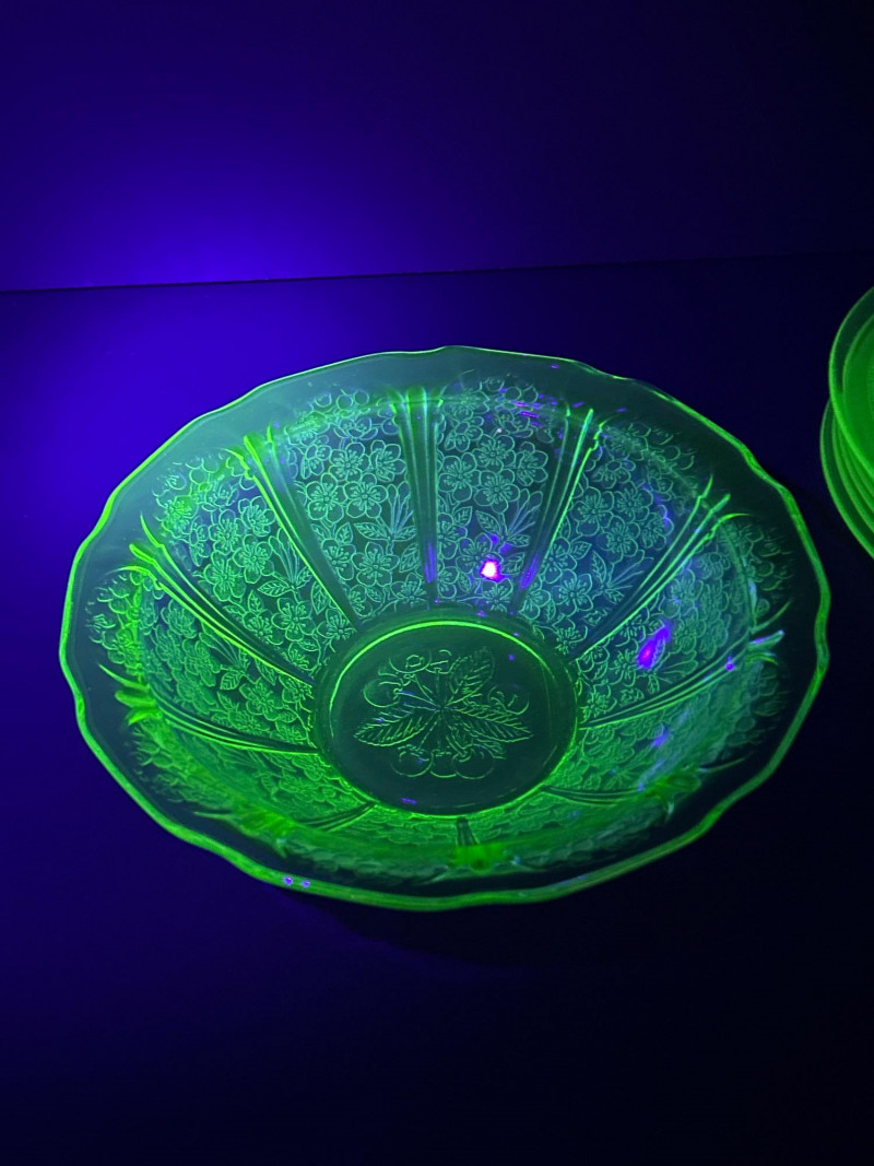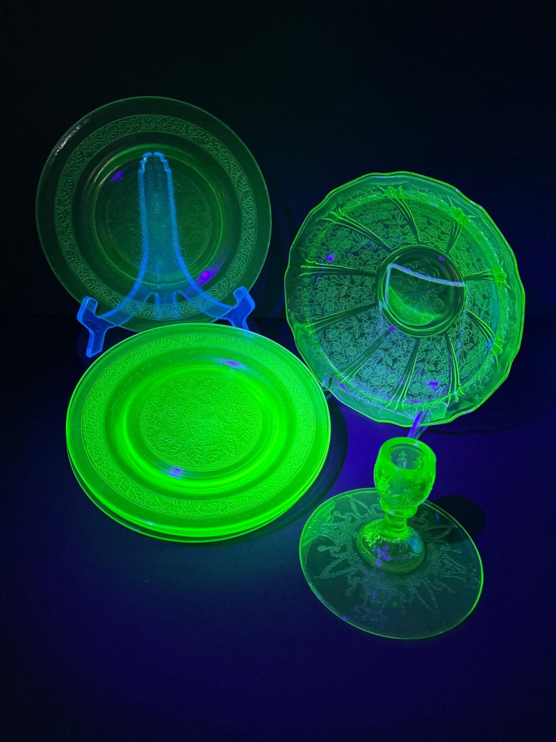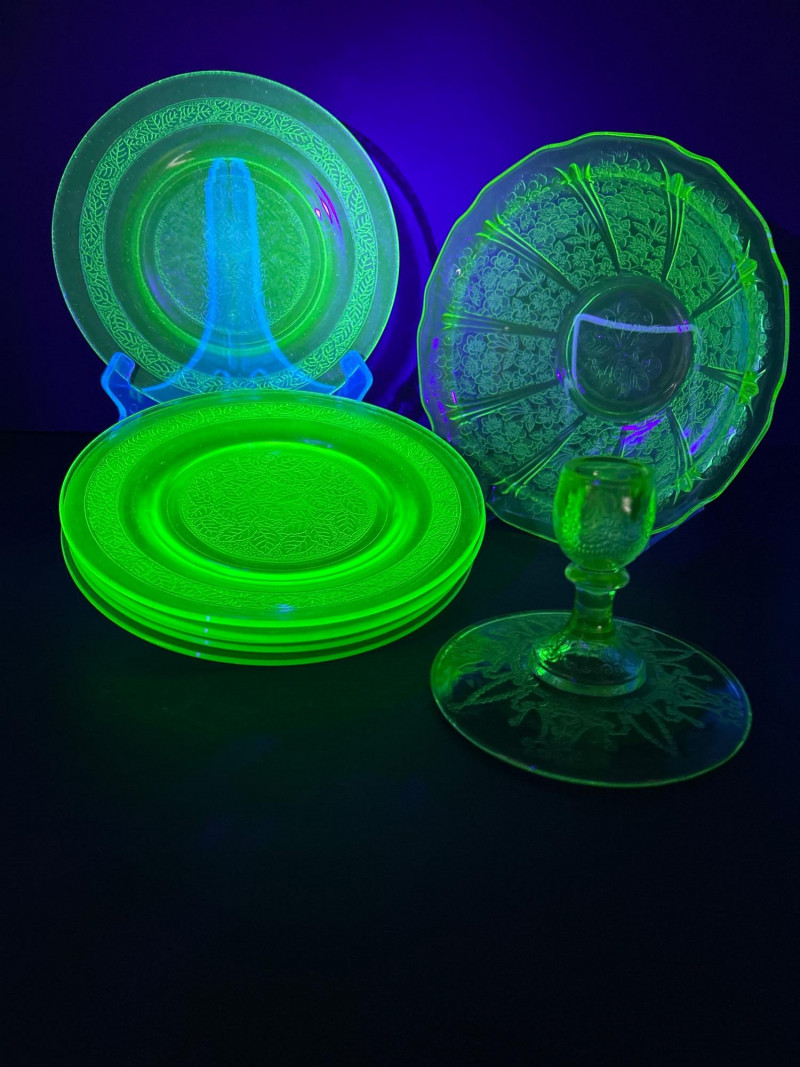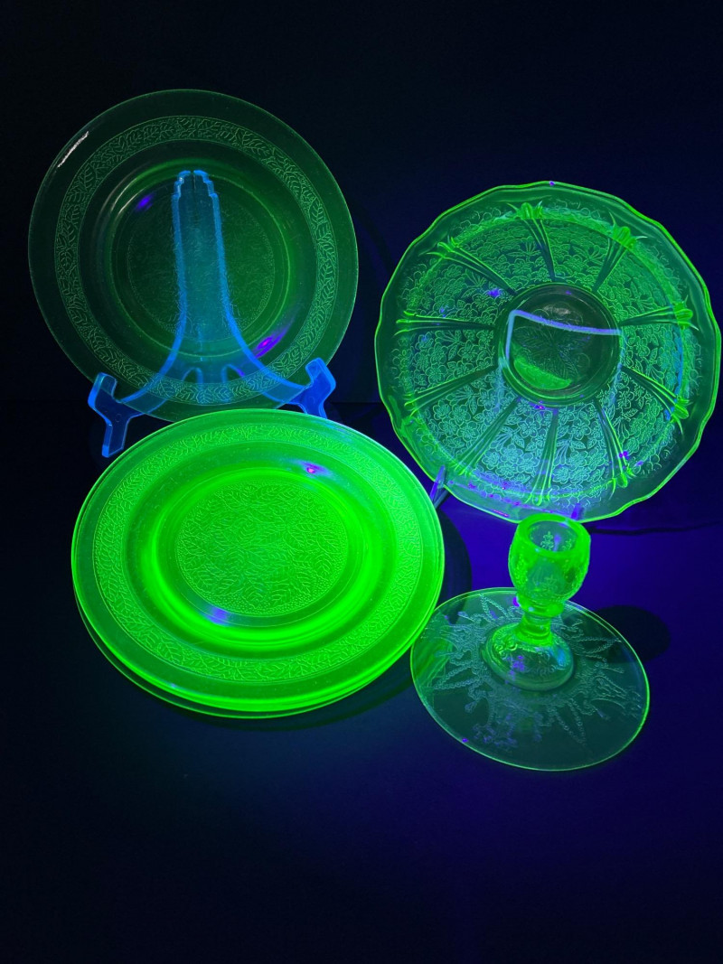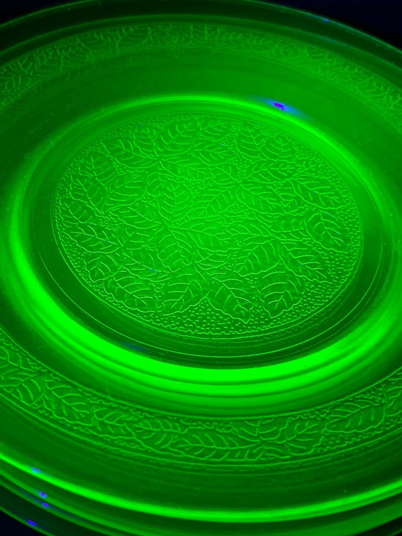Notes: Each plate glows brilliantly under UV light; intricate leaf-and-scroll border exemplifies Depression-era pressed glasswork.