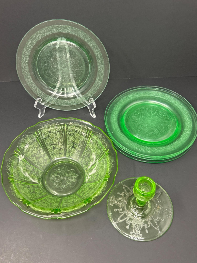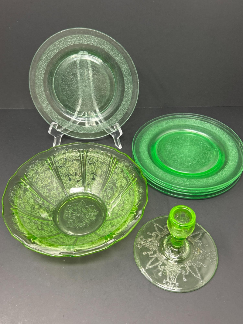 Lot # 60 - Uranium Green Depression Glass – Six Plates, Bowl and Candleholder