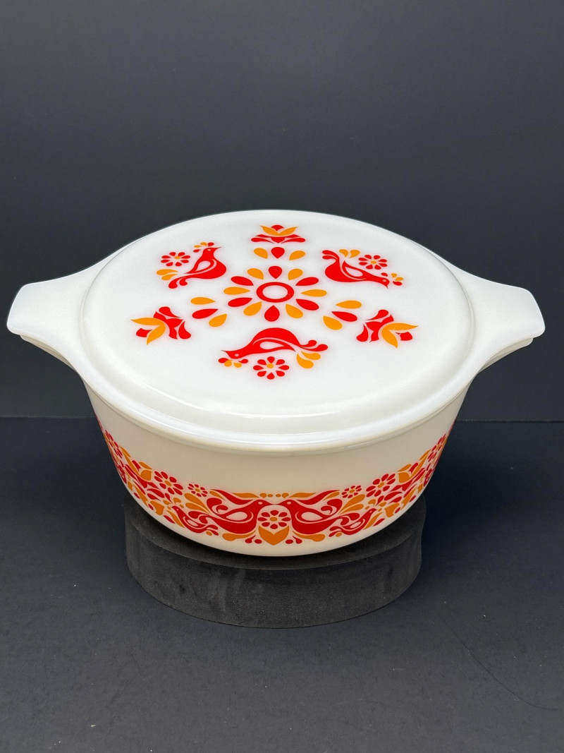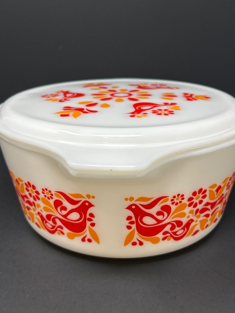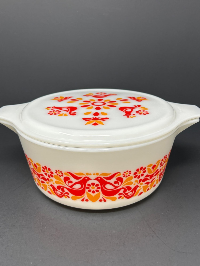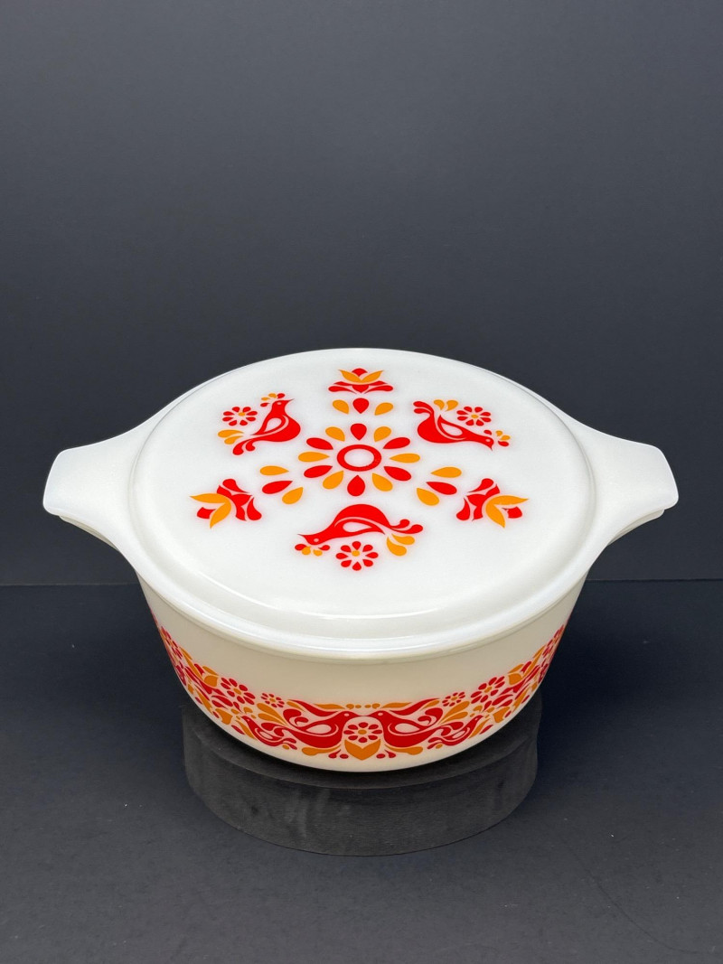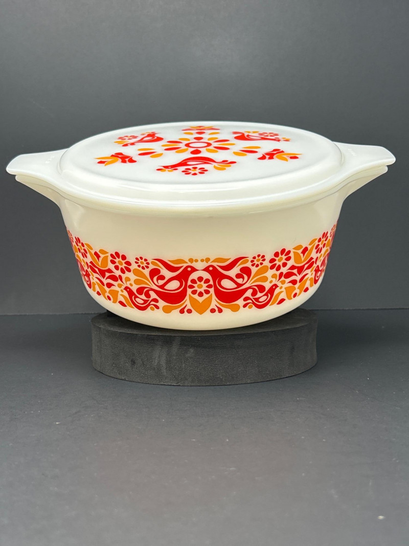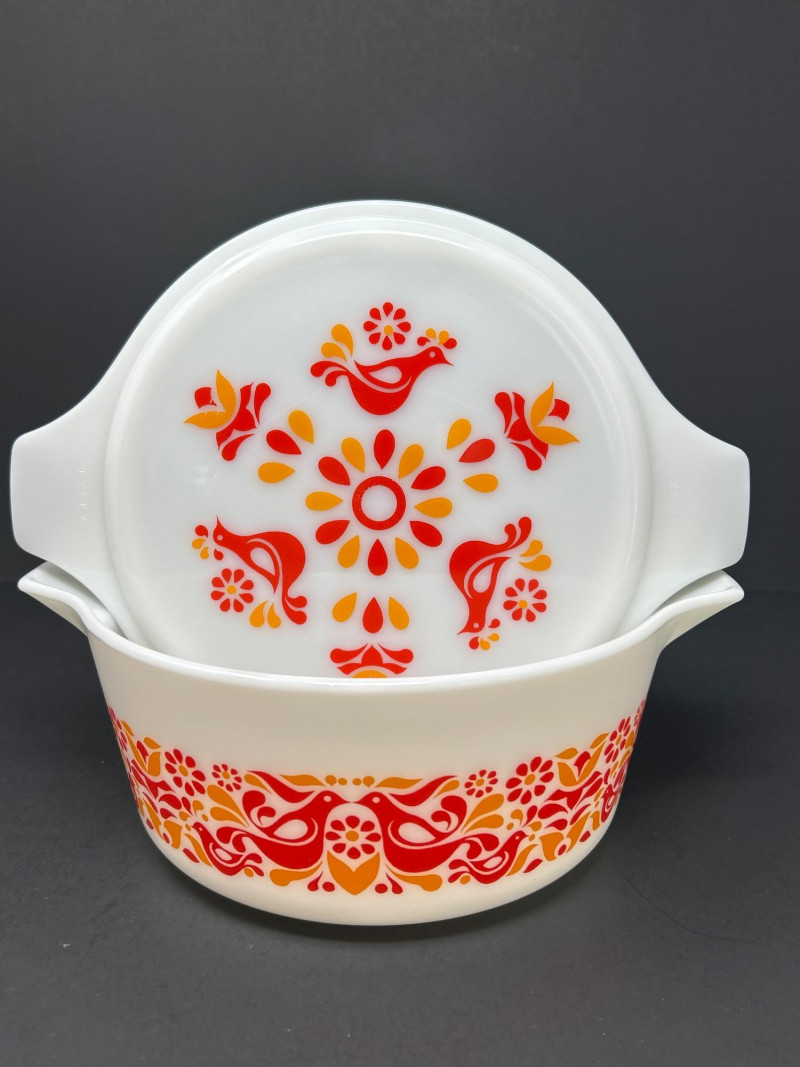 Cheerful and collectible Pyrex “Friendship” 475-B covered casserole featuring the vibrant red and orange folk-art bird motif on white opal glass. Produced in the early 1970s, this 2½-quart casserole includes its matching 475-C lid with coordinating floral design. A beloved pattern symbolizing warmth and community, it remains a favorite among mid-century kitchen collectors. Details: Maker: Pyrex (Corning Glass Works, USA) Pattern: Friendship Model: 475-B (base) with 475-C lid Capacity: 2½ quarts Material: Milk glass with fired-on enamel decoration Color: White with red and orange motifs Markings: Base: “475-B PYREX® MADE IN U.S.A.” Lid: “25–C 35” Measurements: Dish: 10 ¾″ L × 8 ¾″ W × 3 ⅞″ H (with handles); approx. 8 ⅛″ L without handles Lid: 11″ L × 8 ¾″ W × ¾″ H (with handles); approx. 8 ⅛″ diameter without handles Era: Circa 1971–1974