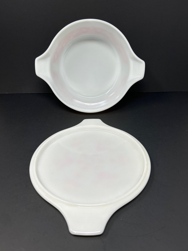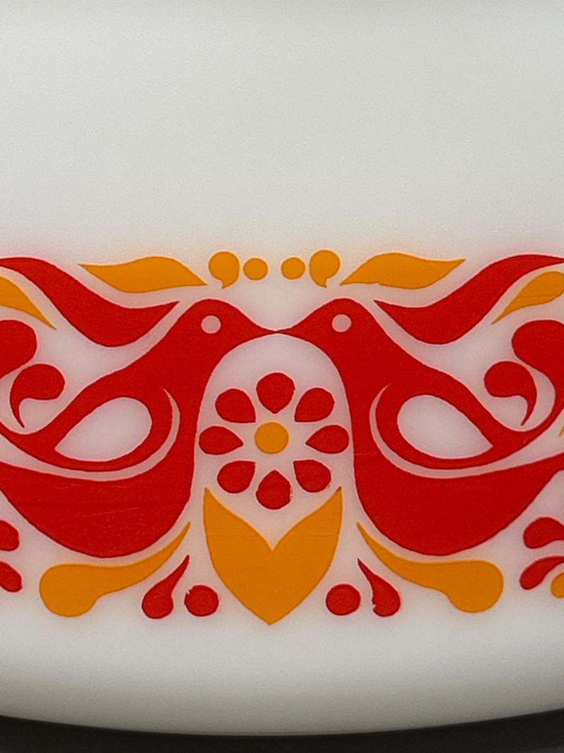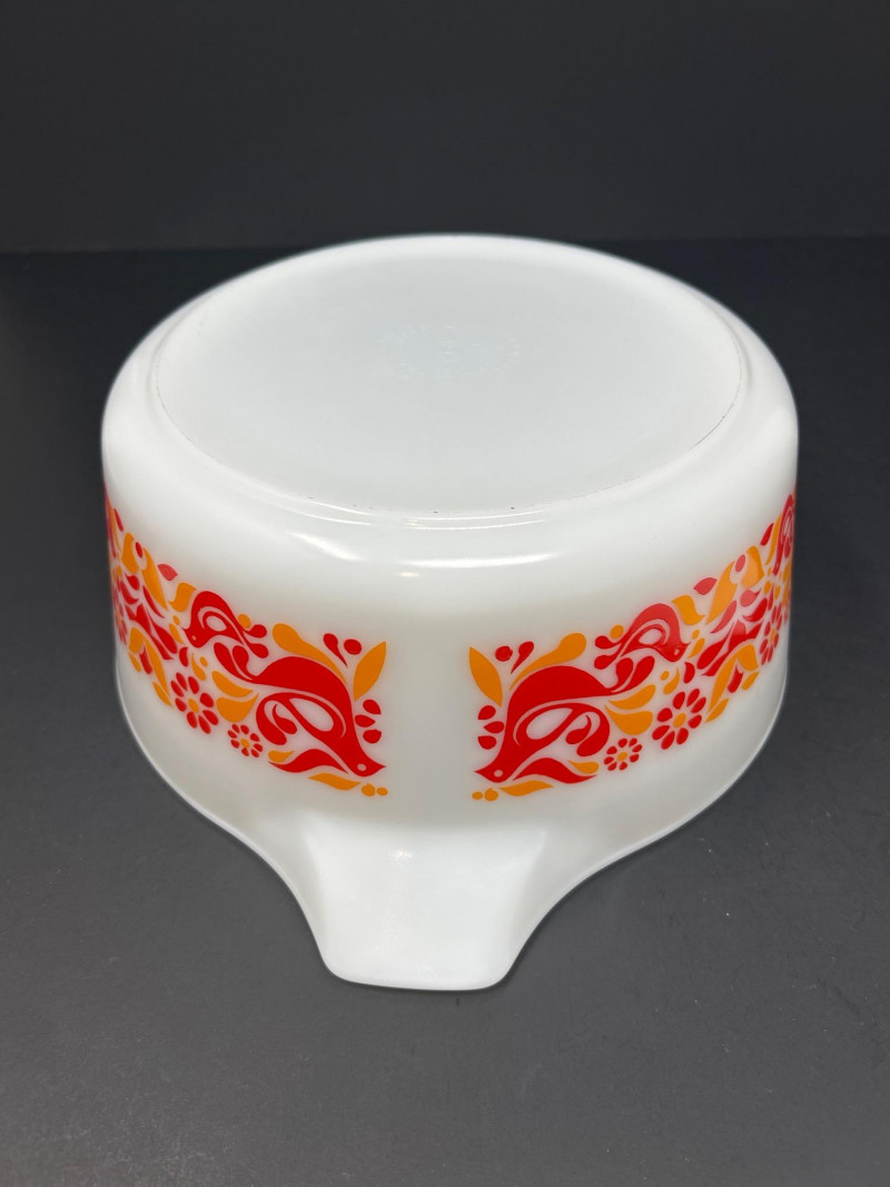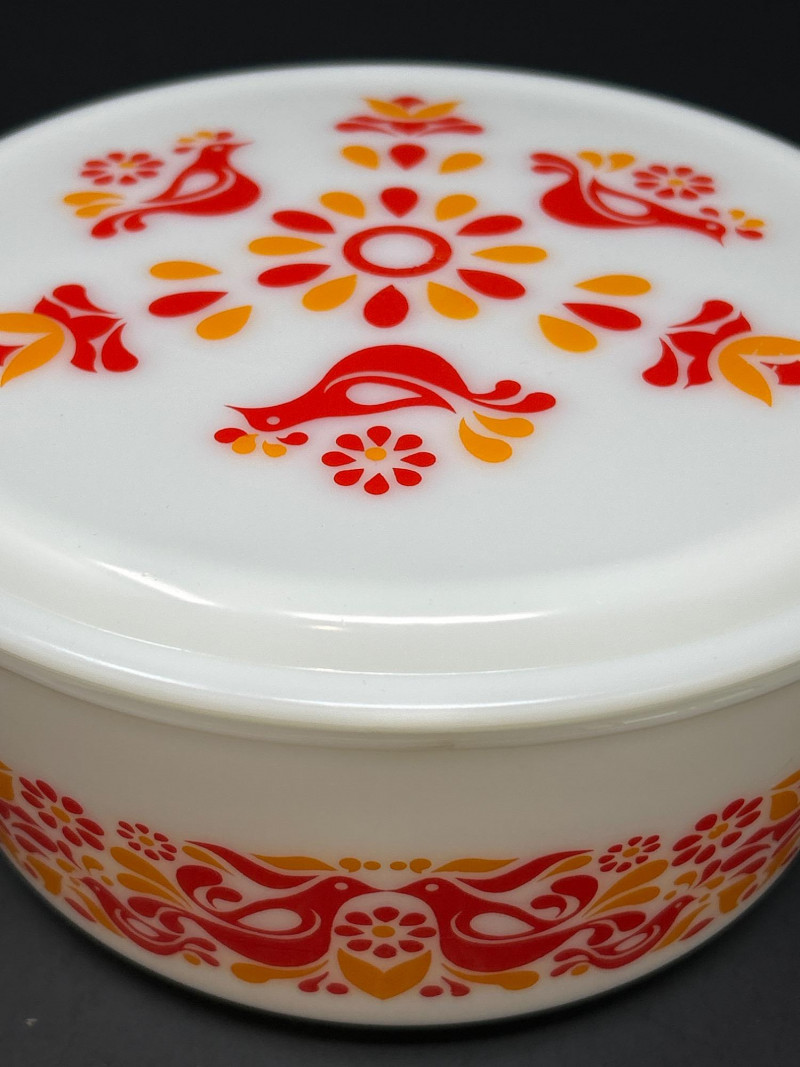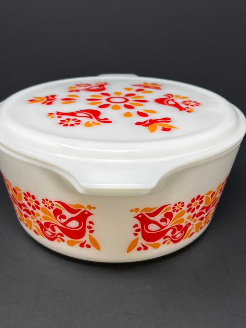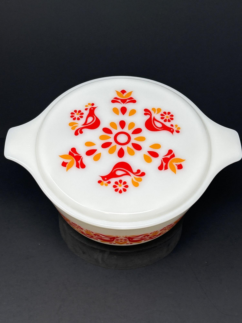 Cheerful and collectible Pyrex “Friendship” 475-B covered casserole featuring the vibrant red and orange folk-art bird motif on white opal glass. Produced in the early 1970s, this 2½-quart casserole includes its matching 475-C lid with coordinating floral design. A beloved pattern symbolizing warmth and community, it remains a favorite among mid-century kitchen collectors. Details: Maker: Pyrex (Corning Glass Works, USA) Pattern: Friendship Model: 475-B (base) with 475-C lid Capacity: 2½ quarts Material: Milk glass with fired-on enamel decoration Color: White with red and orange motifs Markings: Base: “475-B PYREX® MADE IN U.S.A.” Lid: “25–C 35” Measurements: Dish: 10 ¾″ L × 8 ¾″ W × 3 ⅞″ H (with handles); approx. 8 ⅛″ L without handles Lid: 11″ L × 8 ¾″ W × ¾″ H (with handles); approx. 8 ⅛″ diameter without handles Era: Circa 1971–1974