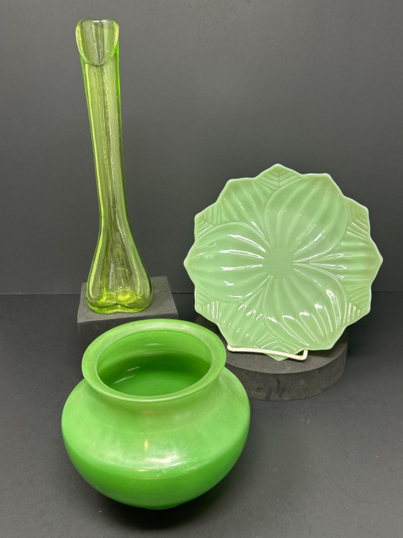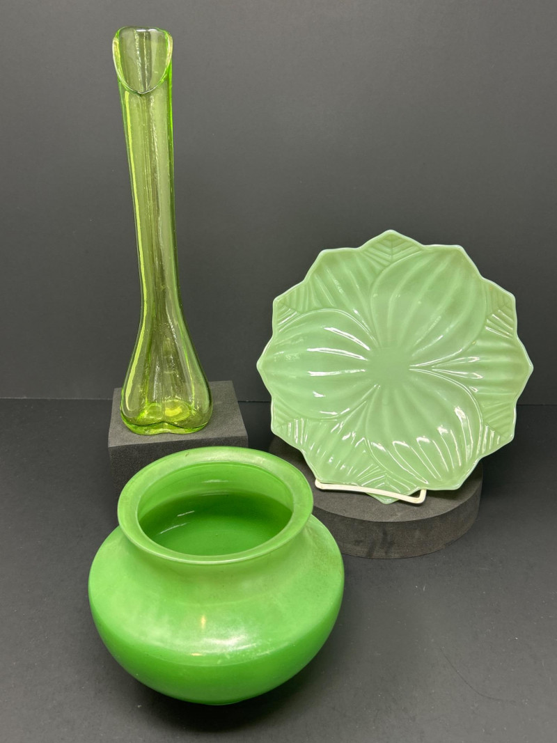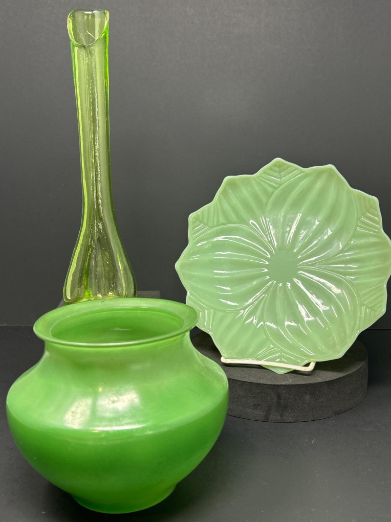 A refined trio of mid-century glass featuring a Fire-King Jadeite “Lotus Leaf and Blossom” Plate by Anchor Hocking, a Japanese Art Glass Swung Vase marked RIES Japan, and a Satin Jade-Green Art Glass Vase. Fire-King Jadeite Plate – “Lotus Leaf and Blossom” Japanese Art Glass Swung Vase Satin Jade-Green Art Glass Vase
