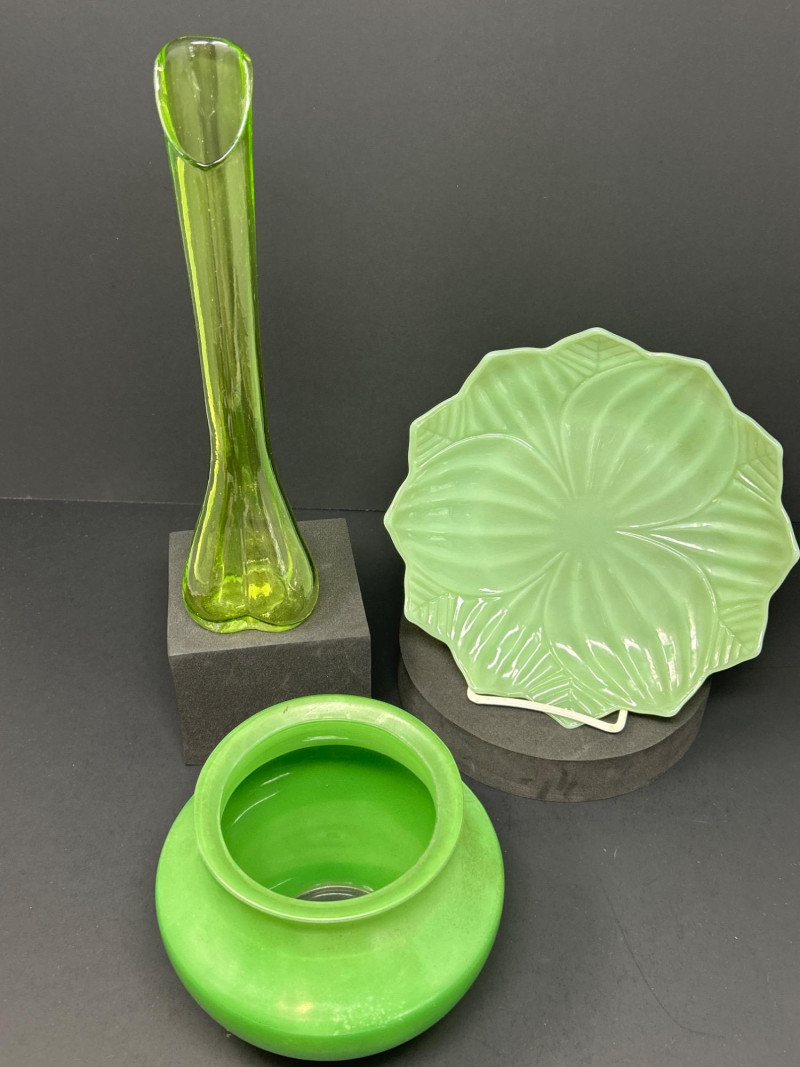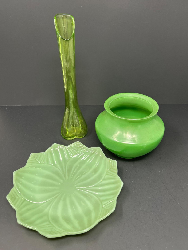 Lot # 64 - Fire-King Jadeite Plate and Two Mid-Century Green Art Glass Vases