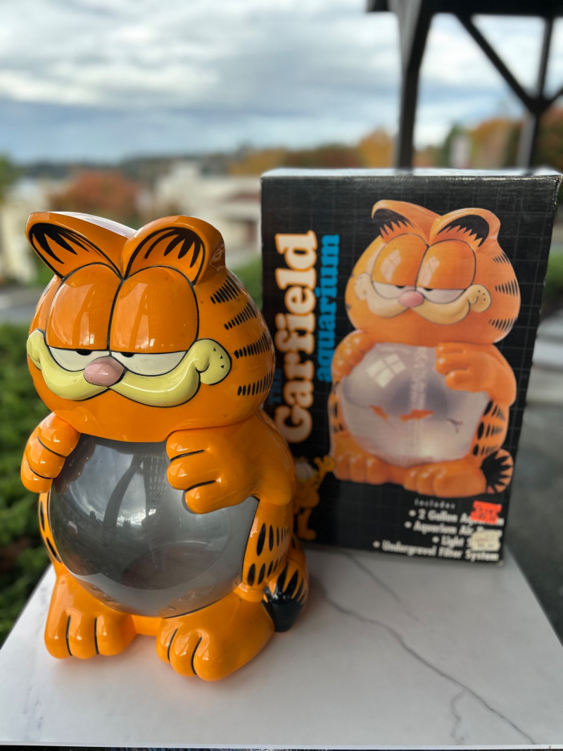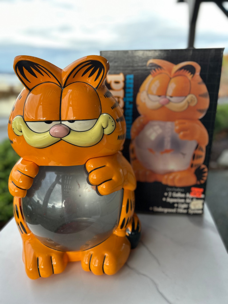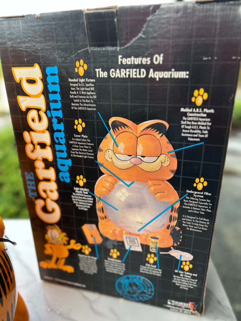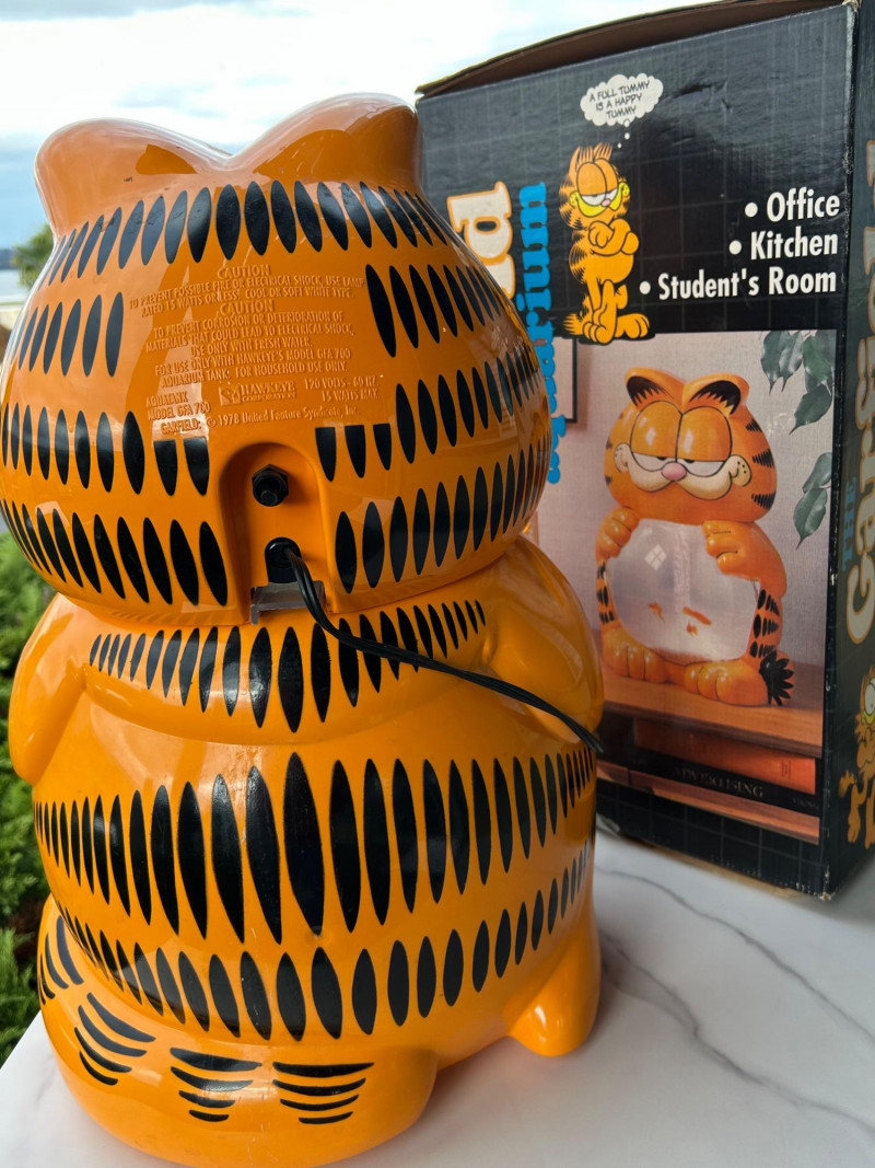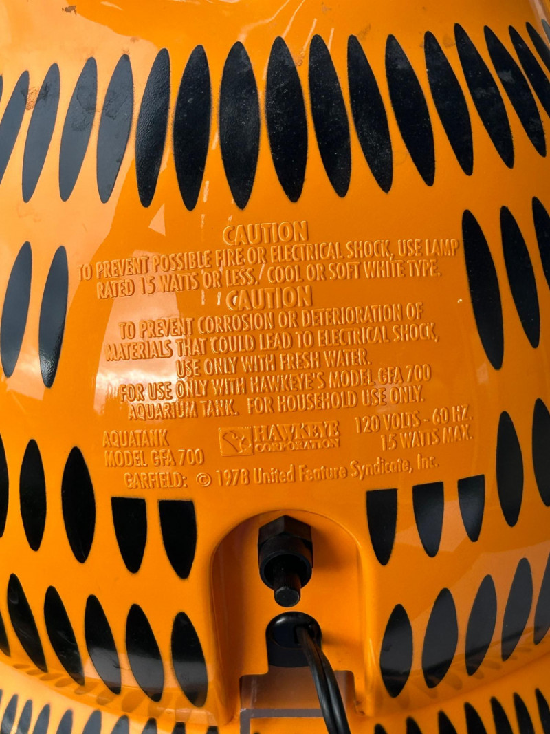 Vintage Garfield Aquarium produced by Hawkeye Corporation under license from United Feature Syndicate, Inc. (1978). This nostalgic two-gallon aquarium features Garfield holding a round clear fishbowl, complete with the original box, under-gravel filter system, air pump, and lighted hood assembly. Designed for freshwater use only, it doubles as both a functional aquarium and a collectible display piece perfect for a child’s room, study, or retro décor setup. Item Details: Manufacturer: Hawkeye Corporation Model: GFA-700 (Aquatank Series) Licensed by: United Feature Syndicate, Inc. (© 1978) Material: Molded ABS plastic with clear plastic tank insert Capacity: 2-gallon aquarium Includes: Light: Powers on; accepts 15 W max appliance bulb (not included) Motor: Powers on (untested with water) Condition: Light and motor both power on; riser tube is broken (see photo).