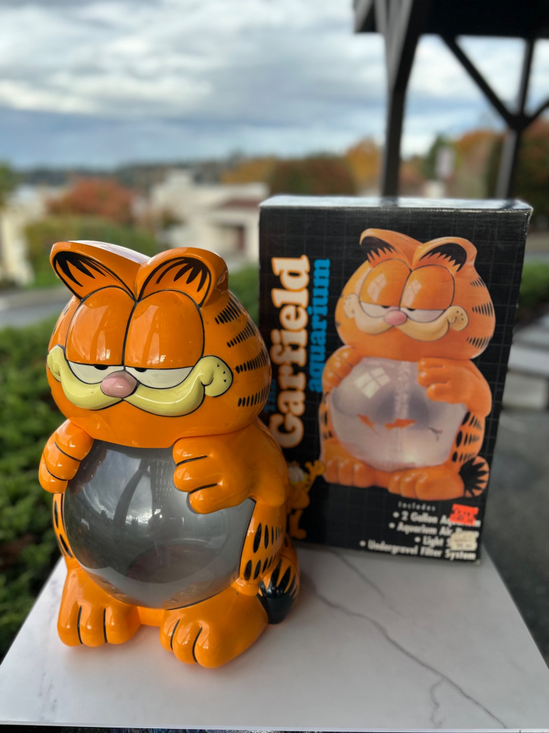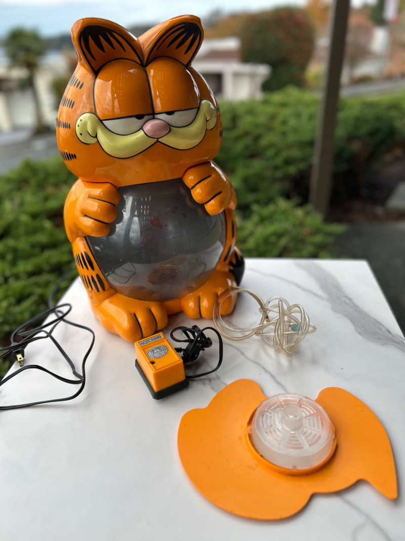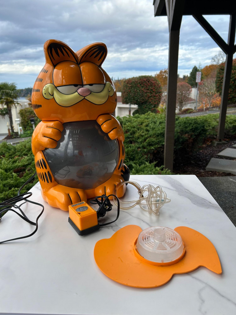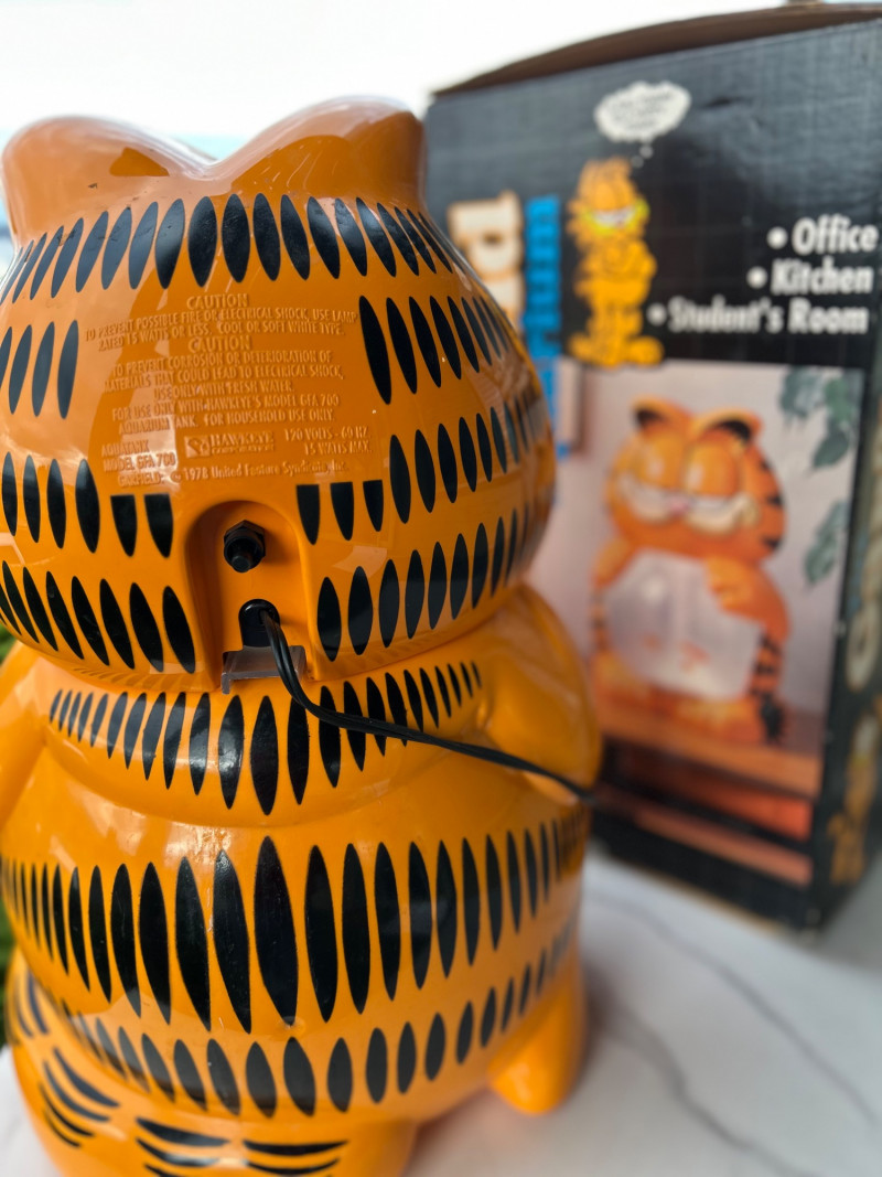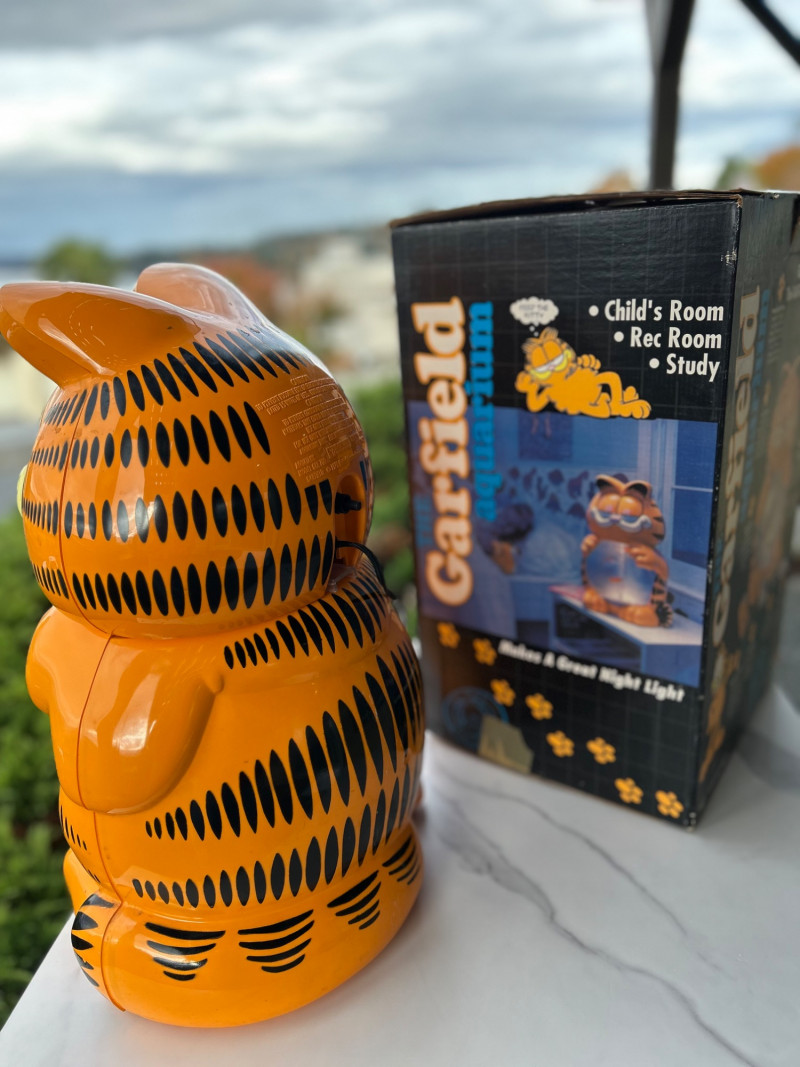 Vintage Garfield Aquarium produced by Hawkeye Corporation under license from United Feature Syndicate, Inc. (1978). This nostalgic two-gallon aquarium features Garfield holding a round clear fishbowl, complete with the original box, under-gravel filter system, air pump, and lighted hood assembly. Designed for freshwater use only, it doubles as both a functional aquarium and a collectible display piece perfect for a child’s room, study, or retro décor setup. Item Details: Manufacturer: Hawkeye Corporation Model: GFA-700 (Aquatank Series) Licensed by: United Feature Syndicate, Inc. (© 1978) Material: Molded ABS plastic with clear plastic tank insert Capacity: 2-gallon aquarium Includes: Light: Powers on; accepts 15 W max appliance bulb (not included) Motor: Powers on (untested with water) Condition: Light and motor both power on; riser tube is broken (see photo).