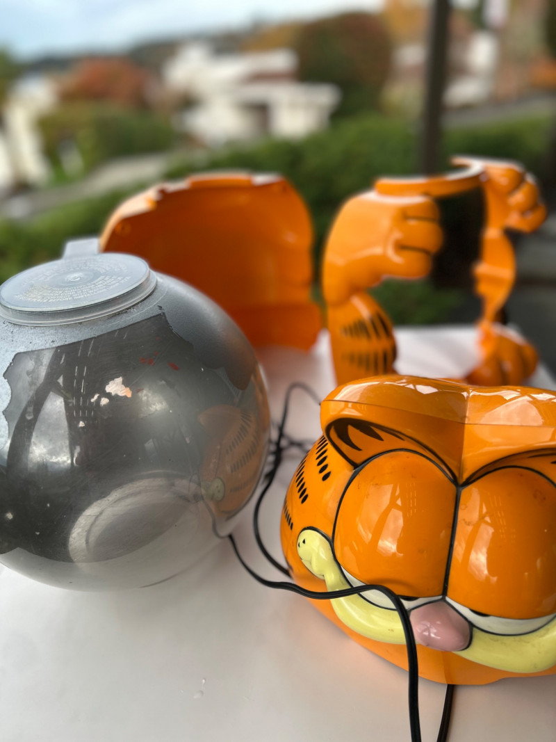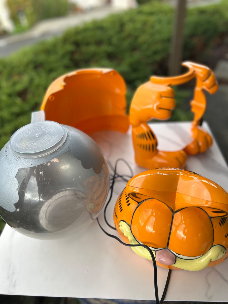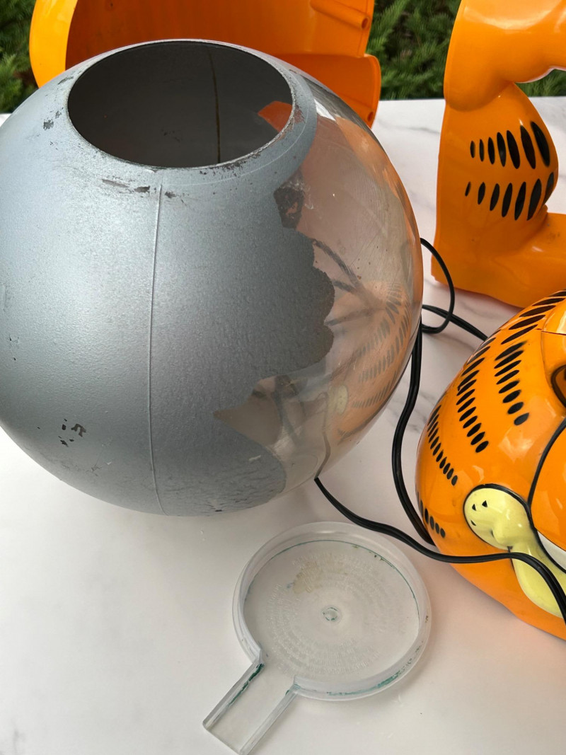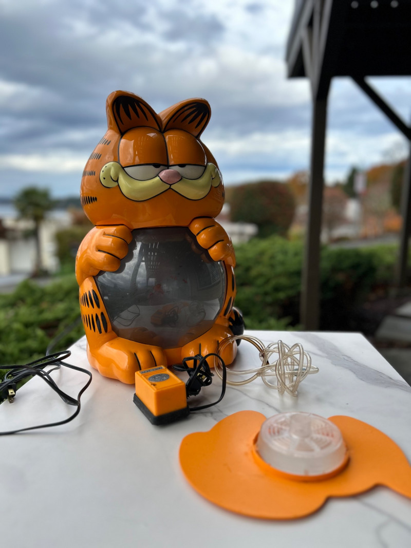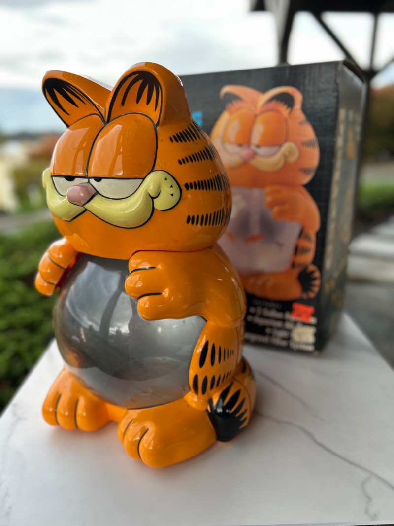 Vintage Garfield Aquarium produced by Hawkeye Corporation under license from United Feature Syndicate, Inc. (1978). This nostalgic two-gallon aquarium features Garfield holding a round clear fishbowl, complete with the original box, under-gravel filter system, air pump, and lighted hood assembly. Designed for freshwater use only, it doubles as both a functional aquarium and a collectible display piece perfect for a child’s room, study, or retro décor setup. Item Details: Manufacturer: Hawkeye Corporation Model: GFA-700 (Aquatank Series) Licensed by: United Feature Syndicate, Inc. (© 1978) Material: Molded ABS plastic with clear plastic tank insert Capacity: 2-gallon aquarium Includes: Light: Powers on; accepts 15 W max appliance bulb (not included) Motor: Powers on (untested with water) Condition: Light and motor both power on; riser tube is broken (see photo).