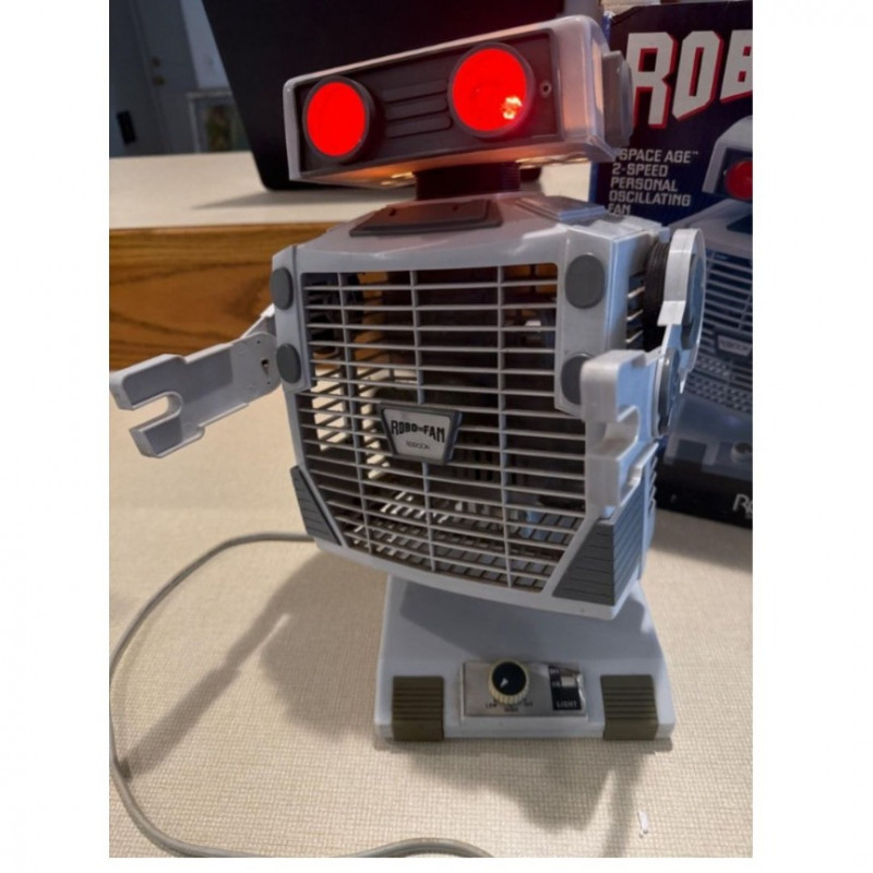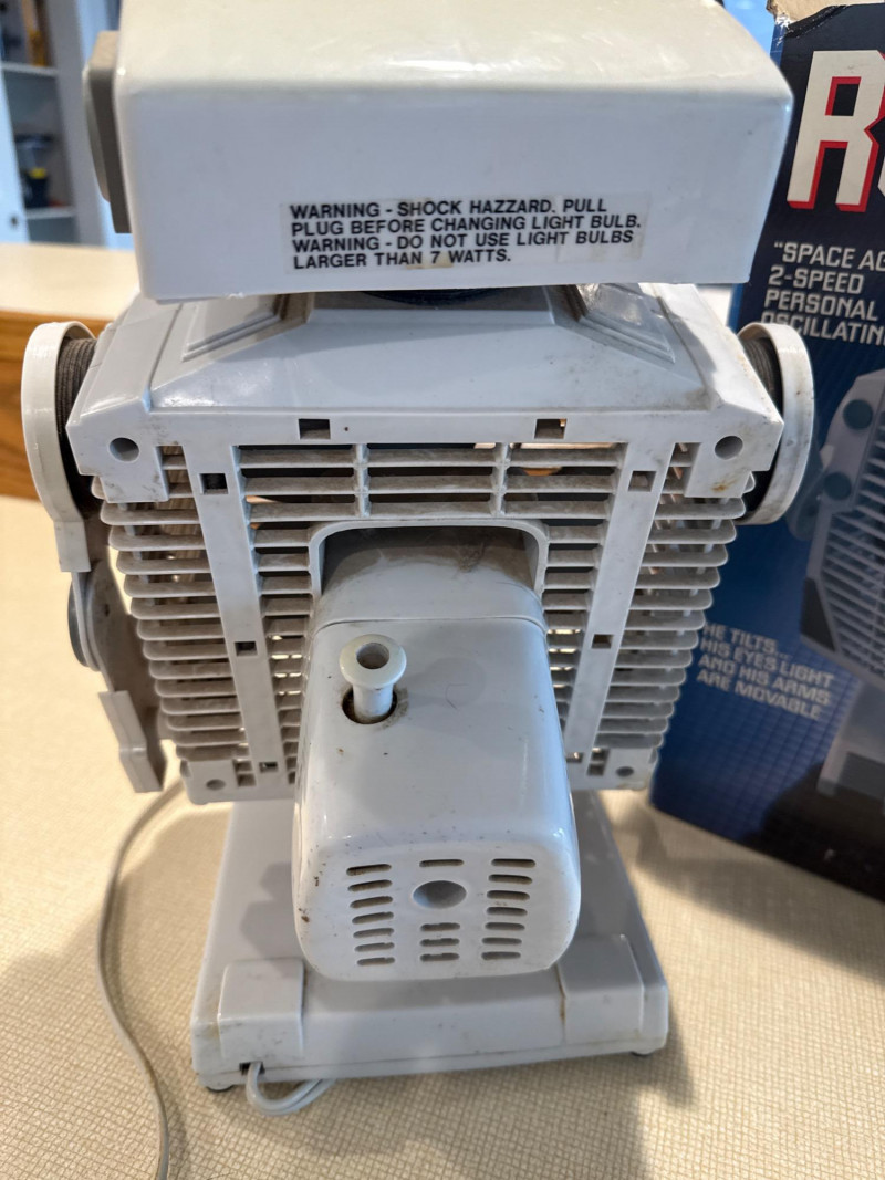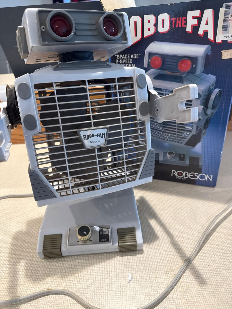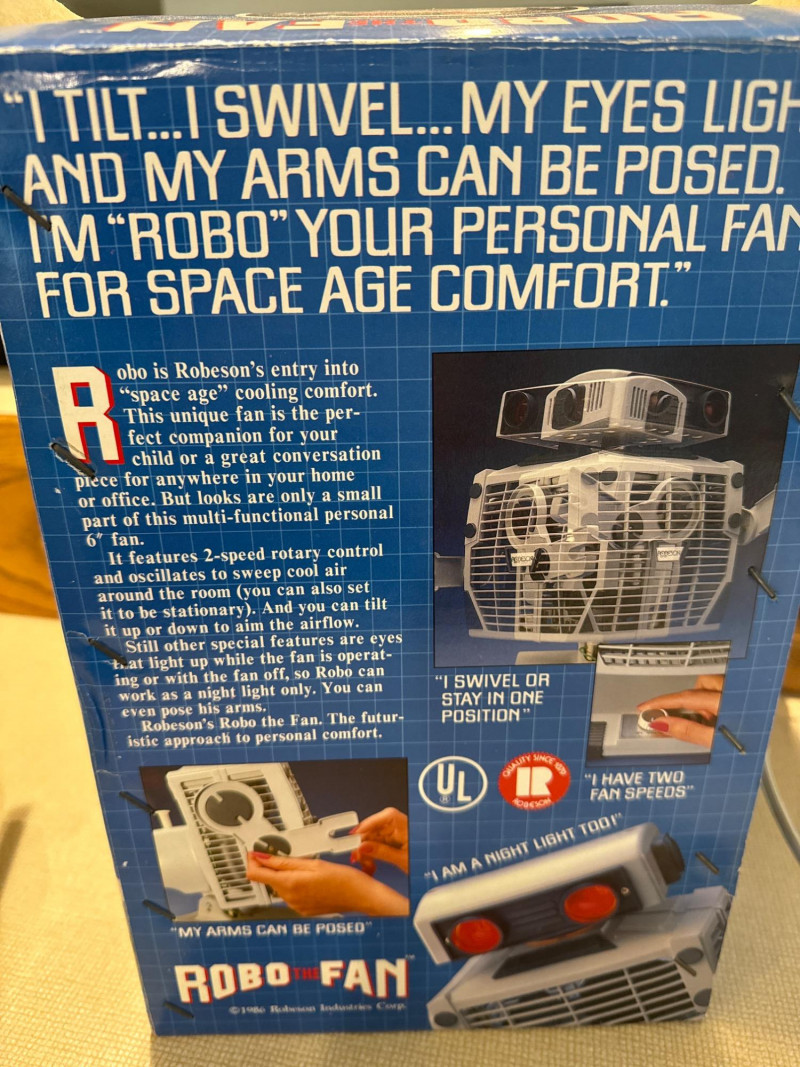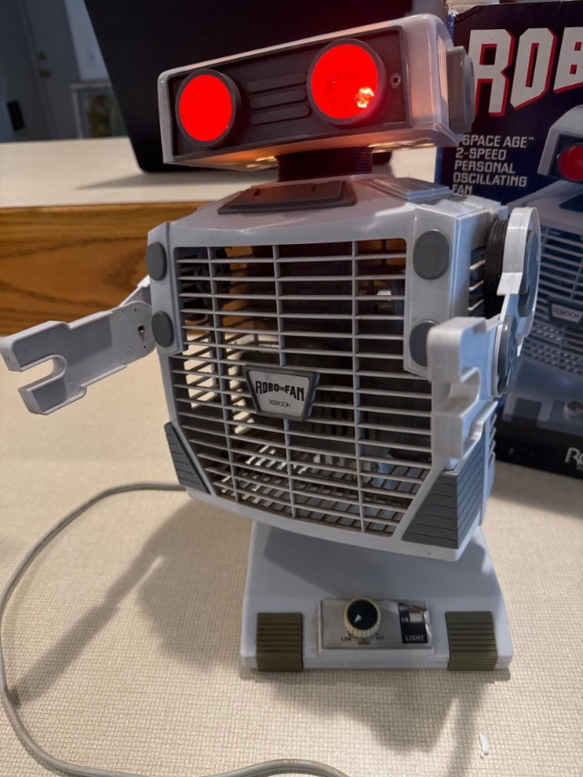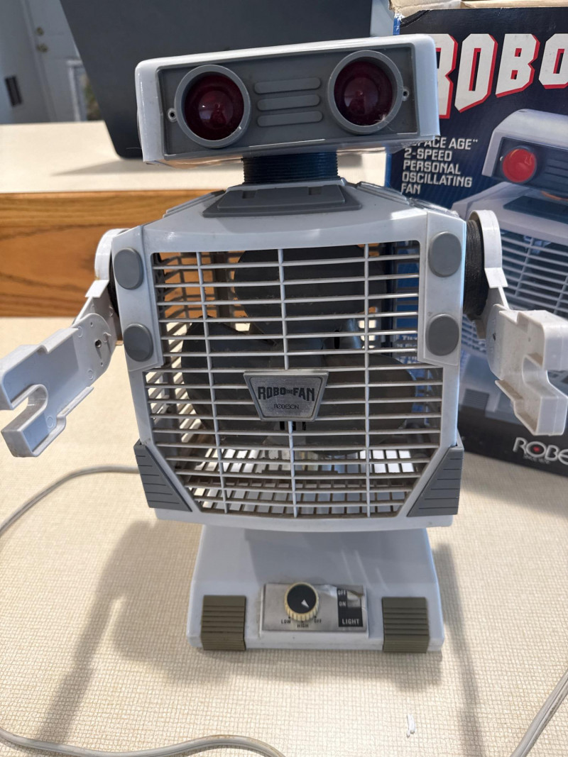 Retro-futuristic charm meets functionality in this Robeson “Robo the Fan”, a whimsical 1980s collectible appliance styled as a robot companion. The fan features a tilting and swiveling body with movable arms and light-up red “eyes”that glow when powered on. Promoted as a “space age” comfort fan, this unit offers two-speed settings and an oscillating function for directional airflow. Robo’s playful personality and distinctive design make it a standout piece of vintage décor—ideal for fans of retro robotics, novelty appliances, or mid-century modern tech nostalgia. Comes with its original box showcasing colorful period graphics. Item Details: Brand: Robeson Industries Corp. Model: “Robo the Fan” Era: Circa mid-1980s Features: Dual fan speeds (Low / High) Oscillating or stationary operation Tilting body and adjustable arms Illuminated red “eyes” (light function works) Controls: Rotary dial for fan speed and separate switch for light Condition: Tested – fan and lights work. Motor powers on, oscillation functional. Markings: “Robeson” label on front grille; safety label on rear panel Includes: Original retail box