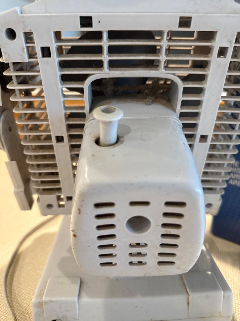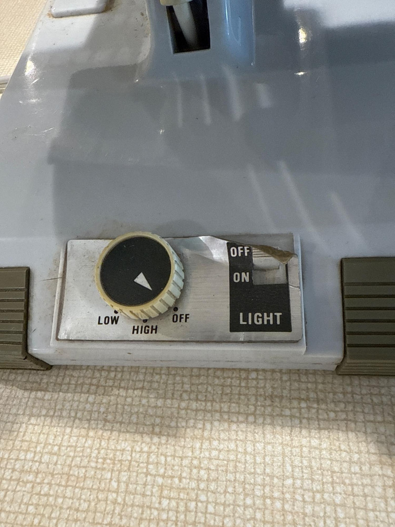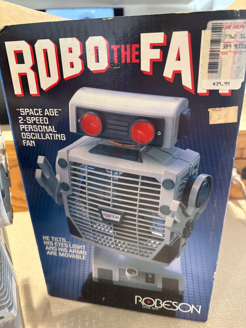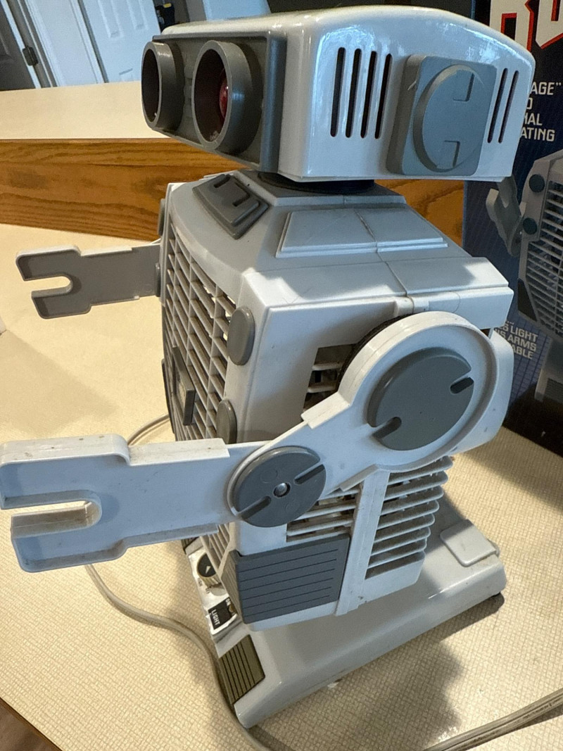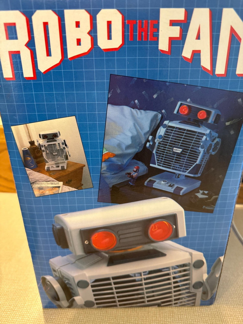 Retro-futuristic charm meets functionality in this Robeson “Robo the Fan”, a whimsical 1980s collectible appliance styled as a robot companion. The fan features a tilting and swiveling body with movable arms and light-up red “eyes”that glow when powered on. Promoted as a “space age” comfort fan, this unit offers two-speed settings and an oscillating function for directional airflow. Robo’s playful personality and distinctive design make it a standout piece of vintage décor—ideal for fans of retro robotics, novelty appliances, or mid-century modern tech nostalgia. Comes with its original box showcasing colorful period graphics. Item Details: Brand: Robeson Industries Corp. Model: “Robo the Fan” Era: Circa mid-1980s Features: Dual fan speeds (Low / High) Oscillating or stationary operation Tilting body and adjustable arms Illuminated red “eyes” (light function works) Controls: Rotary dial for fan speed and separate switch for light Condition: Tested – fan and lights work. Motor powers on, oscillation functional. Markings: “Robeson” label on front grille; safety label on rear panel Includes: Original retail box