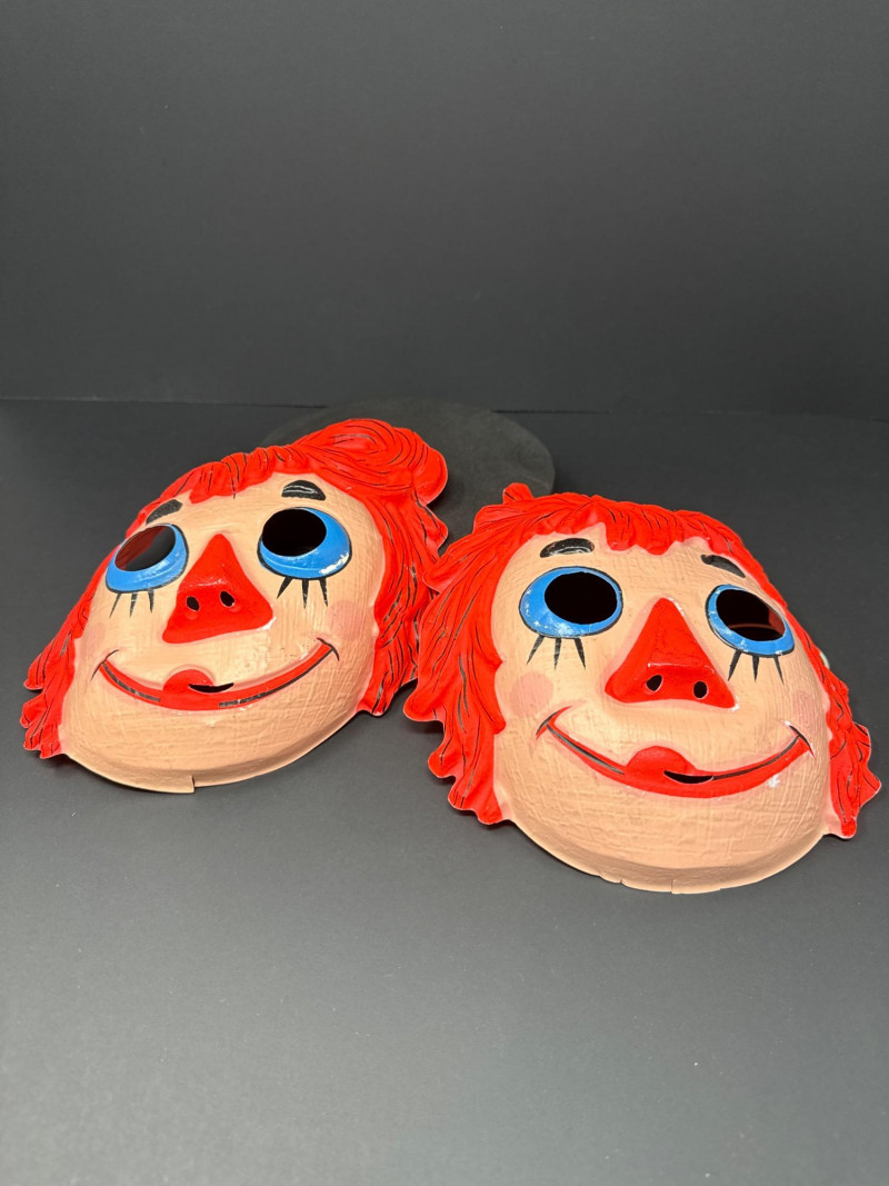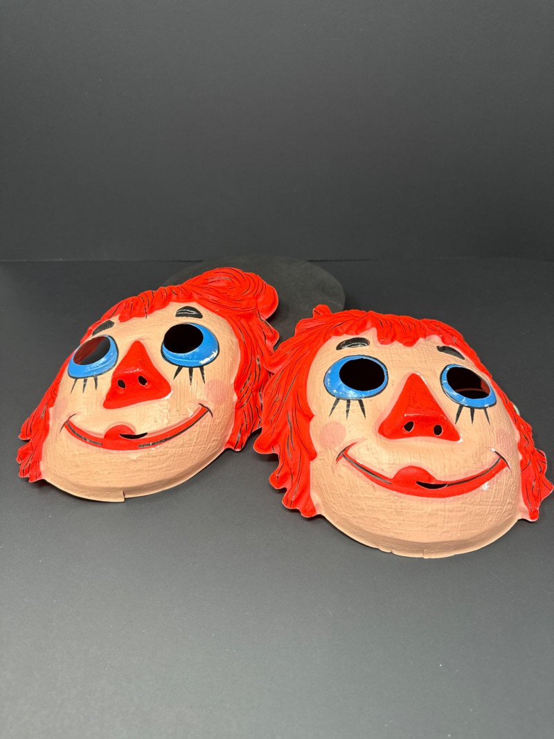 Pair of vintage Raggedy Ann Halloween costume masks produced by Ben Cooper, Inc. in 1972 under license from The Bobbs-Merrill Co.. These classic vacuform plastic masks feature bright painted details—red hair, blue eyes, and rosy cheeks—with original elastic straps and one still retaining its Kmart price tag (64¢). These masks were marketed as flame-resistant and comfortable fit children’s costume pieces, a nostalgic reminder of mid-century trick-or-treat culture. Item Details: Maker: Ben Cooper, Inc. Character: Raggedy Ann Year: 1972 Material: Vacuform plastic with painted details Origin: Brooklyn, New York, USA Retail Tag: Original Kmart sticker ($0.64) on one mask Size: Child-sized, approx. 7½" H × 6½" W each Condition: One mask has a small tear at the bottom; both show minor age wear consistent with use. Colors remain vivid and overall good shape for their age. Markings: ©1972 The Bobbs-Merrill Co., Inc. / Ben Cooper, Inc. Brooklyn, N.Y.