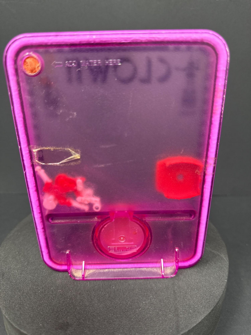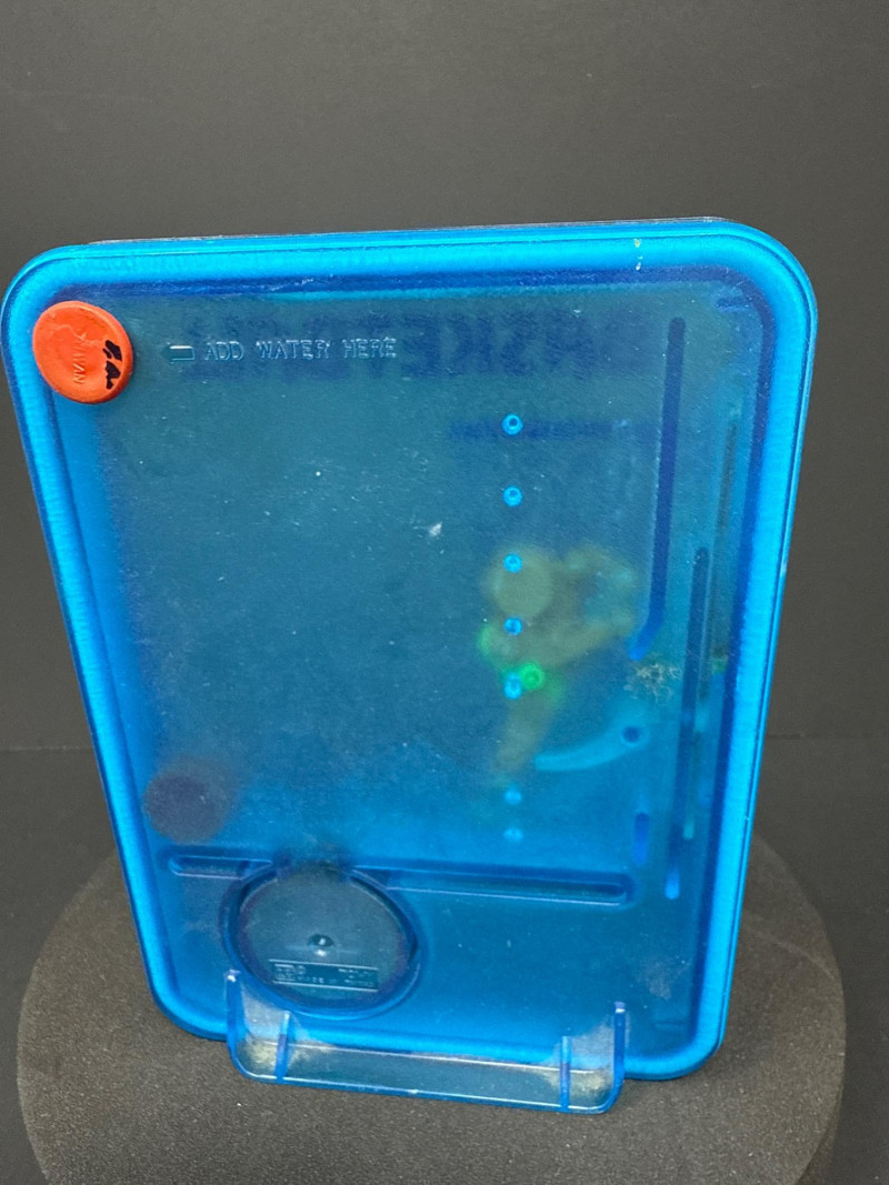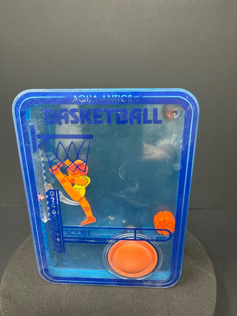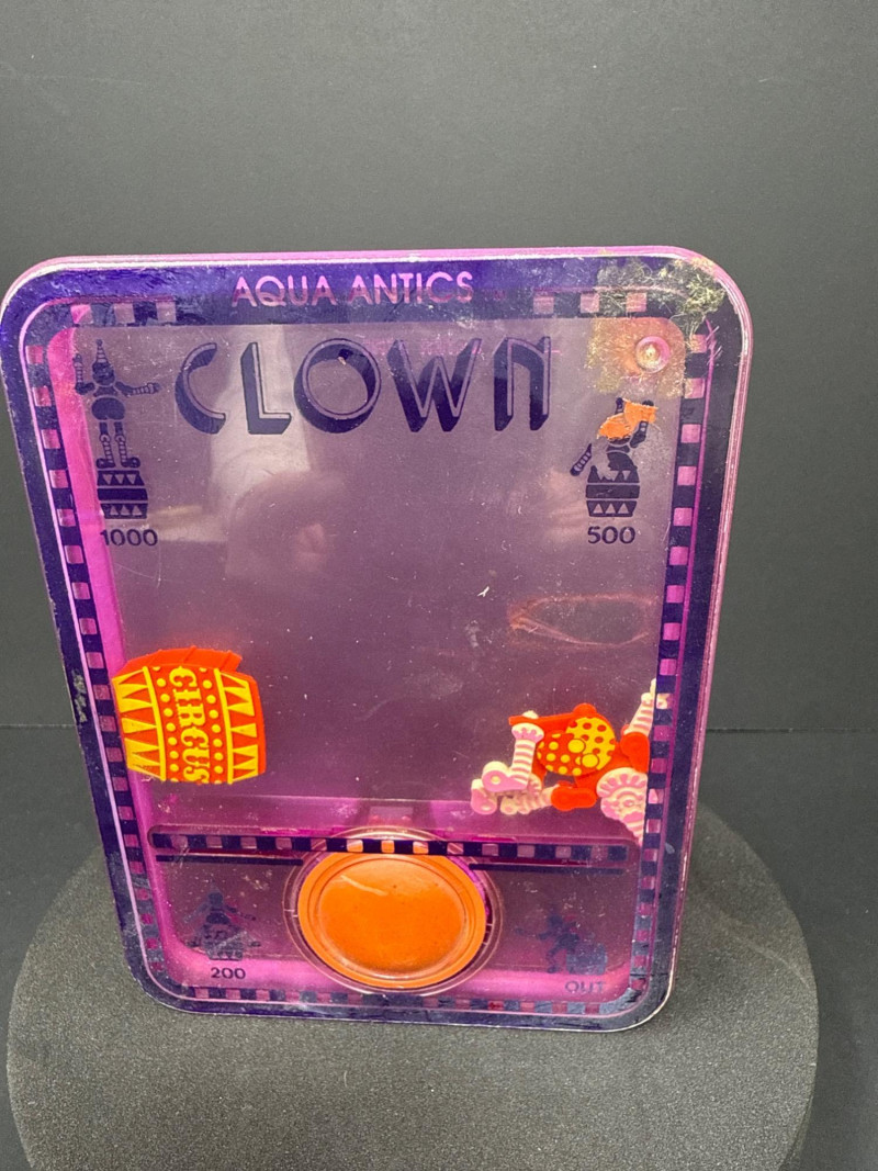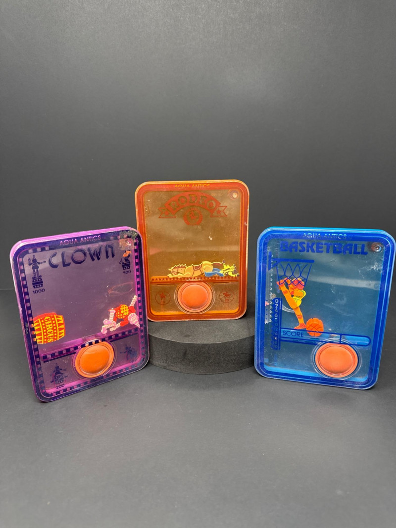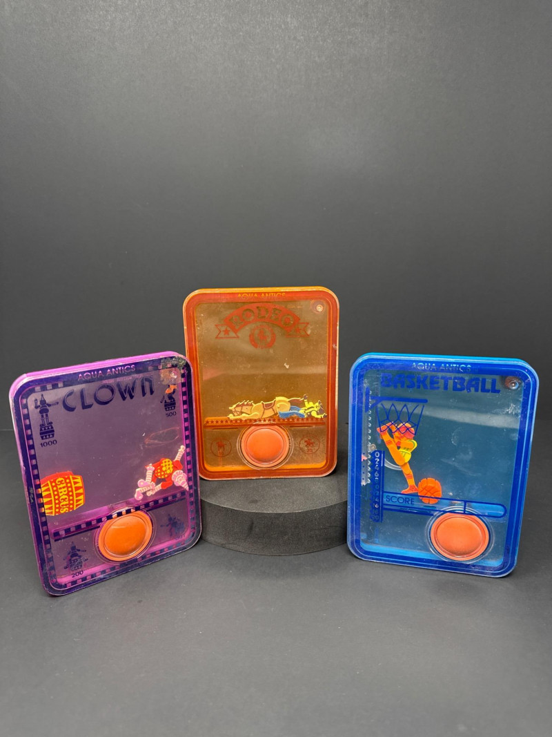 Colorful trio of vintage Aqua Antics water games, each with a charming translucent case and orange push button. The set includes Clown, Rodeo, and Basketball themes—each featuring playful graphics and simple push-to-play action. Perfect for collectors of retro toys or nostalgic 1980s–1990s handheld novelties. Details: Maker: Aqua Antics Themes: Clown (Circus motif), Rodeo (Horse & Rider), Basketball (Hoop & Ball) Material: Plastic with water-filled interior Colors: Purple, orange, and blue Dimensions: Approximately 6" H × 4" W each