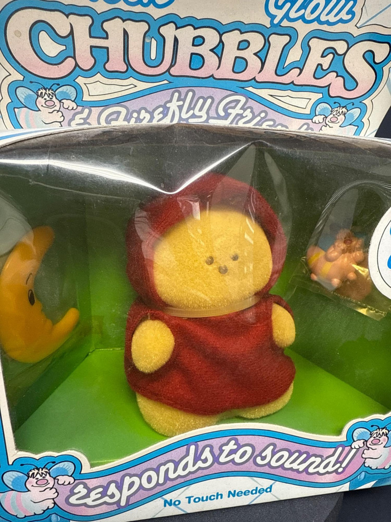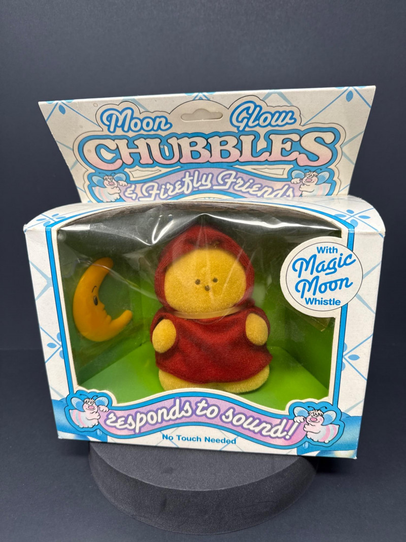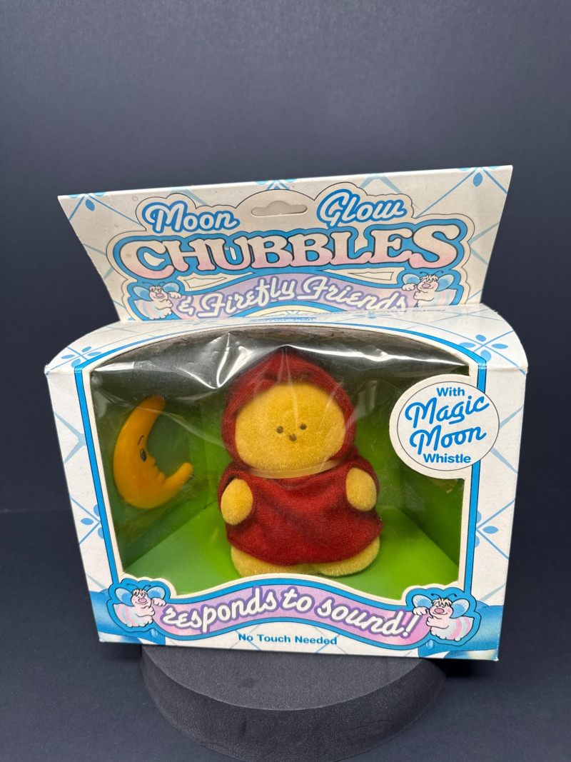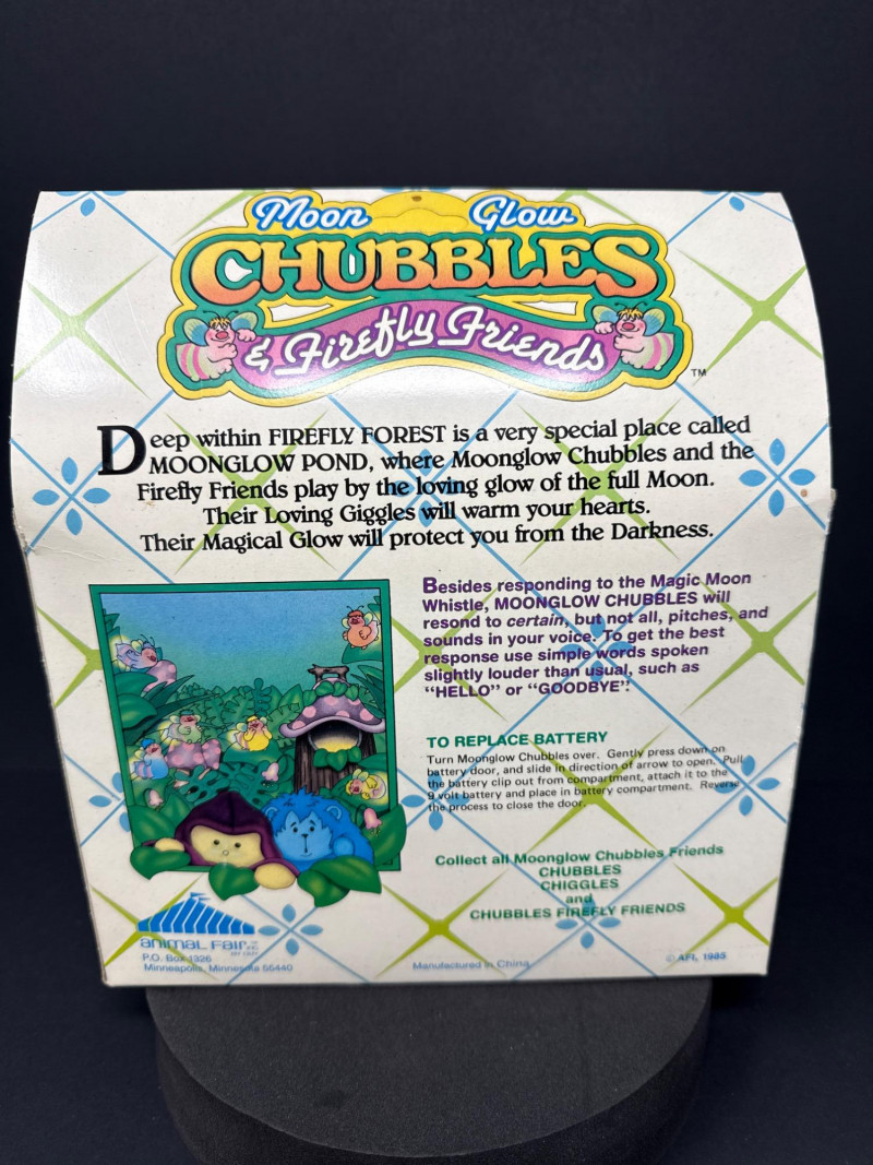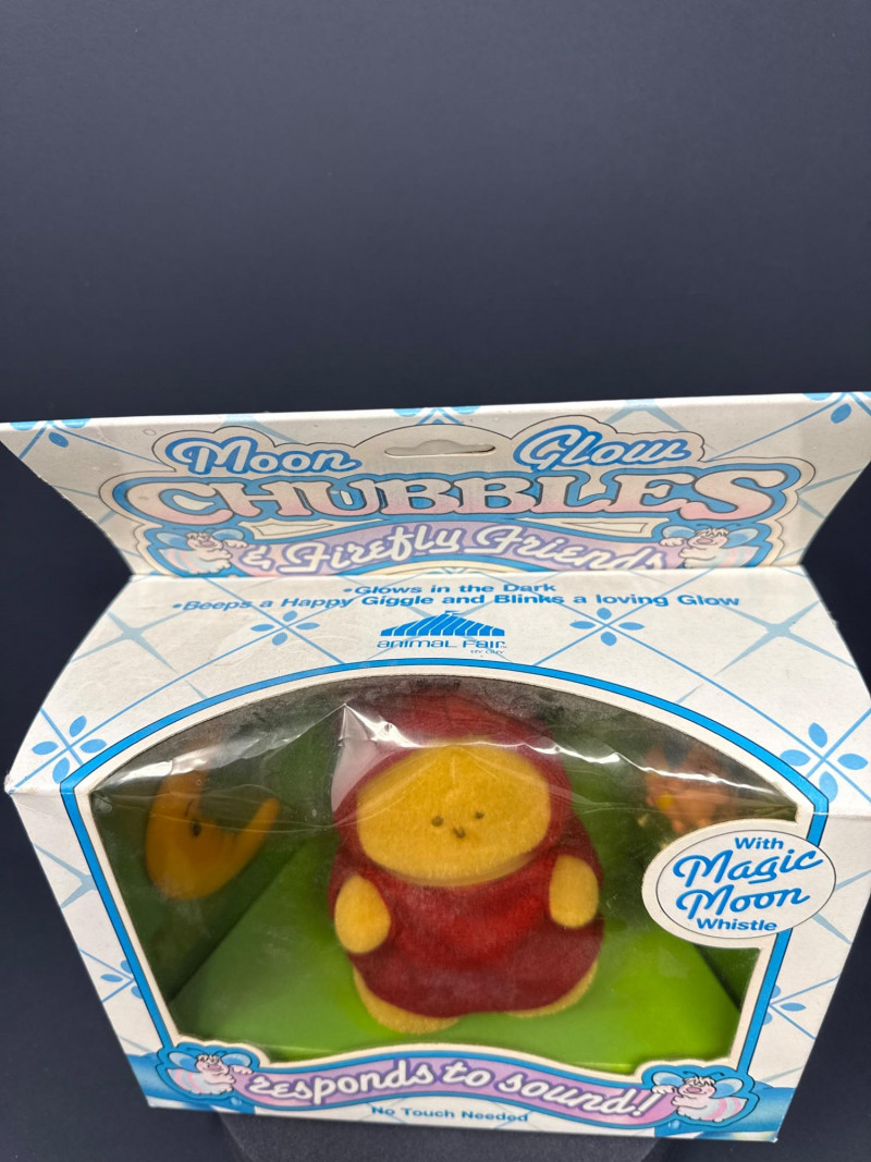 A charming 1985 MoonGlow Chubbles & Firefly Friends toy by Animal Fair, Minneapolis. This adorable vintage character, dressed in a fuzzy red hooded outfit, was designed to respond to sound—including the included Magic Moon Whistle—without touch. The toy glows softly in the dark and was part of the nostalgic Chubbles line known for their comforting nighttime play and whimsical forest backstory. The box features vibrant graphics and original retail stickers, narrating the magical tale of Moonglow Pond and its glowing friends. This piece is ideal for collectors of 1980s electronic plush toys or retro children’s items. Item Details: Brand: Animal Fair, Minneapolis, MN Series: MoonGlow Chubbles & Firefly Friends Year: 1985 Made in: China Features: Responds to sound and whistle (no touch needed) Includes Magic Moon Whistle accessory Glow-in-the-dark elements Packaging Condition: Box shows visible wear, discoloration, and creasing. Age Recommendation: 3 years and up