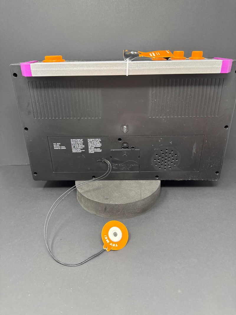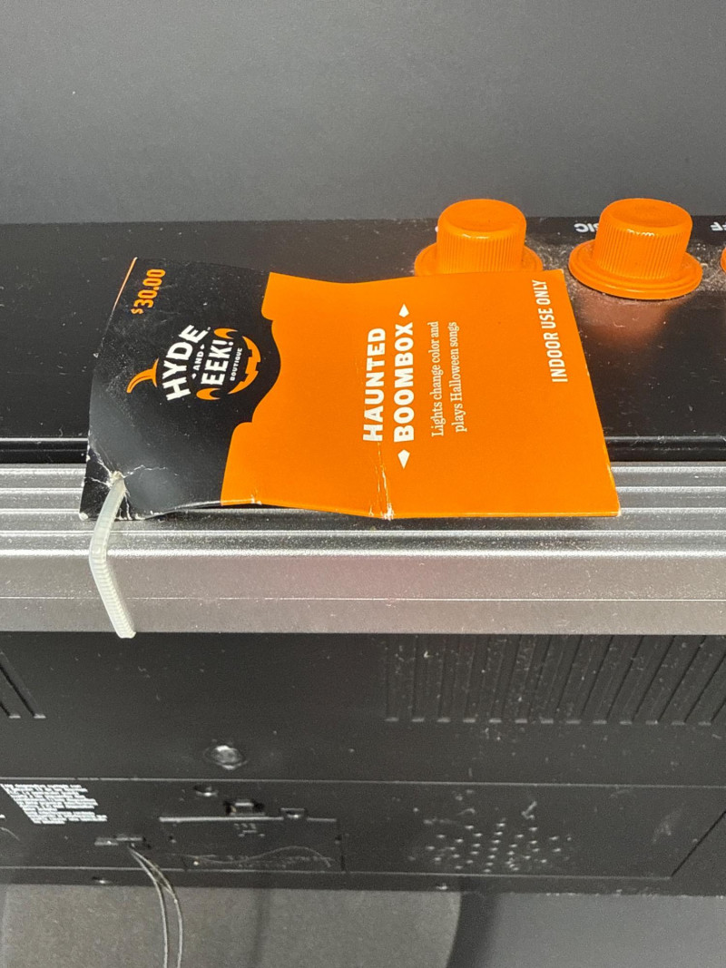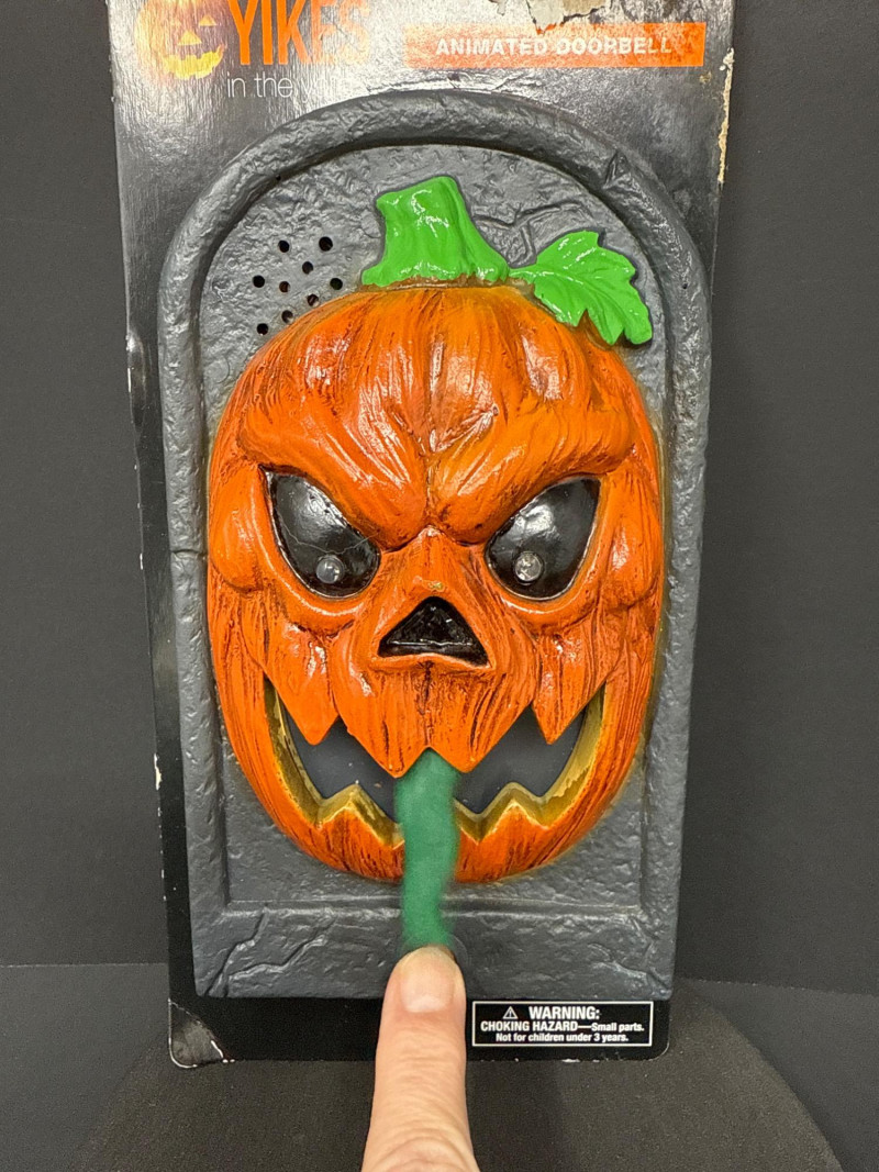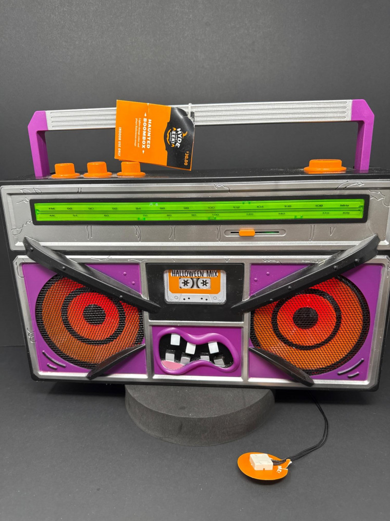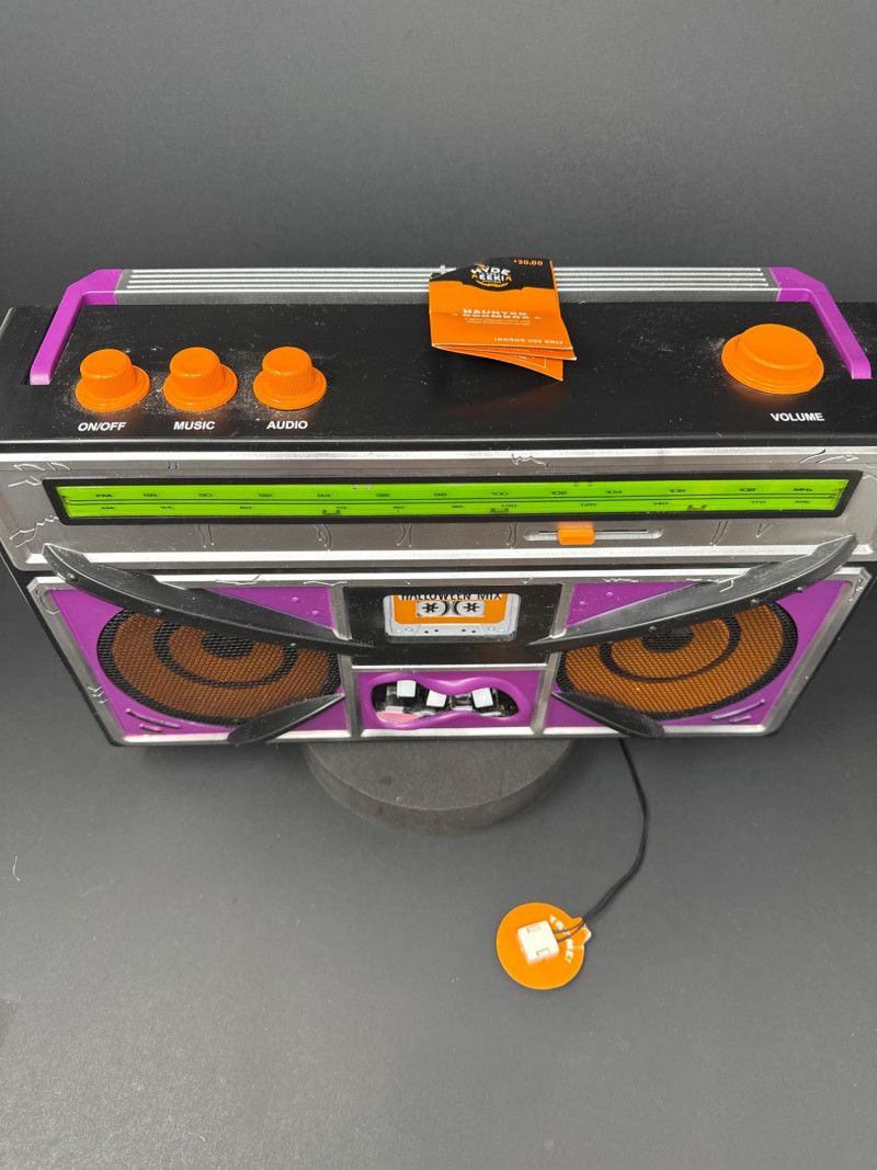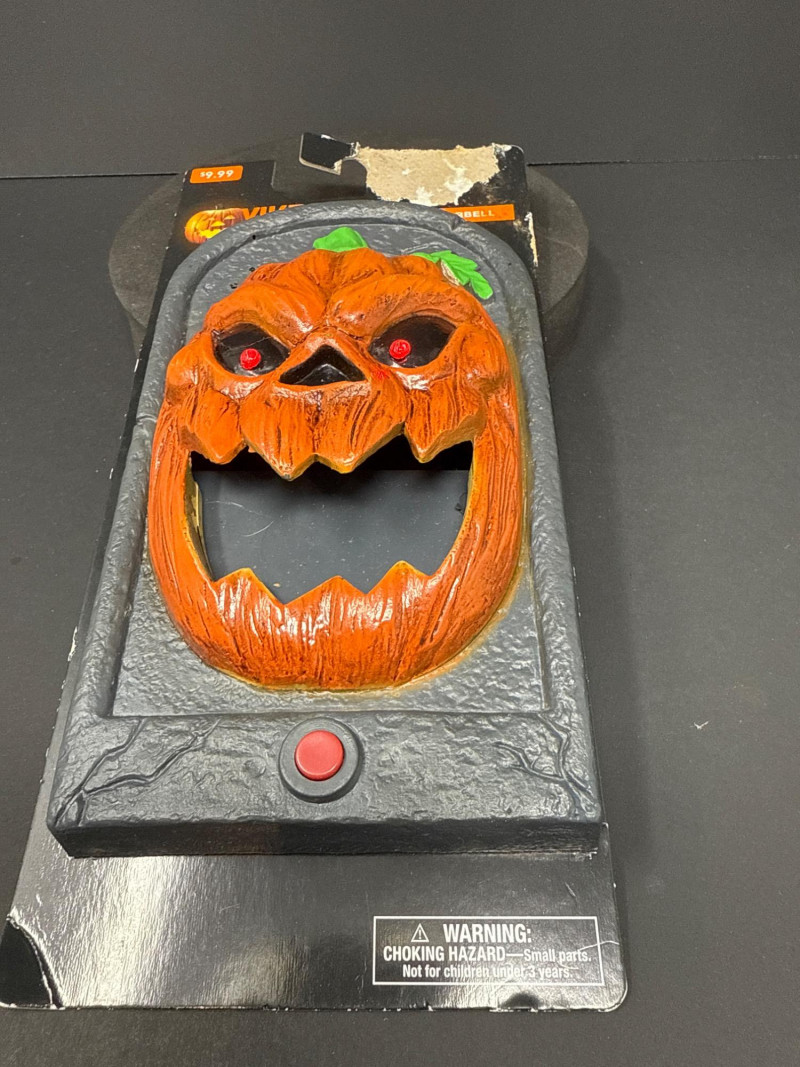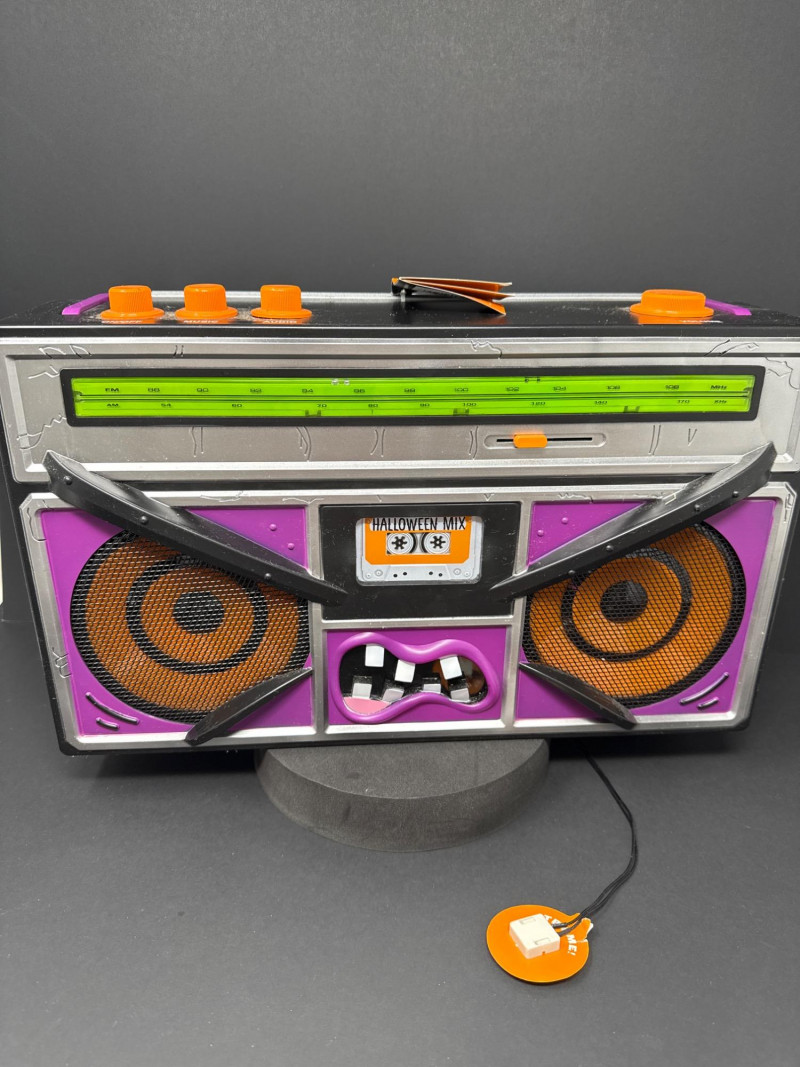 A fun and spooky animated Halloween décor set featuring a Gemmy “Monster Mix” Haunted Boombox and a Spooky Village Talking Pumpkin Doorbell. Both tested and working, these animated props bring light, sound, and motion to your Halloween display. The boombox lights up and plays spooky dialogue, while the pumpkin doorbell glows, growls, and extends its tongue when pressed — perfect for a festive haunted ambiance. Gemmy “Monster Mix” Haunted Boombox Brand: Gemmy Industries Date: Circa 2010s Dimensions: Approx. 15" W × 9" H Function: Animated Halloween prop only – not a functional boombox or music player. Produces spooky sound effects and dialogue. Design: Retro “Monster Mix” radio with orange knobs, green display, and expressive monster face design Power: Battery operated (batteries not included) Condition: Tested and working Spooky Village Talking Pumpkin Doorbell Brand: Spooky Village / Yikes! / Target “Hyde & Eek! Boutique” line Date: Circa 2000s–2010s Dimensions: Approx. 8" H × 5" W Function: Eyes light up, plays eerie sounds, tongue extends when activated Design: Sculpted jack-o’-lantern face on faux stone backing with red LED eyes Power: Battery operated (batteries not included) Condition: Tested and working Item Details: