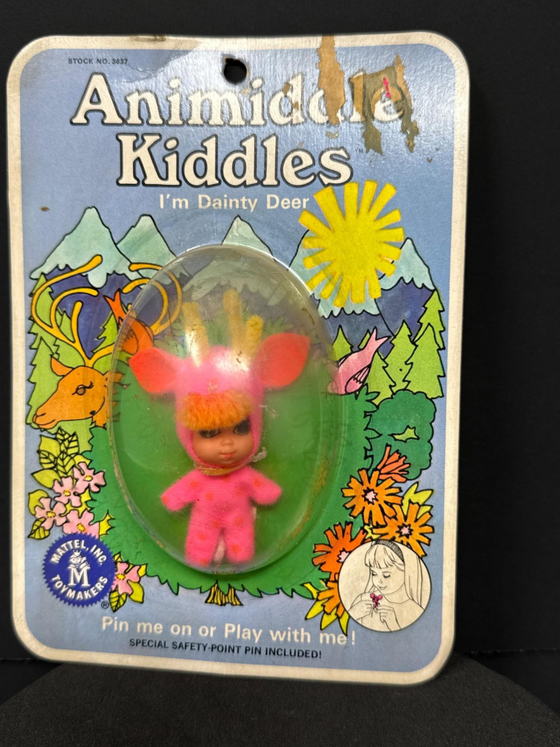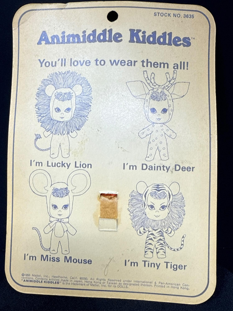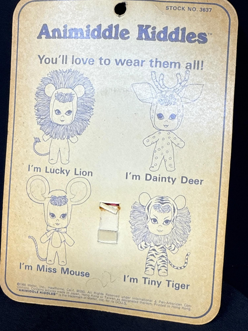 A charming pair of original Animiddle Kiddles dolls by Mattel, released in 1968 as part of the beloved Liddle Kiddlesspin-off series. Each tiny figure is dressed in a fuzzy animal costume and comes mounted on its original illustrated card, still enclosed under the clear dome packaging. The set includes “I’m Lucky Lion” (yellow suit with orange mane) and “I’m Dainty Deer” (pink suit with antlers and orange hair). These whimsical figures were marketed as both wearable pins and collectible mini-dolls—“Pin me on or play with me!”—and include the special safety-point pin inside. Both cards show vibrant mid-century graphics featuring forest and jungle animals, along with the Mattel Toymakers logo. Some age-appropriate wear is present: light creasing, edge wear, minor discoloration, and small areas of paper lift near the punch holes from old price sticker removal. Clear domes remain intact, and dolls appear unused within their original bubbles. Item Details: Maker: Mattel, Inc. Toymakers Series: Animiddle Kiddles (part of the Liddle Kiddles line) Year: 1968 Models Included: “I’m Lucky Lion” (Stock No. 3635) “I’m Dainty Deer” (Stock No. 3637) Materials: Plastic dolls with flocked fabric costumes, mounted on illustrated cardstock with clear blister dome Packaging: Factory sealed; original card backs feature lineup of the four series characters — Lucky Lion, Dainty Deer, Miss Mouse, and Tiny Tiger Origin: Printed in Hong Kong (as marked) Dimensions (each): Card approx. 8" H × 5.5" W