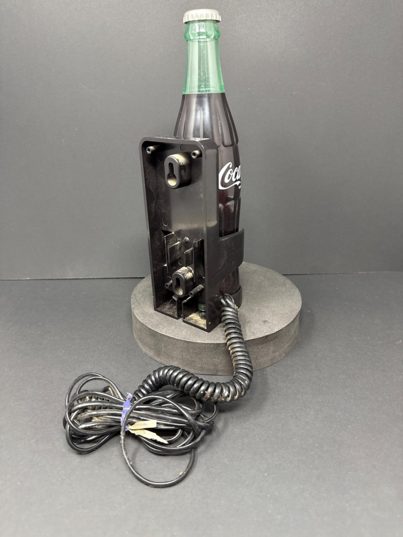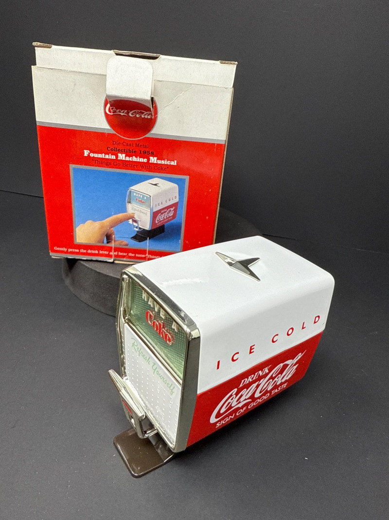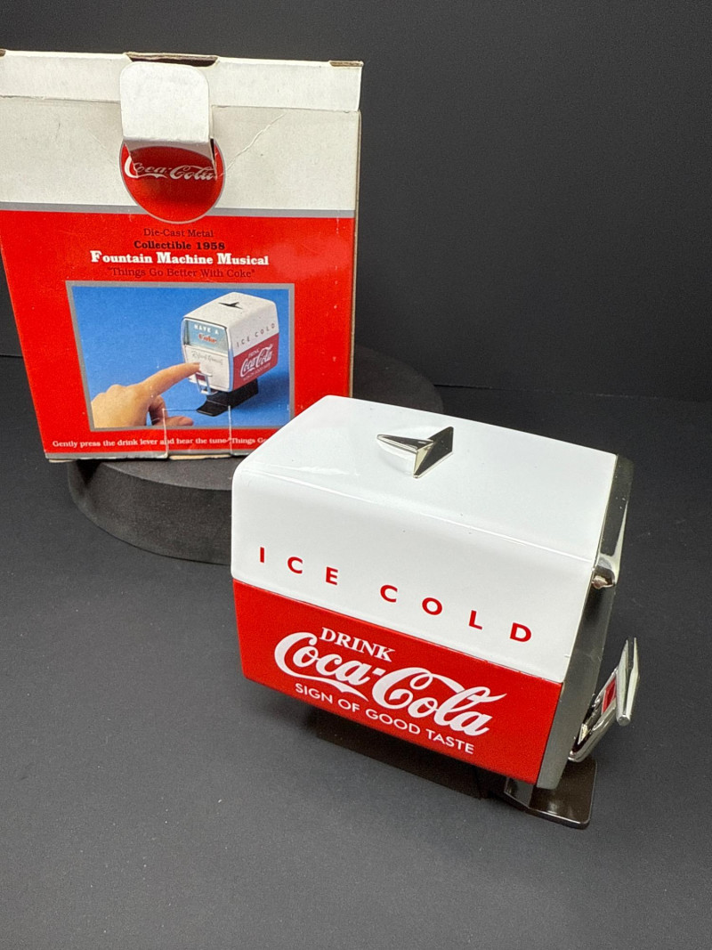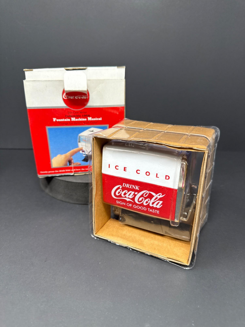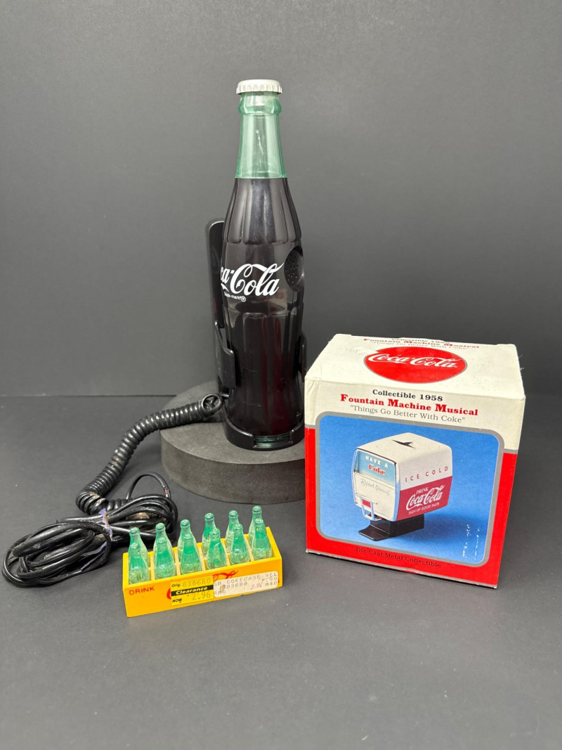 A nostalgic trio of Coca-Cola collectibles capturing decades of classic American design. This set includes a 1983 Coca-Cola Bottle Telephone, a 1997 Die-Cast Musical Fountain Machine, and a Miniature Coca-Cola Bottle Crate. Together, they celebrate the evolution of Coca-Cola advertising—from mid-century novelty craftsmanship to modern die-cast keepsakes—embodying the charm and timelessness of America’s favorite beverage brand. Coca-Cola Bottle Telephone Coca-Cola Fountain Machine Musical Box Miniature Coca-Cola Bottle Crate Please note – these toys have not been tested, therefore we do not know the working condition. Most of the toys have never been out of the box and most packaging is intact. We do NOT guarantee these toys nor will we give refunds.Item Details: