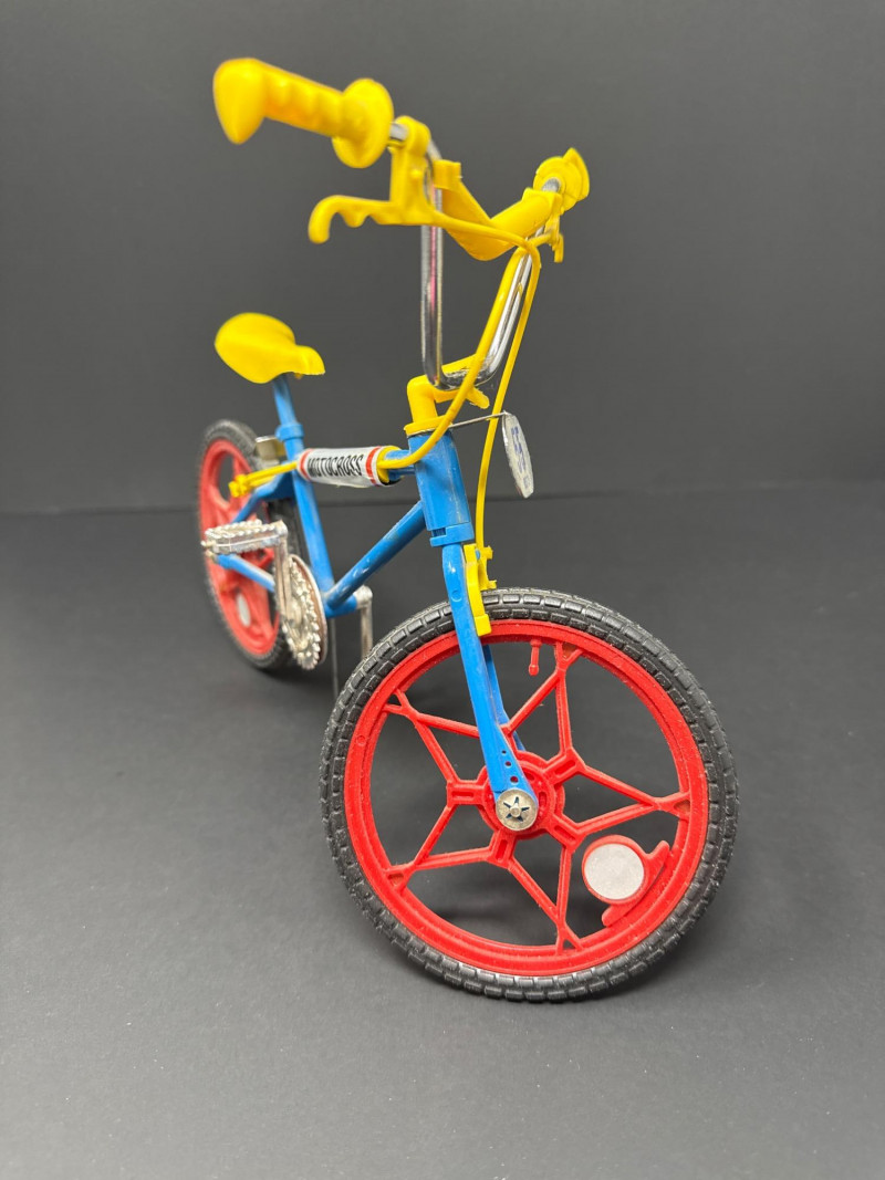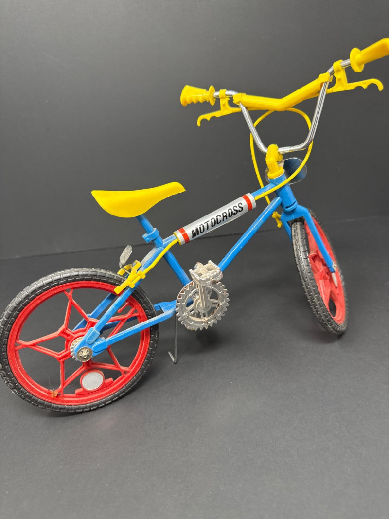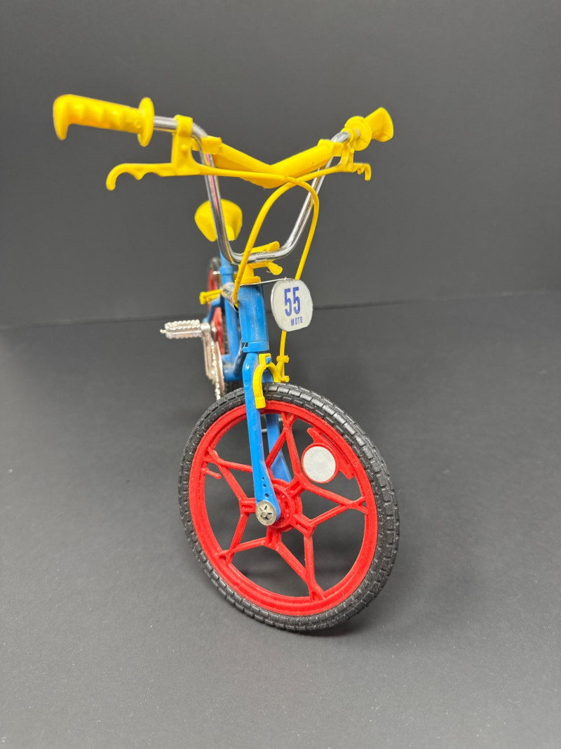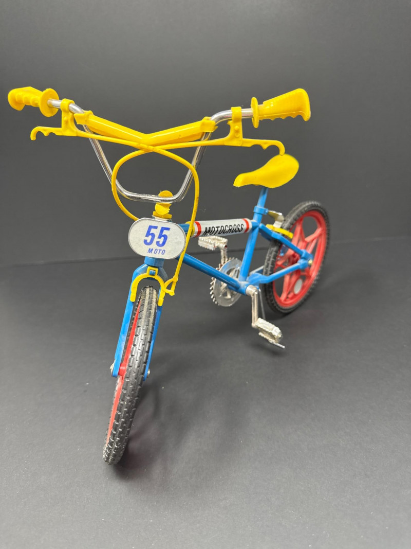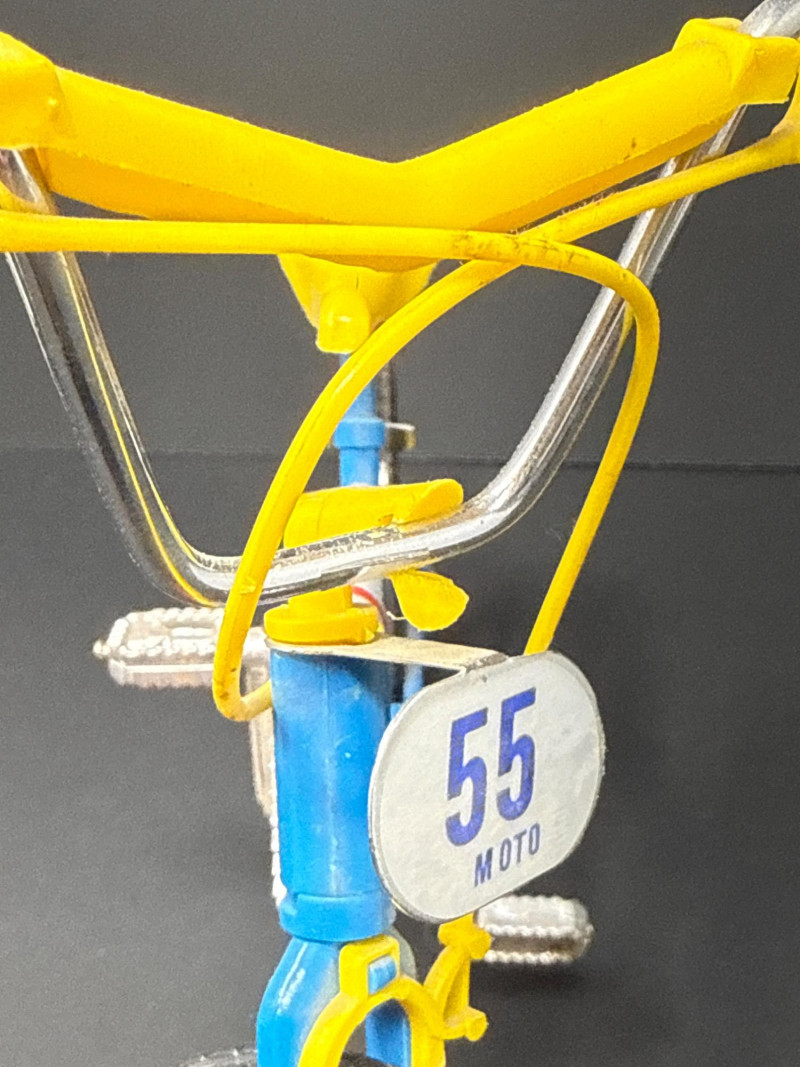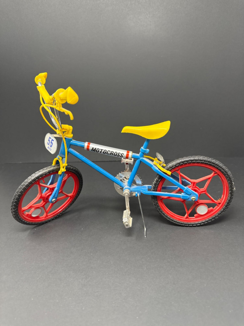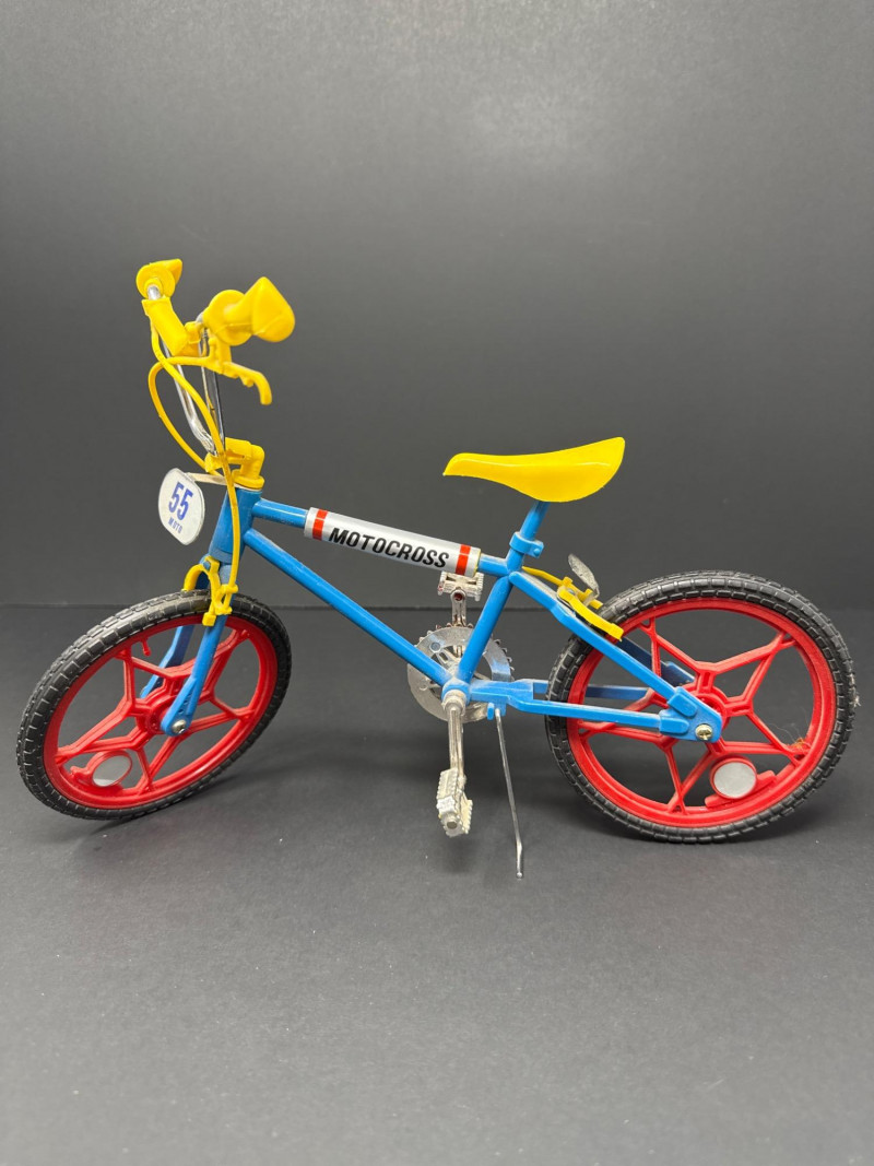 A colorful vintage Motocross BMX miniature bicycle model, showcasing a sporty blue frame with bright yellow handlebars and seat, and red five-spoke wheels. The model features chrome details, rubber tires, and a front number plate marked “55 MOTO.” It captures the classic 1980s BMX style with realistic pedals, kickstand, and gear detailing—perfect for display or nostalgic collections. Item Details: Color Scheme: Blue frame, yellow seat and grips, red wheels Markings: “MOTOCROSS” decal on frame; front plate “55 MOTO” Construction: Metal and plastic with rubber tires Dimensions: Approximately 11 in (L) × 9 in (H) Condition: A small piece by the handlebar is broken and needs repair; otherwise in good vintage display condition