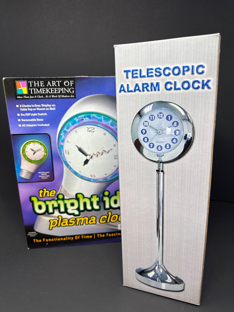 Lot # 95 - “Bright Idea” Plasma Clock & Telescopic Chrome Alarm Clock