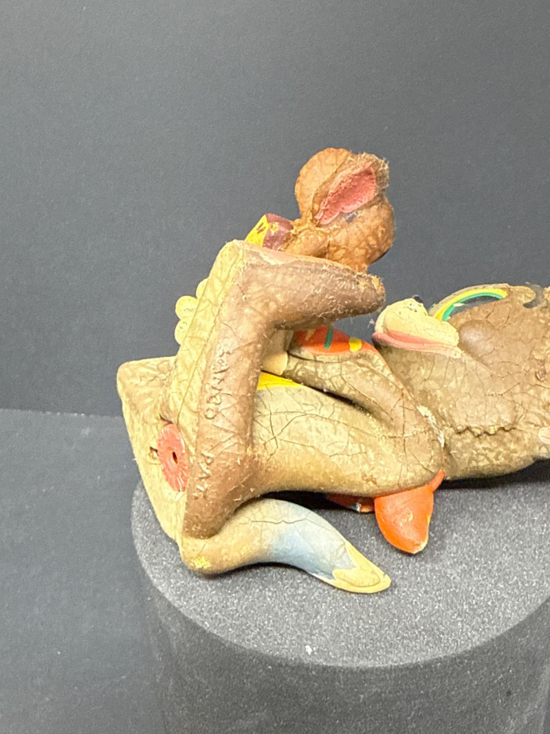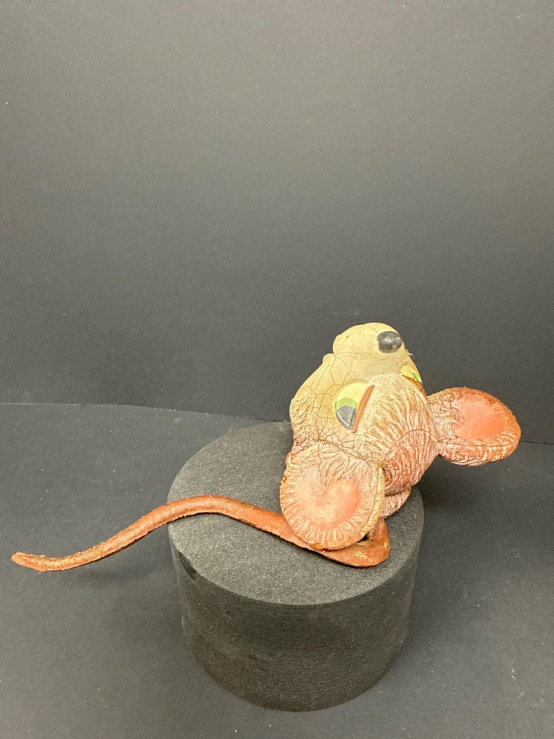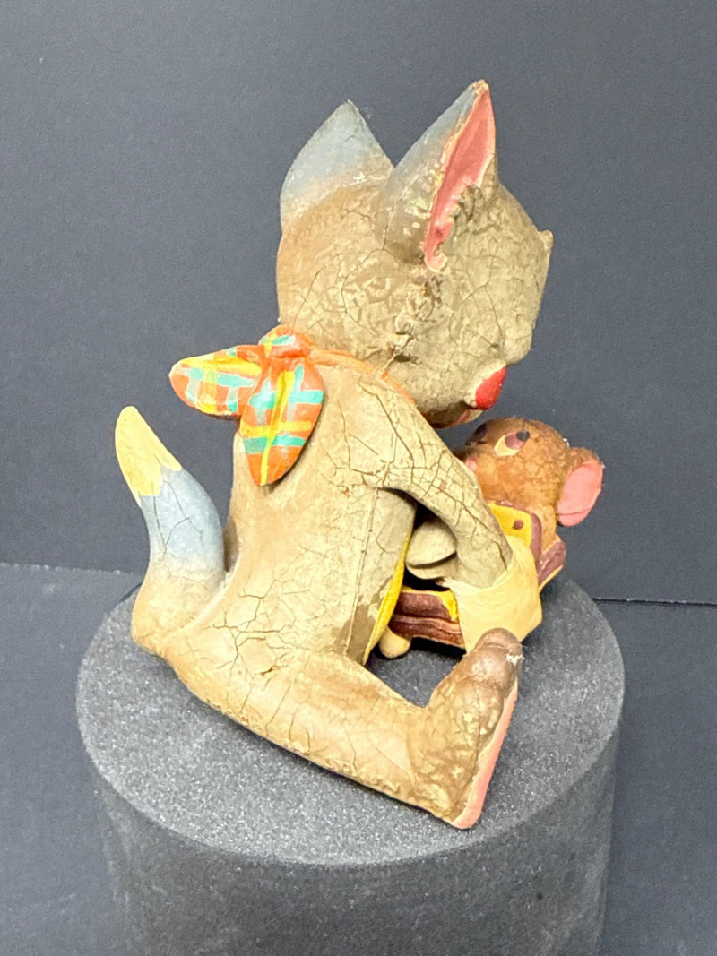Pair of vintage rubber squeak toys by Lanco Toys, Spain, featuring a mischievous cat in a plaid bib with a small mouse companion, and a separate smiling mouse figure with long tail. Both are hand-painted in warm tones with expressive mid-century charm. Made of soft rubber with built-in squeakers typical of Lanco’s playful toy designs. Item Details: Maker: Lanco Toys Origin: Made in Spain Material: Hand-painted rubber Type: Squeak toys Approx. Size: 3"–3.5" tall Condition: Toys have wear consistent with age; some surface cracking and paint loss present. Squeakers untested. Collecting Note: