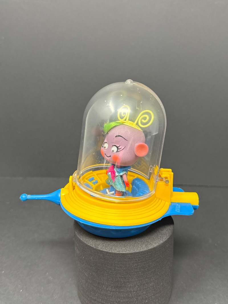 Charming 1969 Mattel Kozmic Kiddle toy featuring a colorful alien-style character inside a bright yellow and blue UFO capsule. The clear dome opens to reveal a whimsical figure with purple skin, green hair, spiral yellow antennae, and a shiny multicolor outfit. The molded interior includes control details and a pilot’s seat. A playful example of Mattel’s late-1960s fascination with futuristic and space-age themes, the Kozmic Kiddles line remains a favorite among collectors for its imaginative design and vibrant color palette. Item Details: Maker: Mattel Inc. Line: Liddle Kiddles – Kozmic Kiddles Series Year: 1969 (stamped) Material: Plastic with fabric accents Color: Yellow, blue, multicolor Origin: Made in Hong Kong Size: Approx. 4” tall (including dome) Condition: Light general wear; minor surface marks consistent with age. No box included. Markings: “©1969 Mattel Inc. / Hong Kong / U.S. and For. Pat. Pend.”