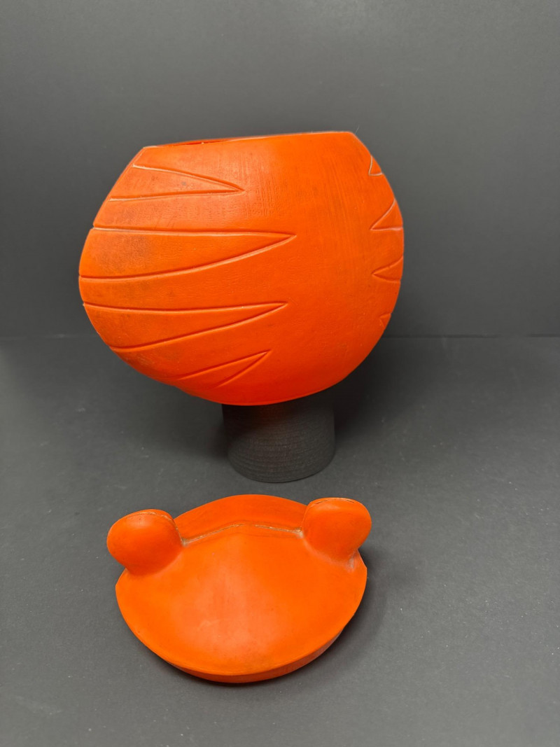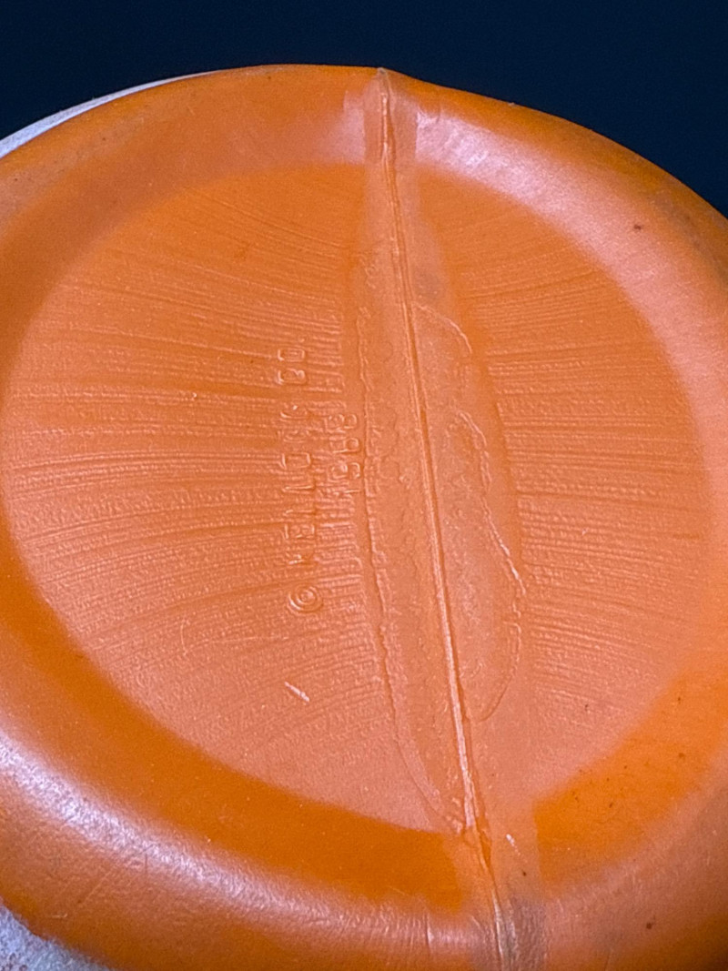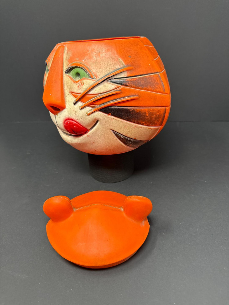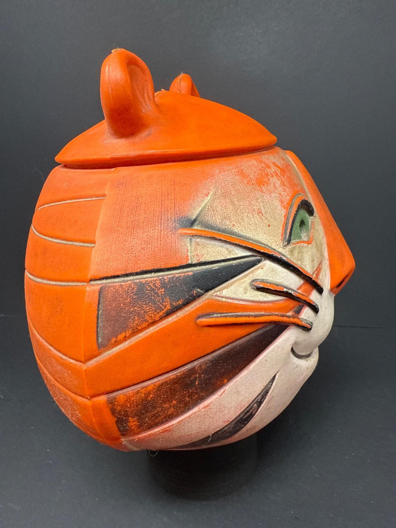 A rare 1968 Kellogg’s Tony the Tiger cookie jar, produced as an advertising premium and promotional collectible. Crafted from molded rubber, the jar captures Tony’s iconic smiling face with bright orange and cream tones, green eyes, black stripes, and his signature red tongue. The removable lid features rounded tiger ears, revealing a hollow interior originally designed to hold cookies or treats. Item Details: Maker: Kellogg Co. (Marked © Kellogg Co. 1968) Character: Tony the Tiger Date: 1968 Origin: Likely produced under license in Spain or Europe Material: Molded rubber Dimensions: Approx. 6.5" H × 6" W Color: Orange, cream, black, green, and red details Markings: © KELLOGG CO. 1968 (embossed on base) Condition: Good vintage condition; mild surface wear and light color fading consistent with age. No cracks or structural damage. Lid fits well. Collecting Note: