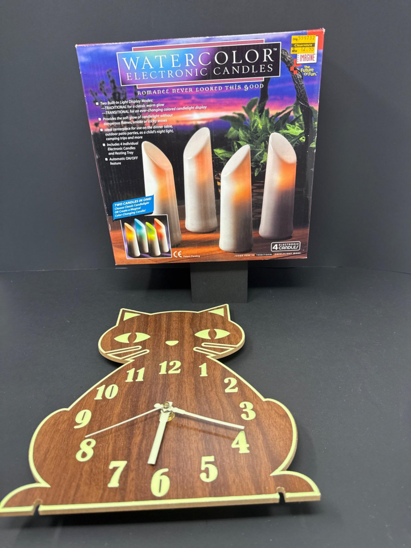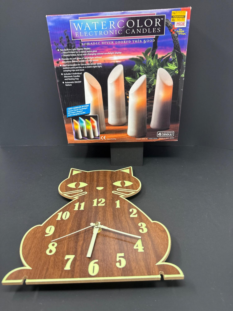 The cat clock brings a touch of retro charm with its faux woodgrain finish and glowing numerals, while the flameless candle set provides a safe, elegant ambiance with color-changing or traditional warm light modes.