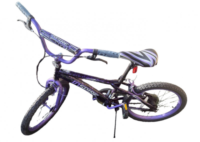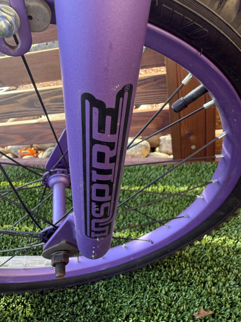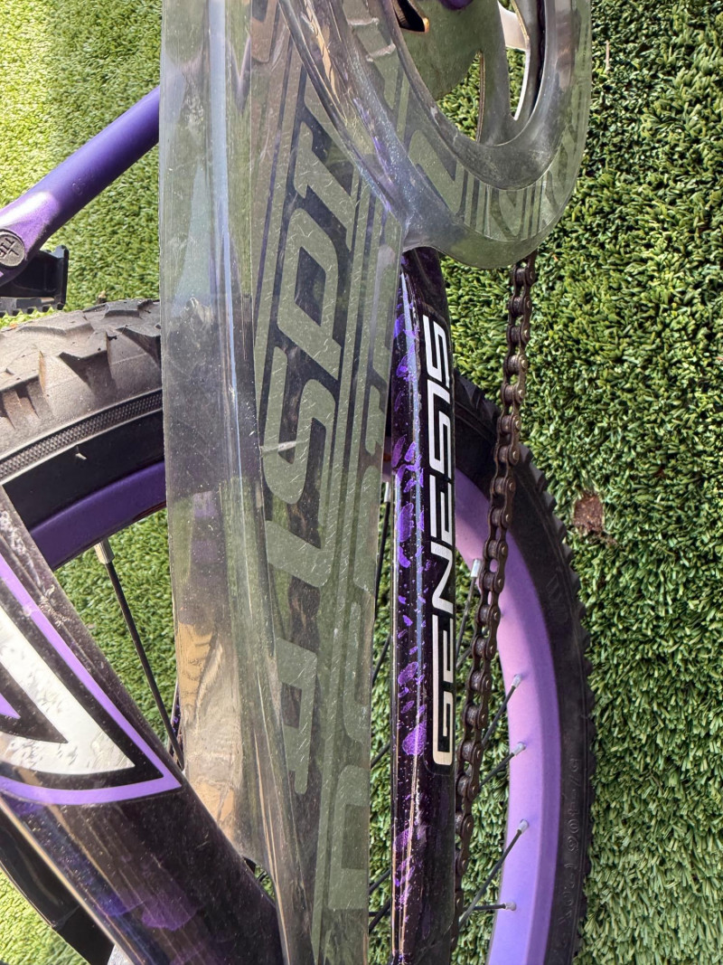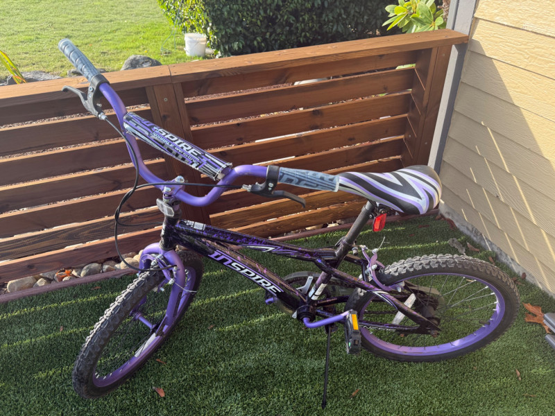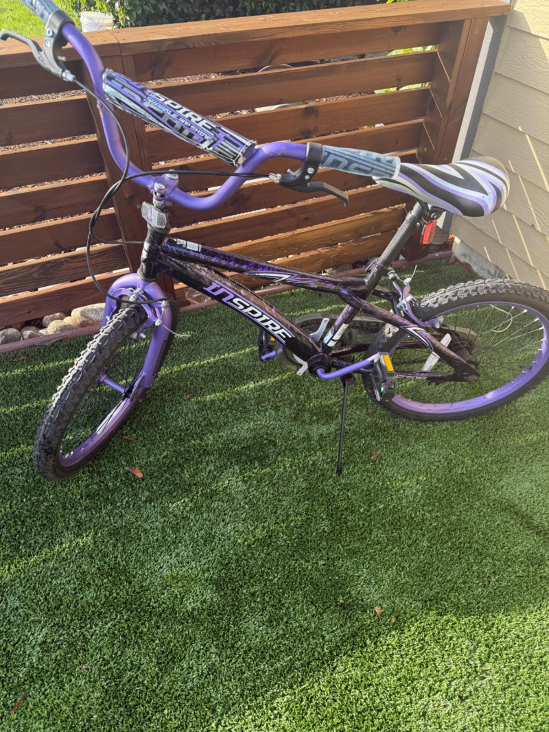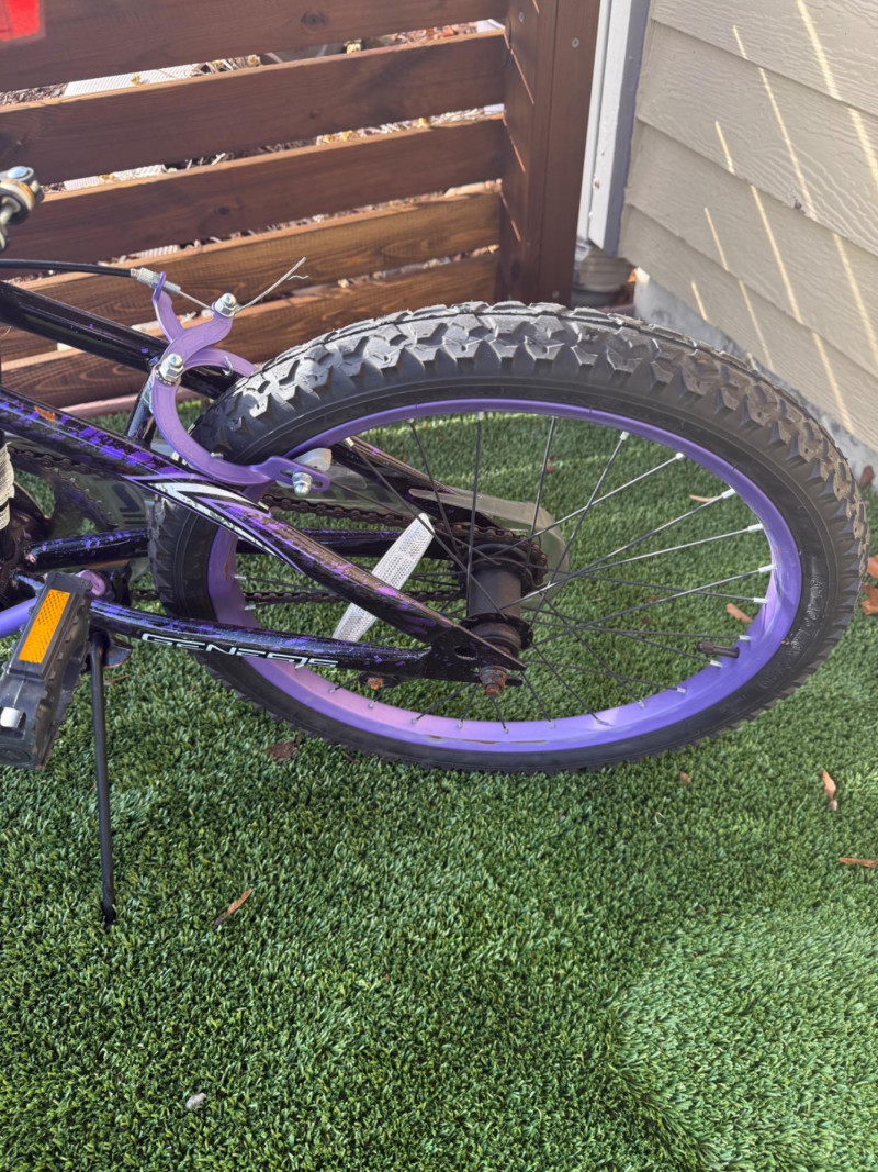 Sporty and stylish, this Genesis Inspire 20-inch bicycle features a bold purple and black finish with matching graphics on the frame, fork, and handlebar pad. Designed for young riders or BMX enthusiasts, it includes a durable steel frame, front and rear hand brakes, and a comfortable padded seat with a coordinating striped design. The bike shows signs of light wear and some scuffs to the paint, particularly near the handlebar area, but remains in good overall condition for everyday riding or casual recreation. Item Details: Model: Genesis Inspire Model No.: 8112-70TJ (20" G Inspire) Frame Size: 20-inch Color: Purple with black and silver graphics Brakes: Front and rear hand brakes Tires: 20" all-terrain tread Condition: Used Notable Features: Coordinated color design, BMX-style handlebars with pad set, kickstand included