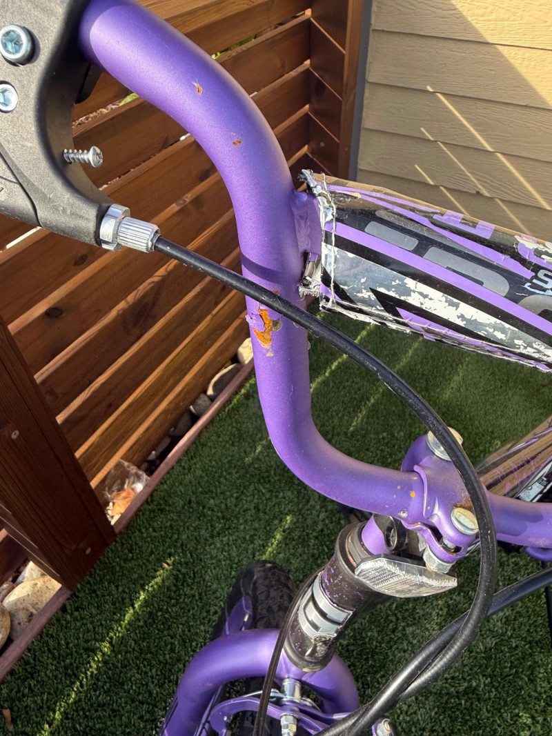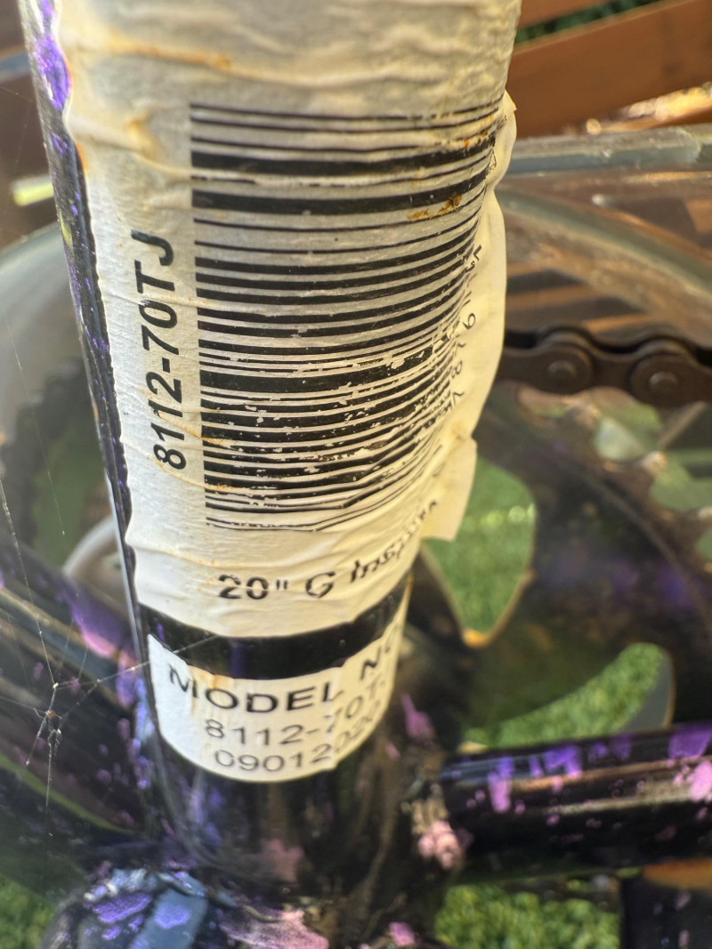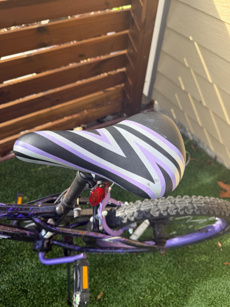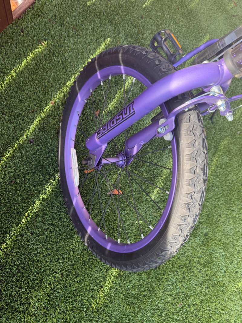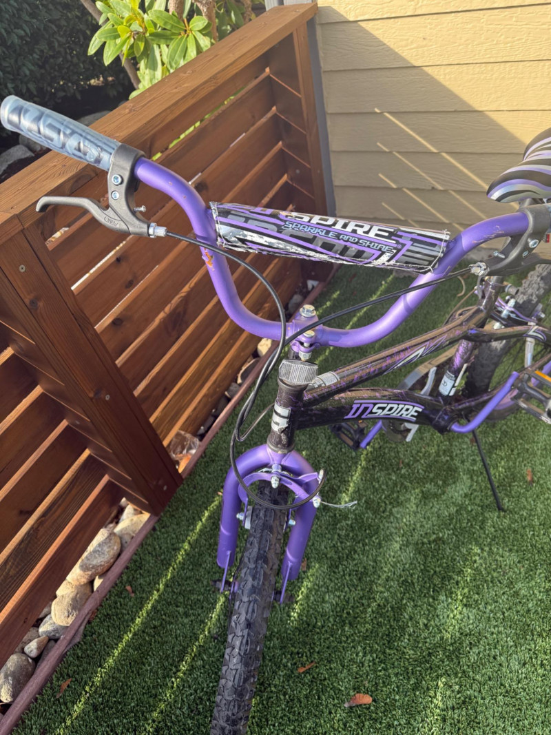 Sporty and stylish, this Genesis Inspire 20-inch bicycle features a bold purple and black finish with matching graphics on the frame, fork, and handlebar pad. Designed for young riders or BMX enthusiasts, it includes a durable steel frame, front and rear hand brakes, and a comfortable padded seat with a coordinating striped design. The bike shows signs of light wear and some scuffs to the paint, particularly near the handlebar area, but remains in good overall condition for everyday riding or casual recreation. Item Details: Model: Genesis Inspire Model No.: 8112-70TJ (20" G Inspire) Frame Size: 20-inch Color: Purple with black and silver graphics Brakes: Front and rear hand brakes Tires: 20" all-terrain tread Condition: Used Notable Features: Coordinated color design, BMX-style handlebars with pad set, kickstand included