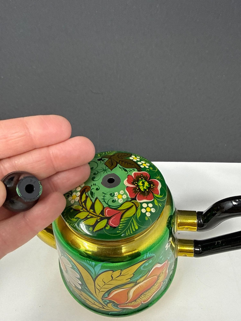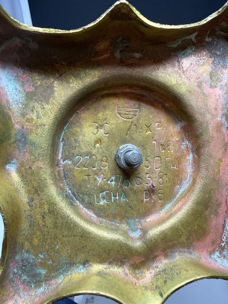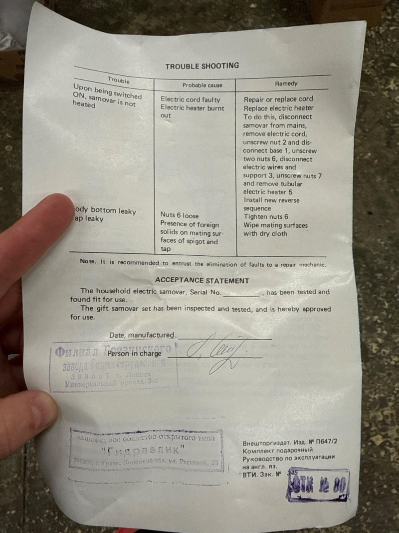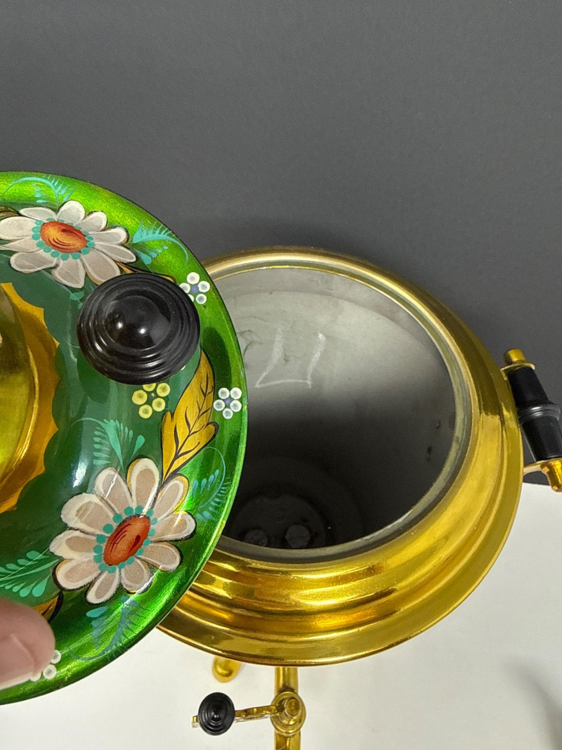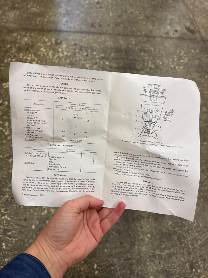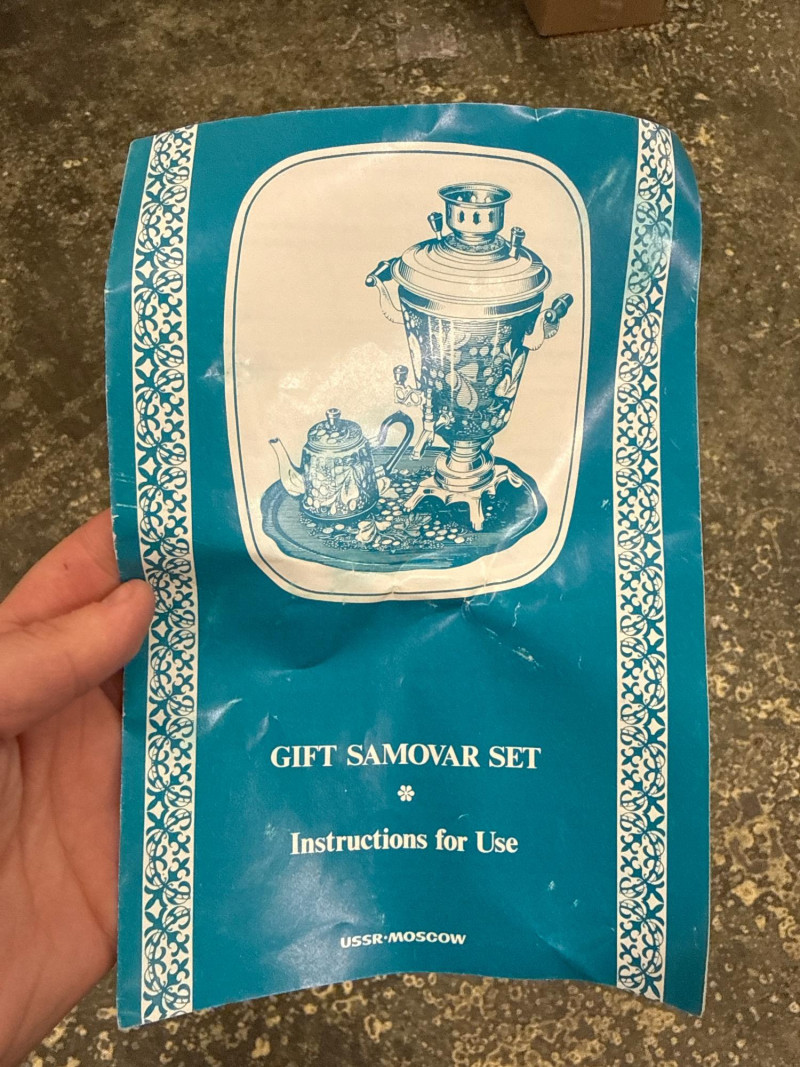 Vintage Gift Samovar Set- USSR Includes the original paperwork. (no tray) Larger unit has two spouts. The smaller pitcher needs to have the top ball piece reattached (missing screw). What is a Samovar? A samovar is a metal urn, often ornately decorated, used to heat and boil water for tea. The Russian name "samovar" means "self-boiler". Traditionally, they use a central pipe fueled by charcoal or wood, with a tap at the base to dispense hot water. The hot water is used to dilute a strong tea concentrate, called zavarka, which is brewed in a smaller teapot placed on top.