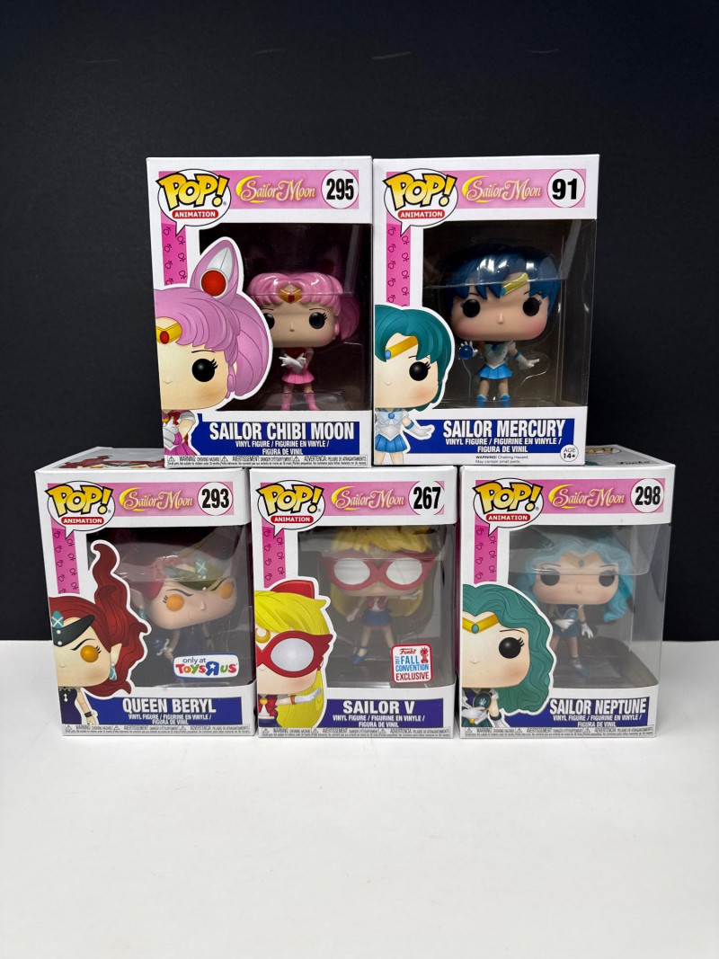 Funko Pop! SAILOR MOON Figurines- #91 Sailor Mercury #267 Sailor V #293 Queen Beryl #295 Sailor Chibi Moon #298 Sailor Neptune All appear to be unopened, new in box