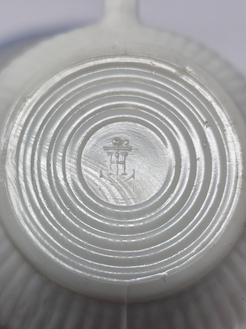 A set of five vintage Anchor Hocking “Alice” pattern teacups with matching saucers in light blue Depression glass. Each piece features a delicately embossed floral motif around the rim, with scalloped edges and a translucent pastel hue that captures light beautifully. Produced in the early 1940s, this pattern is prized for its romantic styling and collectible appeal. Details: Maker: Anchor Hocking Glass Co. Pattern: Alice Color: Light blue Era: 1940–1945 Material: Pressed Depression glass Quantity: 5 teacups, 5 saucers Dimensions (approx.): Teacups: 2.5" H × 3.5" W Saucers: 5.75" diameter Condition: Excellent vintage condition. No chips, cracks, or clouding. Light shelf wear on base consistent with age. Highlights: Highly collectible Depression glass pattern Matching set with consistent color and clarity Ideal for vintage table settings, display, or resale Unmarked, as typical for this pattern and era Auction Notes: