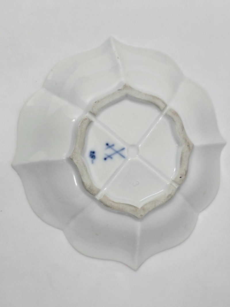 A classic duo from Meissen’s renowned Blue Onion collection, featuring: Two teacups with scalloped rims and hand-painted cobalt floral motifs Two matching saucers with fluted edges and central blue medallions Each piece is crafted in fine white porcelain and bears the Meissen crossed swords mark in underglaze blue, confirming its authenticity and origin. The Blue Onion pattern, inspired by East Asian designs and refined in 18th-century Germany, remains one of Meissen’s most iconic and enduring styles. Condition: Excellent vintage condition. No chips, cracks, or repairs noted. Underside marks are clear and intact. Dimensions (approx.): Teacups: 2.25" H × 3.5" W Saucers: 5.5" diameter An elegant set for collectors, display, or refined tea service.