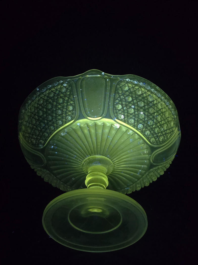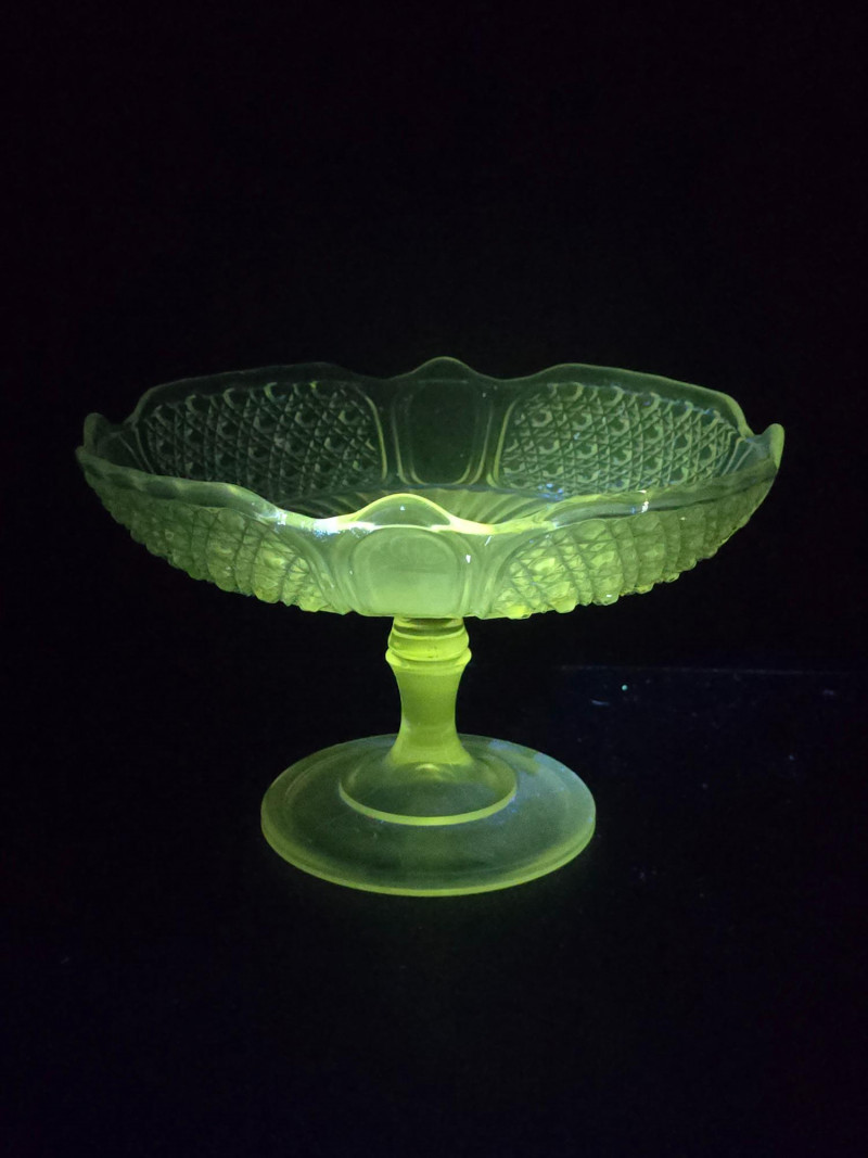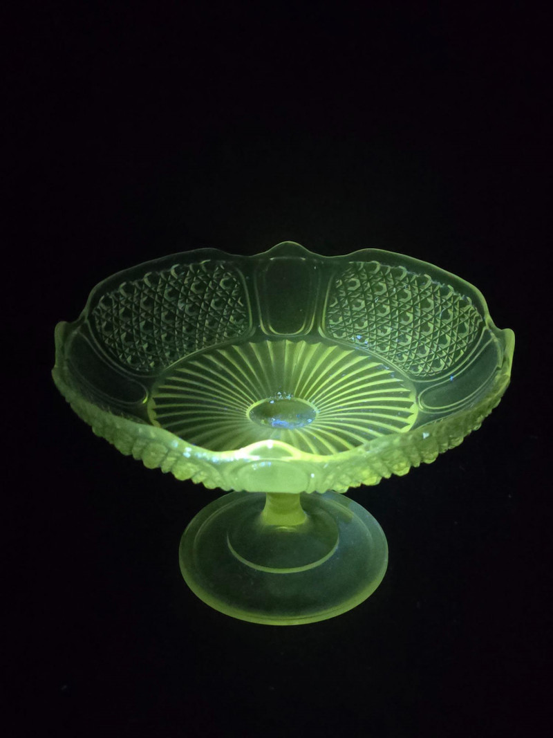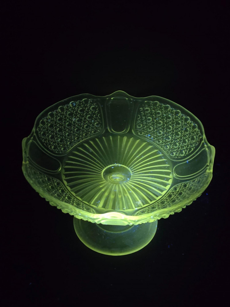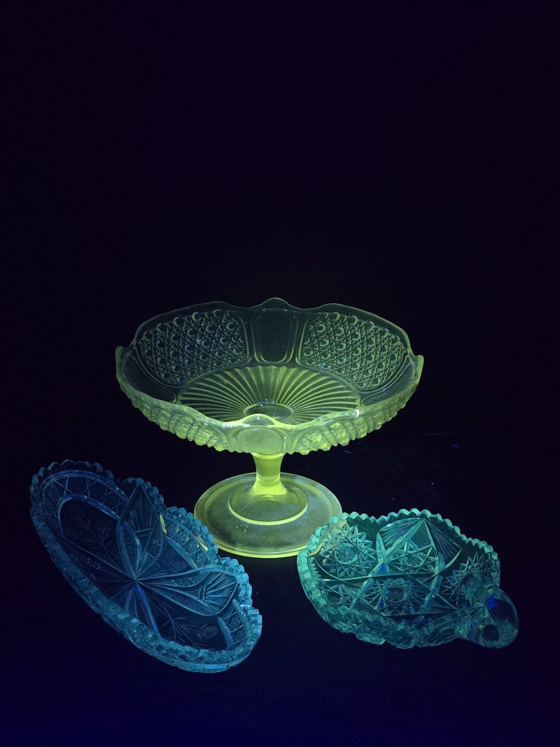 Lot # 108 - Vintage Uranium Glass Trio– UV Reactive Pedestal Dish & Serving Pieces