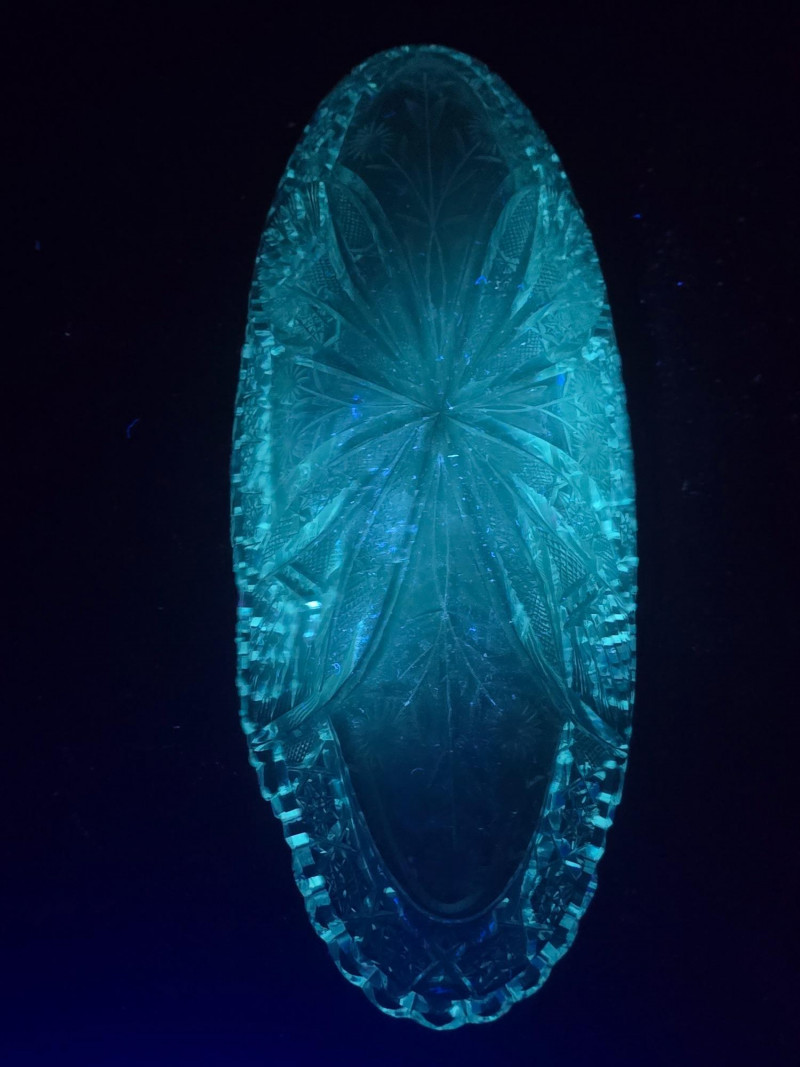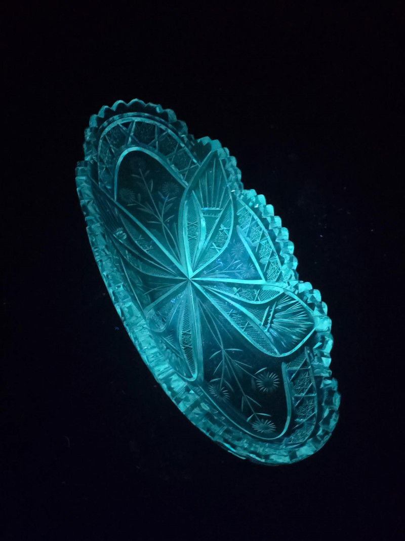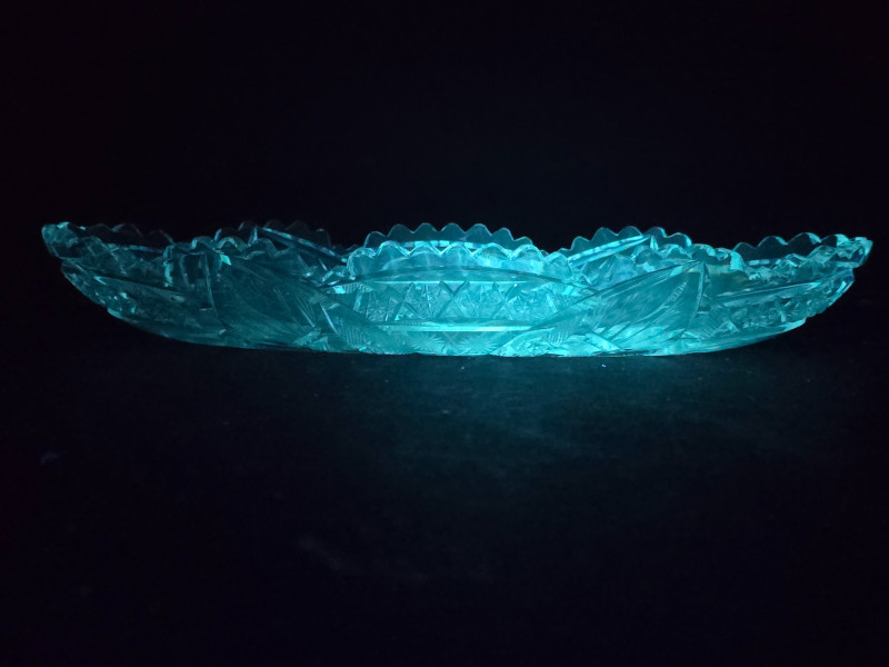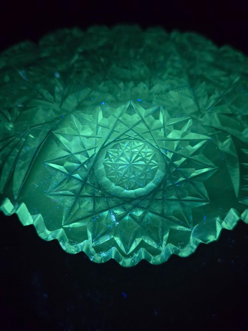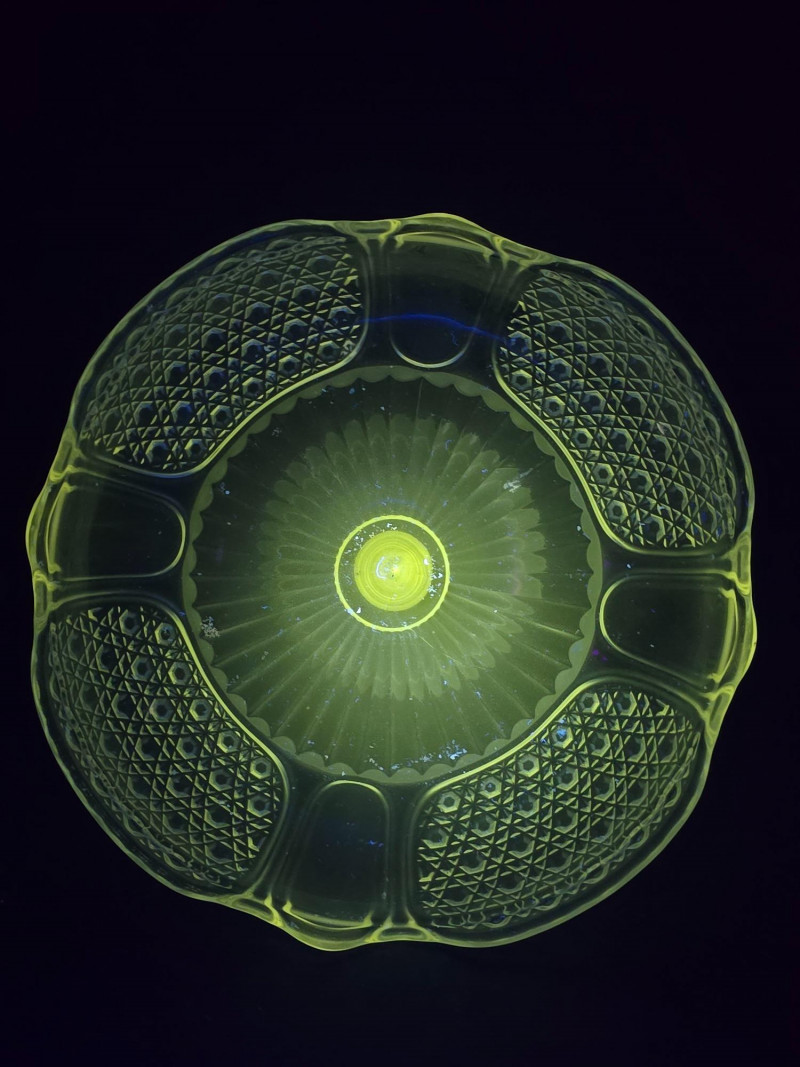 Matching in style and fluorescence, this dish complements the set with its elaborate design and soft green-blue UV response. Condition:
