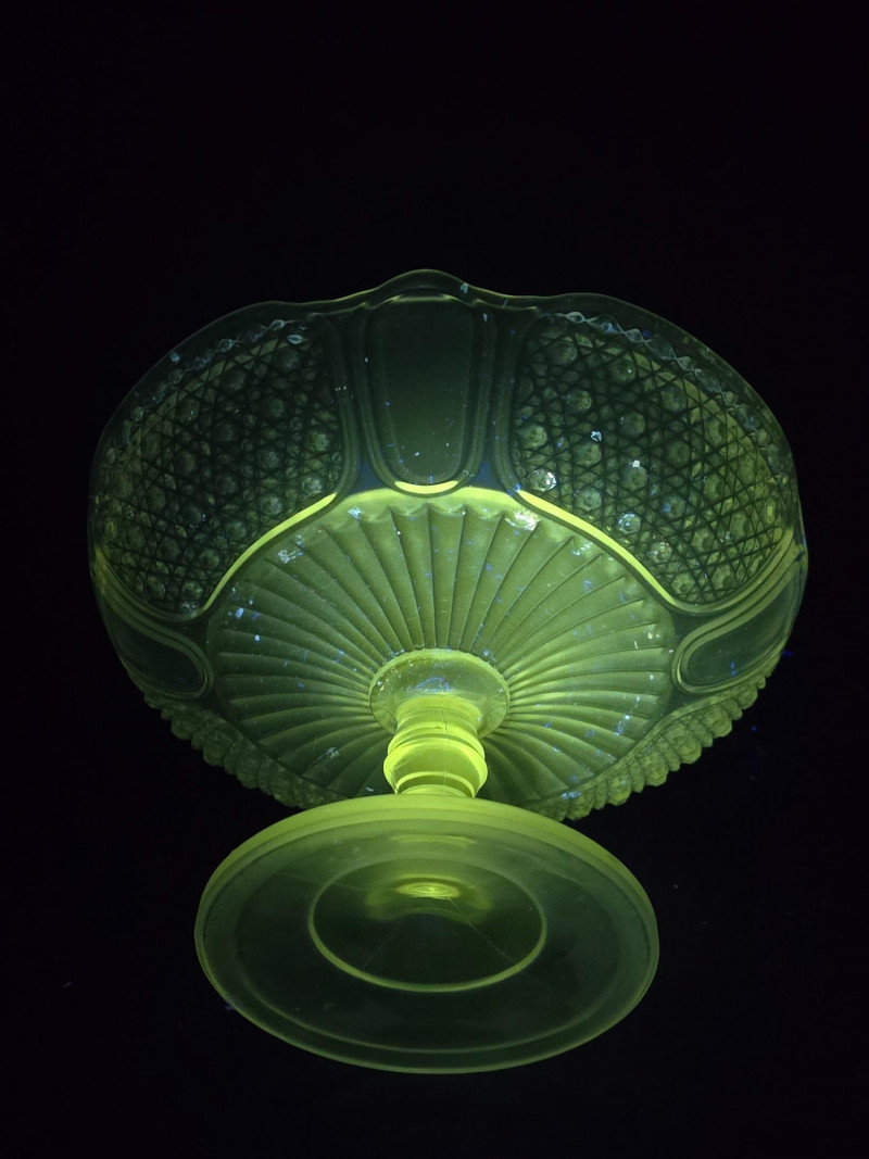 Best showcased under UV lighting to highlight the reactive glow. A captivating addition to any glassware collection or vintage-themed interior.