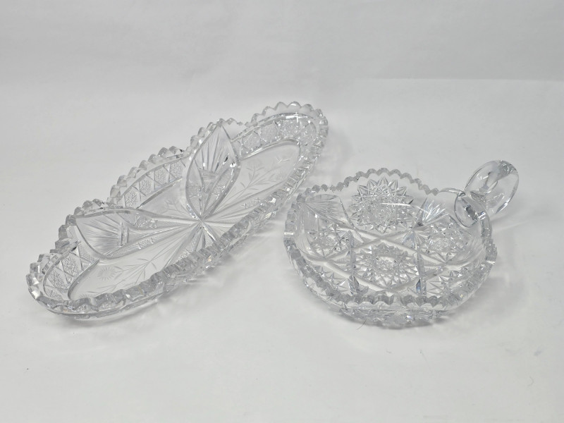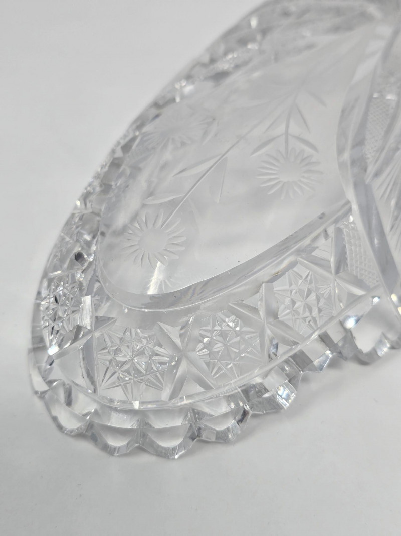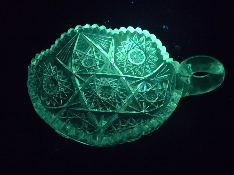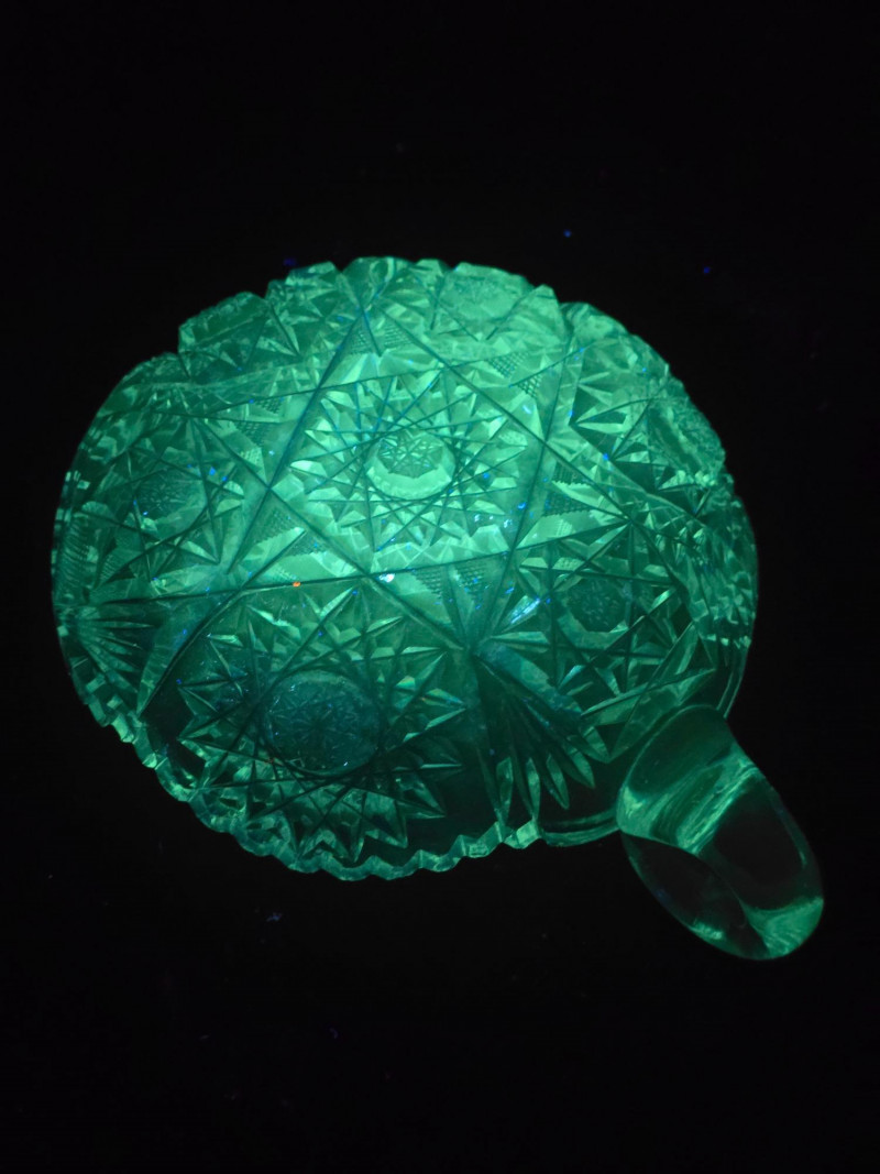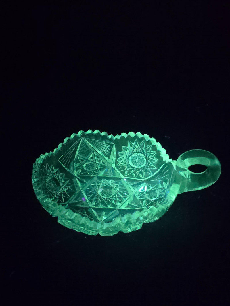 Compact and ornate, this piece features a delicate handle and detailed pressed pattern. Emits a bluish-green glow under UV, enhancing its charm and rarity. Small Patterned Dish: