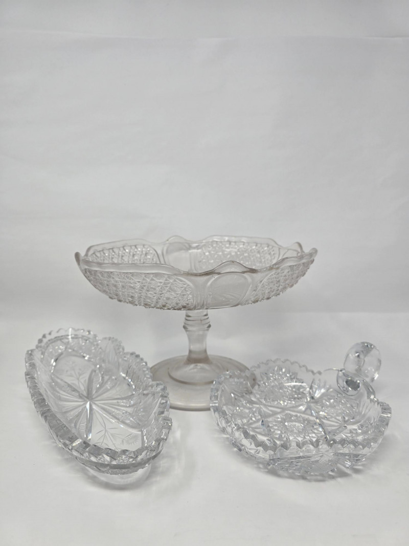 Excellent vintage condition with no chips or cracks. Surface wear consistent with age. Fluorescence verified under UV light. Dimensions (approx.): Pedestal Dish: 6.5" H × 6.75" D Handled Dish: 2.75" H × 4.5" W Small Dish: 1.75" H × 4.25" W Collector Notes: